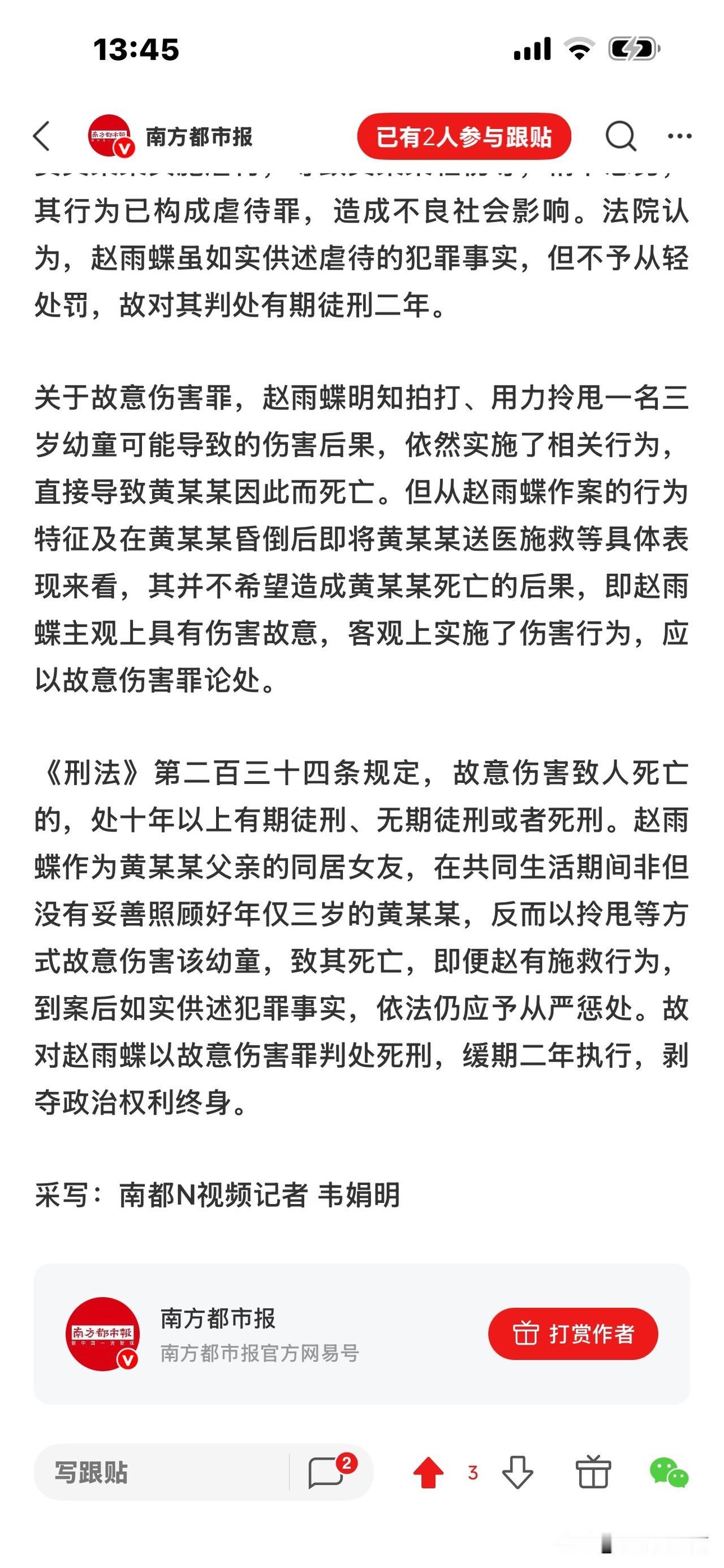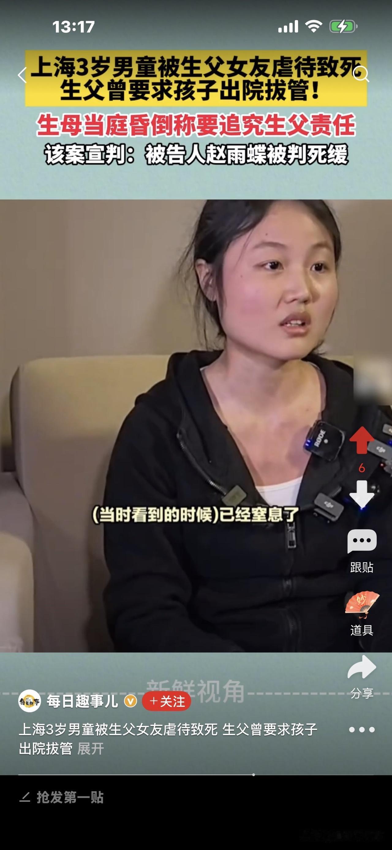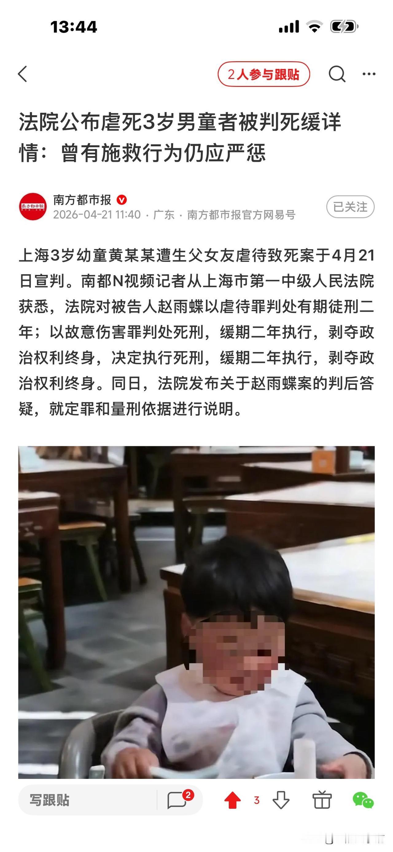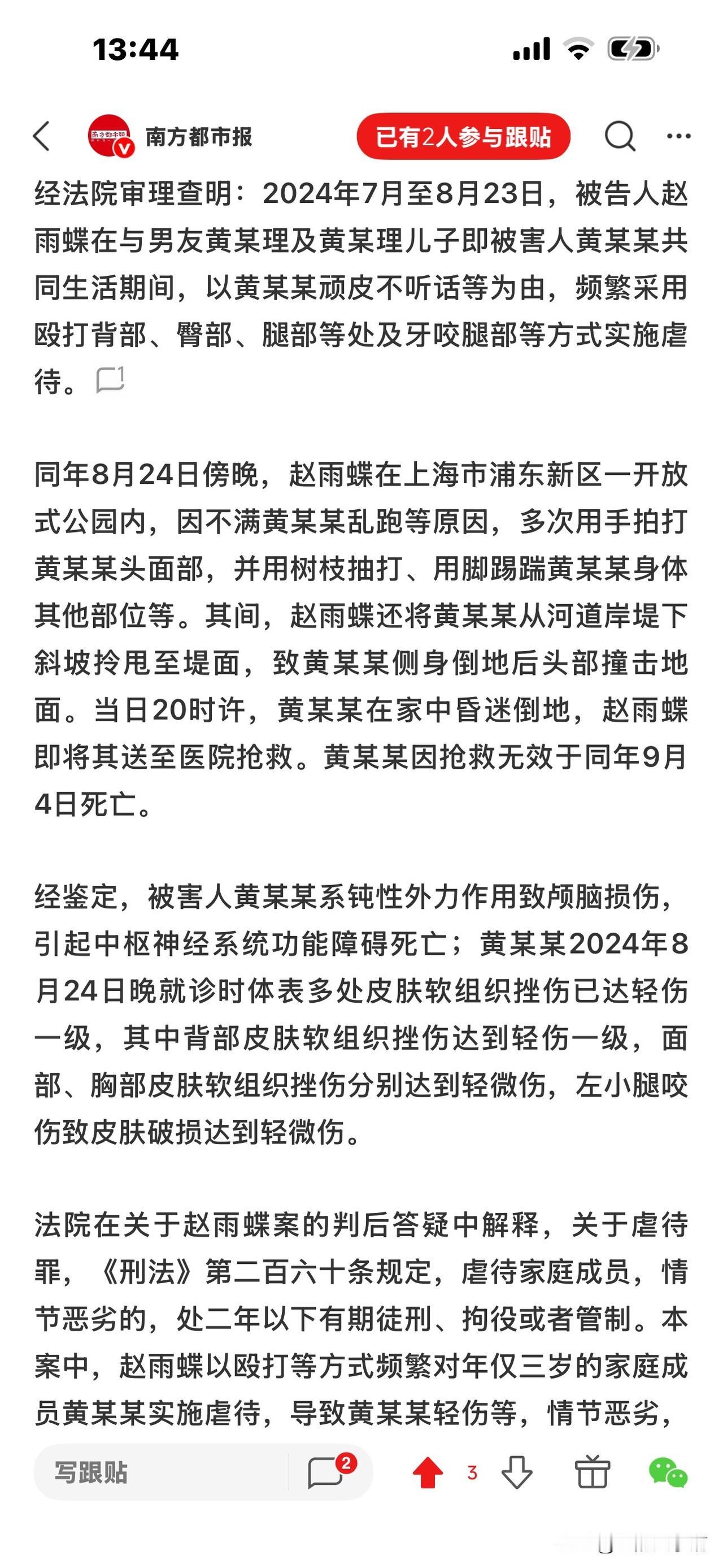 3岁男童被父亲女友虐待致死案! 细节披露:男孩在公园跑,赵雨蝶不满, 在河堤拎摔他,致其头部着地身亡。 生母说了赵雨蝶在公园的的罪恶行径:持续打孩子1小时左右,打后抱摔,之后拖拉,在地上摩擦。 简直惨无人道! 据悉,当时播放了一个小时(应该是公园里的监控视频),生母看见,儿子被前夫女友赵雨蝶先是用各种器具或方式,轮番打他。 多惨呀! 想想一个成年人收拾一个手无寸铁的幼儿,多么轻而易举,占据优势,他要你死就死、要你活就活! 任凭男孩哭泣不止,她冷漠凌厉的表情无动于衷。 赵雨蝶打完还不甘心,又抱起男孩,猛掷地上,完全是往死里收拾。男孩本能地叫喊,喊痛! 赵雨蝶更加生气,抱摔还不解恨,她又拖拽男孩,拿他的小拖鞋抽打他的小脸,把他打得晕头转向,之后,又拿起树枝抽打男孩的身体。 此时,赵雨蝶像疯了一样,完全控制不住自己,最后又一脚猛把男孩踹倒,像拖着一个口袋,攥着在地上摩擦。 此时,男孩已经窒息了,昏死过去,遍体鳞伤,惨不忍睹! 生母说,看到这个视频的时候,脑袋一片嗡嗡响,全身难受,再也控制不住自己,怎么也要让赵雨蝶绳之以法,且认为前夫也有连带责任,把孩子从自己身边带走,却没有好好照顾他。 目前,赵雨蝶被判死缓。 当时问赵雨蝶为什么要打孩子,她说,自己就是控制不住要打。 我们说有爱心的人看见一只蚂蚁,一只小猫小狗都有怜悯心,为何赵雨蝶会对一个幼童恨之入骨,想致他于死地? 她说控制不住要打,完全是理性,任意妄为,只因大人的感情纠葛就够迁怒于一个无辜的孩子,现在她罪有应得,要为她的过失付出代价。 记住,虐待儿童法律是严格的,别想逃脱,别想跑掉,一定要善待我们的下一代,让他们好好成长,因为他们是未来之花! [祈祷][祈祷]