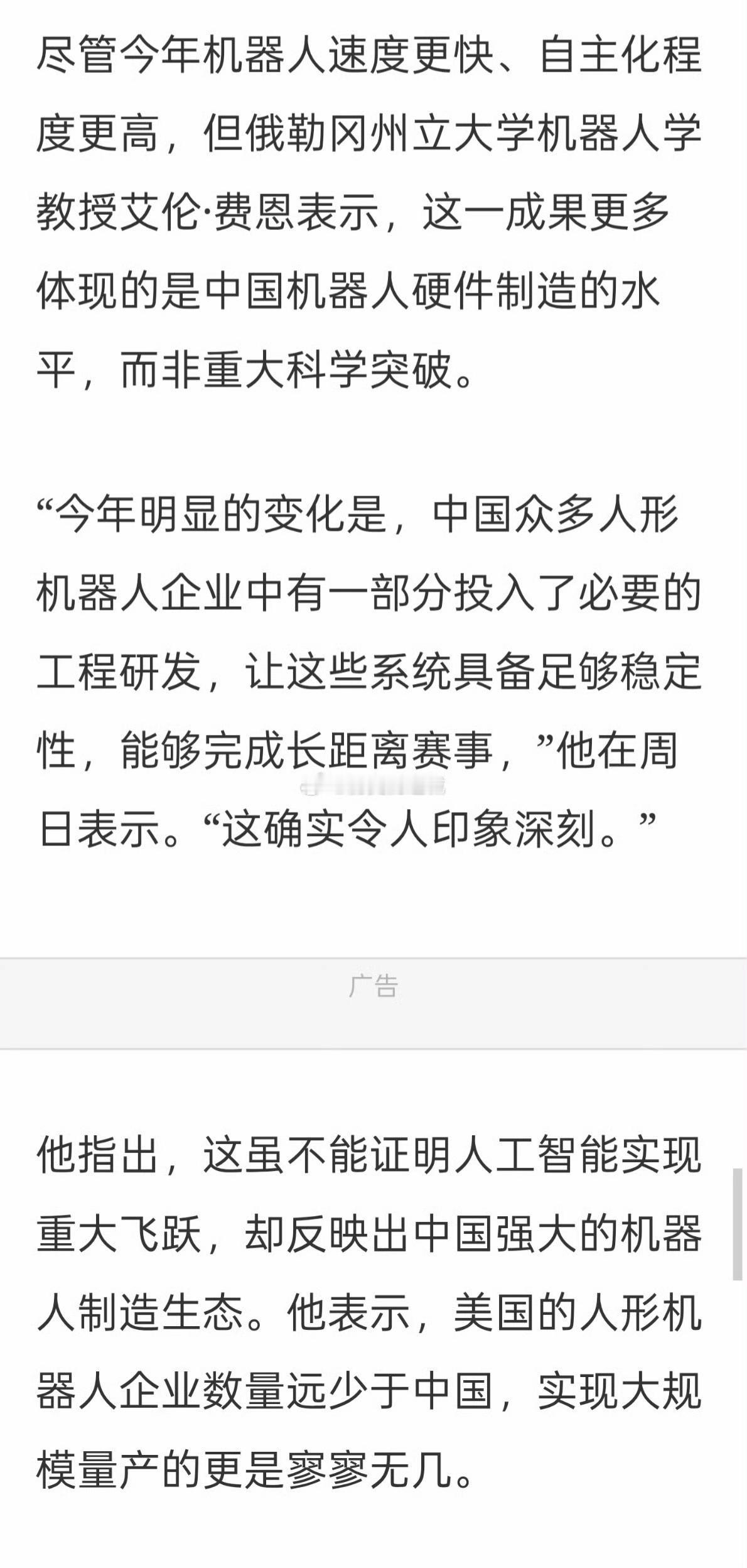纽约时报报道了中国北京亦庄人形机器人半马比赛,他们的落脚点是冠军闪电的速度(50分26秒,净时)。在报道这一惊人的速度以后,最后纽约时报借用俄冈勒州立大学机器人学教授艾伦.费恩的话,来酸了一把:这一成果体现的是中国机器人硬件制造的水平,而非重大科学突破。看了这么多报道,韩国记者比较中立。韩国记者认为,参赛的三百多个人形机器人,有很多不完美的地方,有的起步就摔碎了,有的步履蹒跚,但中国能够提供亦庄半马这个平台,这个平台能够集中三百多个人形机器人站在起跑线,已经说明了中国在人形机器人领域的绝对实力。
