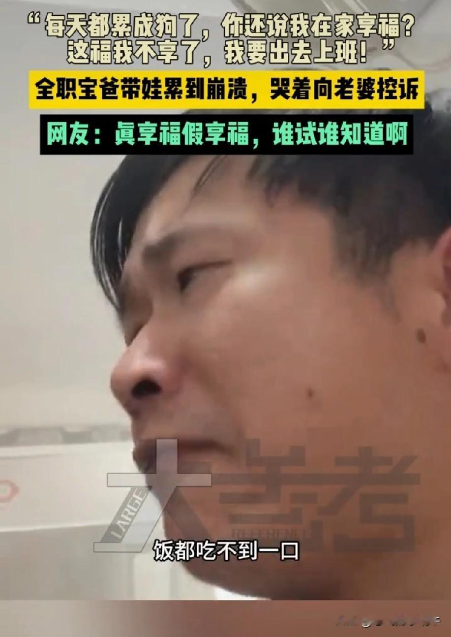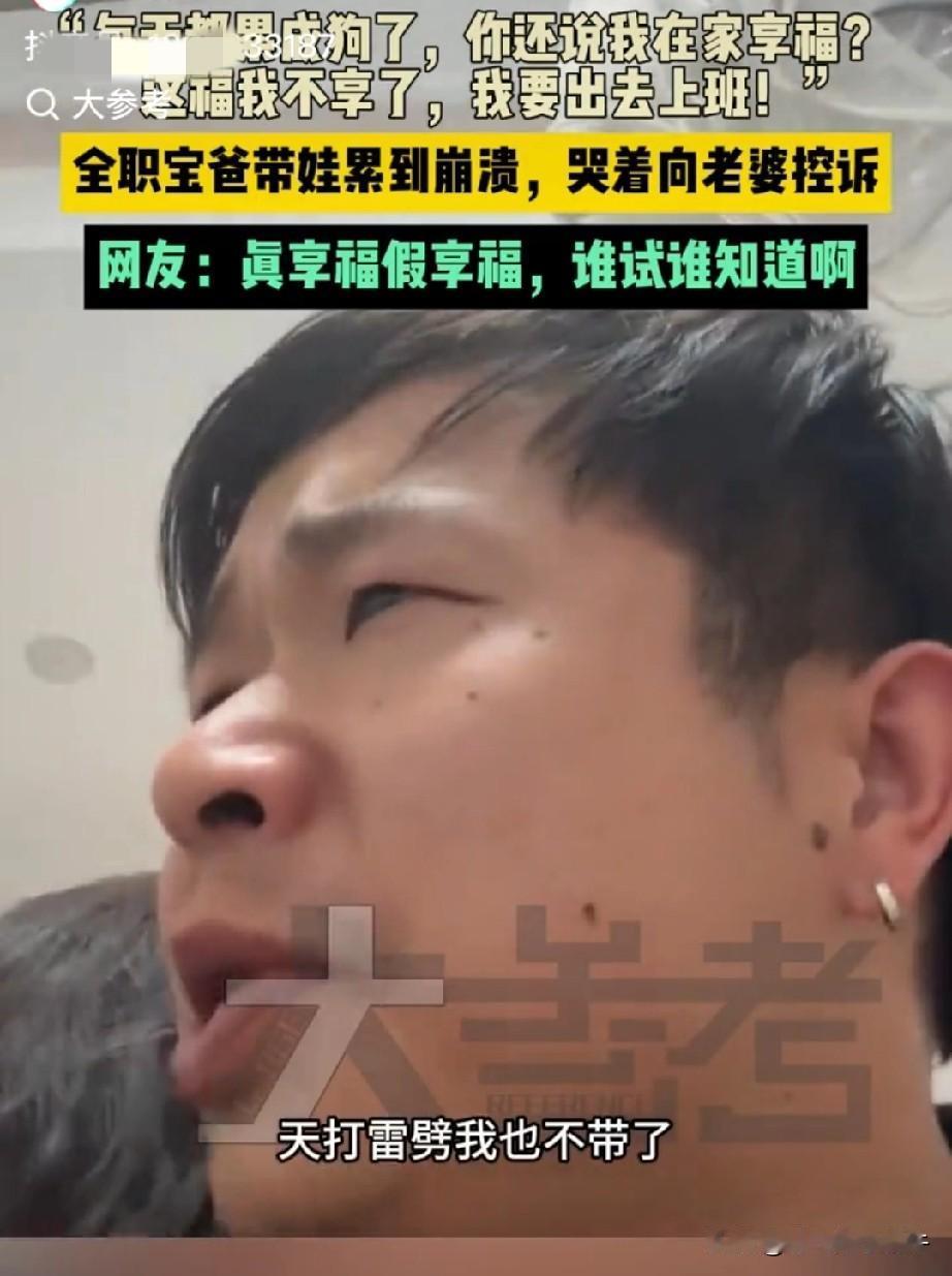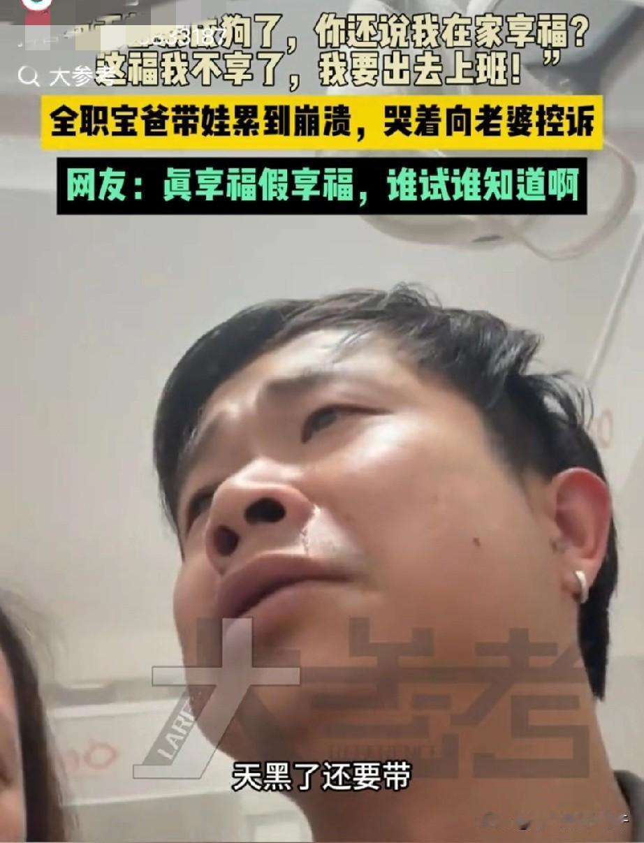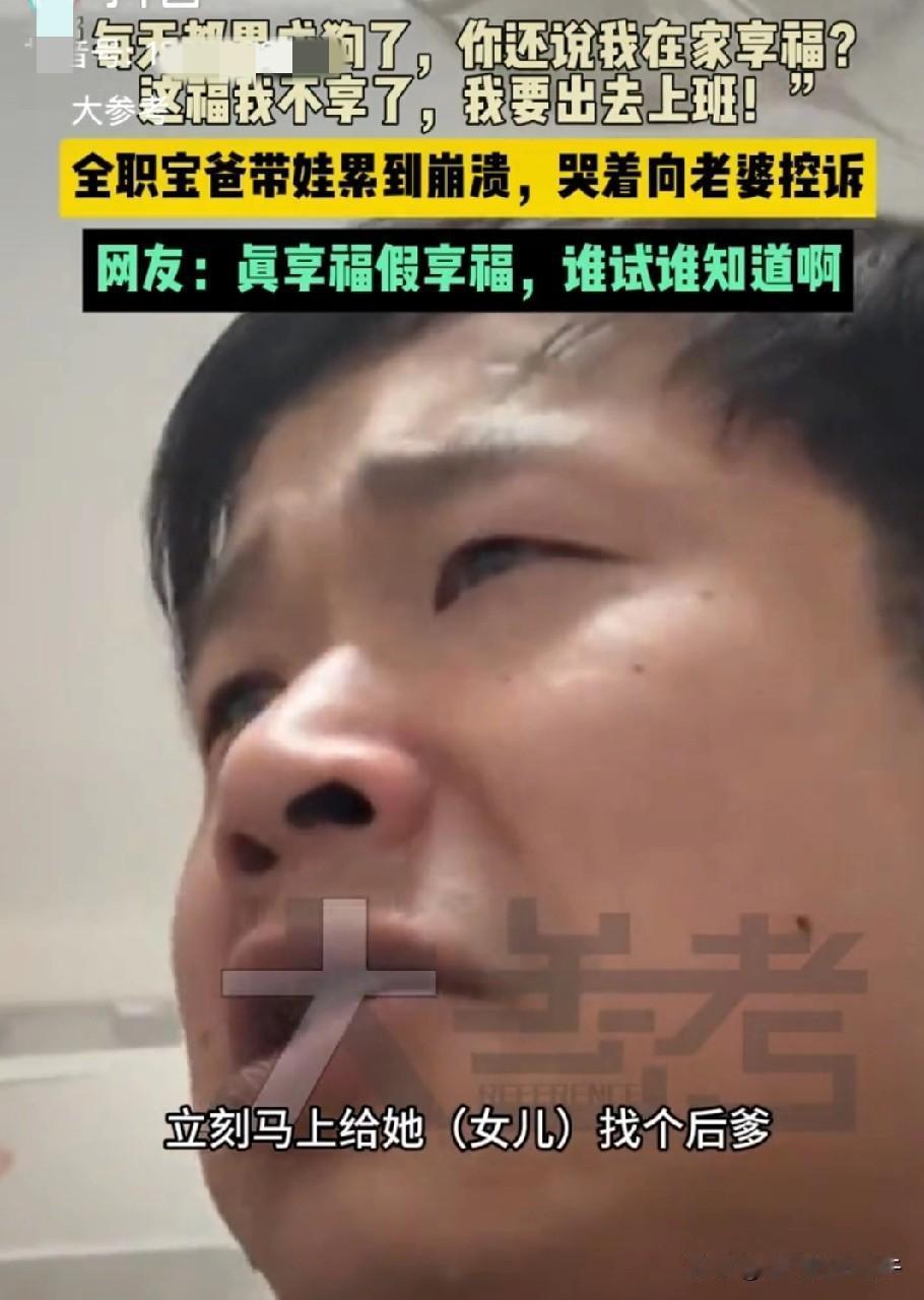 天打雷劈都不带娃了,要求给孩子找个后爹!这居然是一个全职带孩子的男人说出口的话[打脸] 这男人才说出了女人带孩子的一点点苦!就受不了哭了[笑哭]!?他又没十月怀胎,没有剖腹产的疼痛与身材发胖走样…… 像我们这些没人帮衬的,还不得哭死啊? 我觉得我家狗子带孩子的话,那家里就是猪窝,一天三顿饭都忙不过来,早上起来慢腾腾的娃肯定得迟到,送到学校回来吃一口,洗衣服,洗完衣服做饭,做完饭自己吃两口赶紧去接娃,接娃回来再继续做饭,吃完饭洗碗,洗洗弄弄完了又到了睡觉的时间! 我看他一个礼拜回来一两天让他帮忙带娃,他挺忙的,自己还累屁了活也没干好没干完…尤其上个礼拜加上个礼拜,搞得家里到处又脏又乱,我也是心有余力不足,看着十分来气,星期一他们都走了,我只好拖着疲惫的身子开始打扫卫生又洗衣服弄半天[晕] 所以说,“不上班的女人在家都在享福呢!”能说出这句话的人真是站着说话不腰疼,没本事的女人还真做不来!!首先她们会像这个男人一样崩溃了,其次就是家里脏乱差,孩子脏兮兮!一天到晚抱怨个不停,最后受不了的都离婚走了! 所以我觉得我跟我这些自己带孩子的朋友们才是牛鼻的女人[呲牙]我们不仅家里弄的好好的,孩子也弄的好好的,还没心没肺天天开心的[奸笑] 对了,男人带孩子出去玩,最起码遇不到变态来骚扰你吧! 我们带孩子出去,偶尔还碰到变态觉得我们是离婚女人呢,不仅要承受言语上的骚扰,还要承受眼神上的好色,而且一个人经常带娃,还得要承受更变态的人跟踪与有些男人的追求,假如定力不足,就说,是不是分分钟跟人跑了[奸笑]?但是我们没有啊,我们太好了太有责任心了!所以说,我们全职带娃怎么对不起男人了?怎么就变成了好吃懒做的女人了???