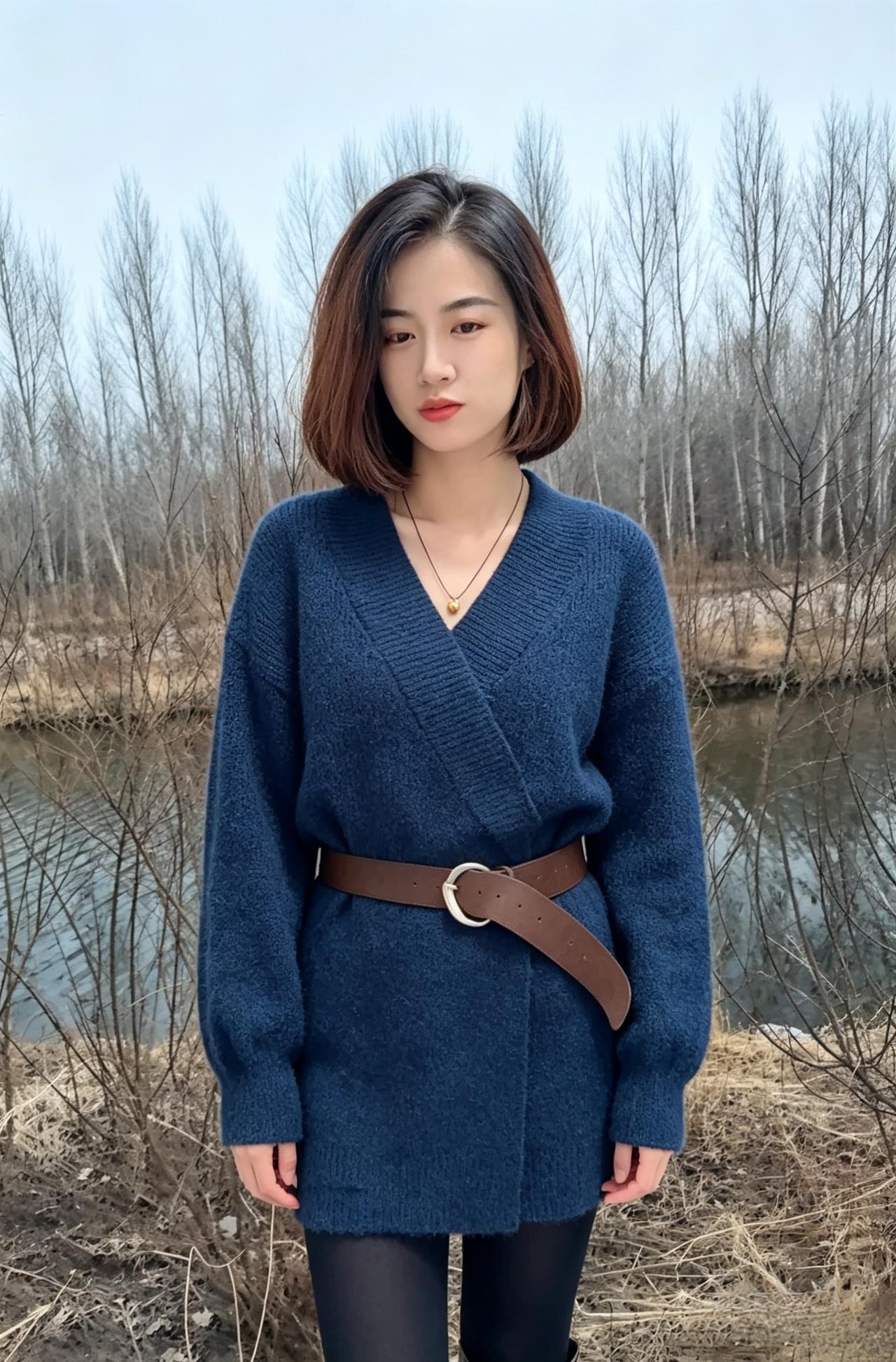 寒水疏林映浅妆, 蓝衣束带自清扬。 眸含山外清天色, 一抹温柔压晚光。