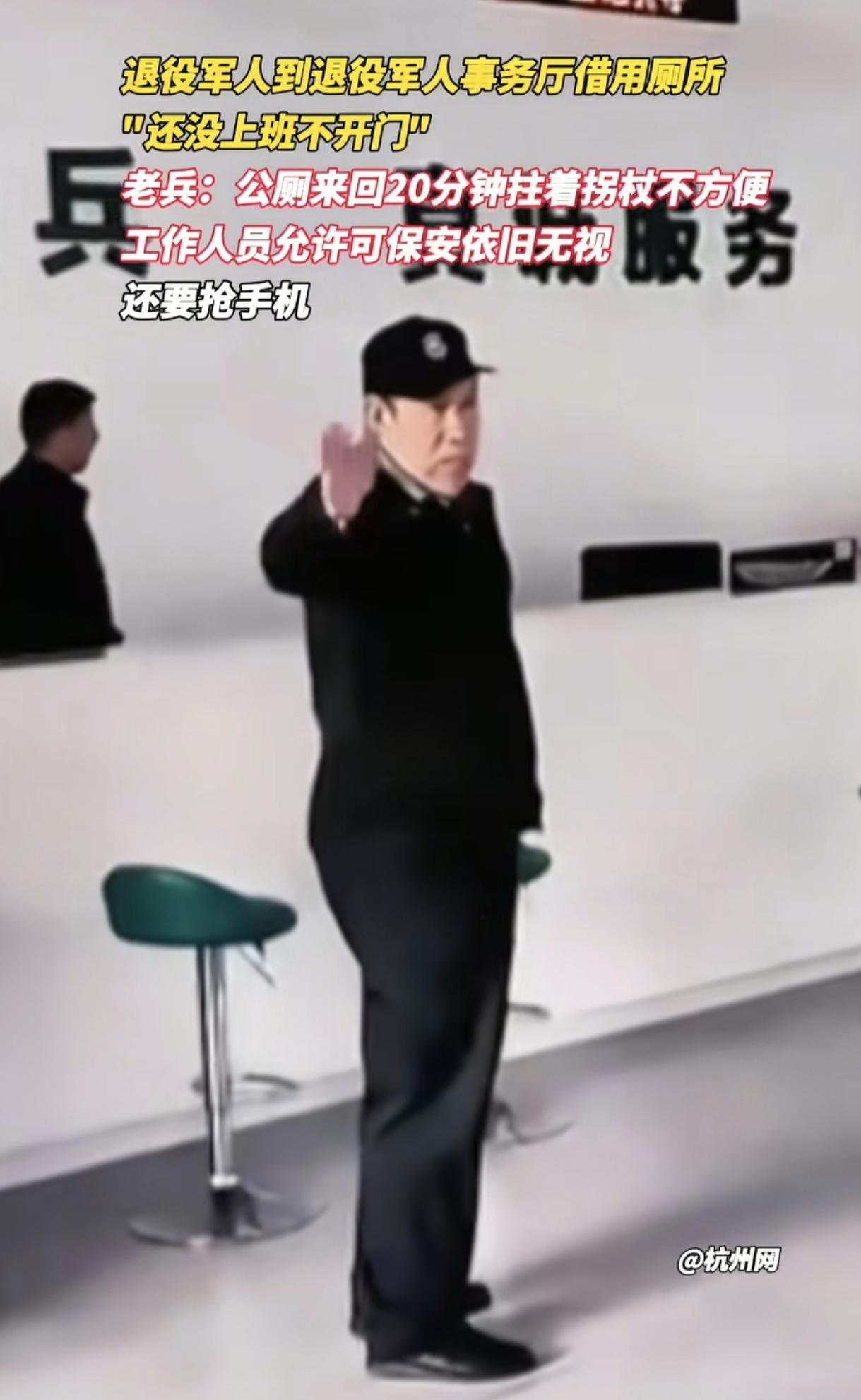 退役老兵上厕所被拒,寒心又讽刺! 一、别让老兵在“娘家”寒心。老兵说明身份、残疾及事由,如去公厕要绕行20多分钟等,内部工作人员也同意了,但保安仍以“不对外、不营业”等为由强行阻拦,还试图抢老兵手机、报警驱赶等。要知道退役军人事务厅本就是老兵的“娘家”,墙上“情系老兵、真诚服务”8字历历在目,宗旨就是服务老兵、关爱老兵,但现实却是被无情拒绝,毫无温情,有意思的是保安自己也是退伍老兵,为何就不能感同身受呢?真是看得令人寒心、气愤又讽刺!尊崇不是口号,而是要真切落到实处! 二、别让因公致残、保家卫国的功臣流血又流泪。这位退役老兵(周先生)在部队服役期间为保护战友冲上去挡住高空重物砸伤了右腿,这是因公救人、见义勇为的行为,从此无法恢复、落下终身残疾,常年靠柱拐杖行走,十分困难,而这也是他求助退役军人事务厅的原因之一。这位老兵把青春与热血都奉献给了国家,于情、于理、于法,事务厅都应伸出援手对残疾退役老兵予以优待,给予他们如厕、办事、问路等细节关爱。 三、别让“死板规矩”凌驾于人情道义、尊崇初心之上。“内部厕所不对外、周五下午不营业”等借口,说明了就是服务意识严重缺位,包括思想僵化、态度粗暴、不尊重军人等,为什么很多老百姓对军人借厕、借更衣室等都十分欢迎又崇拜,那是因为我们从内心深处是真正的爱戴保家卫国的军人。总之,这些死板规矩与教条真得改一改了,不要让所谓的“规矩”凌驾于人道、情理与优待之上,否则太让功臣寒心了。 四、所幸此事及时处理:涉事保安被辞退,管理人员被约谈,事务厅也公开致歉。说明事务厅存在管理疏漏。同时给所有服务单位提了醒:一定要将“情系老兵、真诚服务”8字落到实处,对保家卫国的老兵,多一份体谅与便利,多一分尊重与关爱,让他们真切感受到社会的温暖,绝不能让英雄为国流血后又在自家门口流泪又寒心。 最后,致敬保家卫国的英雄们,正因有了你们,才有了岁月静好与华夏盛世,愿英雄们身体康健,余生皆安![祈祷][祈祷] 对此,大家怎么看呢?欢迎评论区留言。