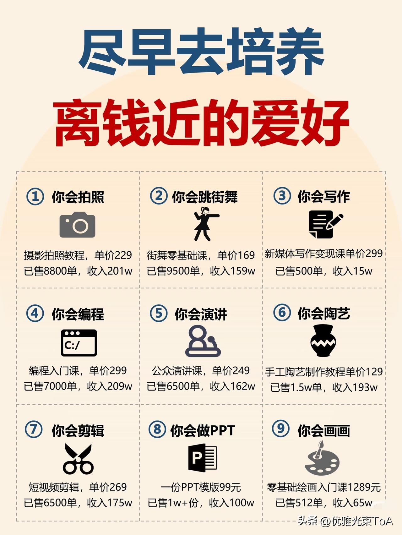 原来这些爱好也这么能赚钱!赶紧看看你有没有☞☞ 别再觉得爱好只能花钱了,有些“离钱近”的爱好,偷偷就能赚翻!! 会拍照的:摄影教程单价229元,卖了8800单,直接进账201万,镜头一举钱就来; 会跳街舞的:零基础课169元,9500人报名,159万到手,跳舞还能当副业; 会写作的:新媒体变现课299元,哪怕只卖500单,也有15万,码字也是生产力; 更绝的是这些: 编程入门课299元,7000单就是209万,敲代码比搬砖香多了; 手工陶艺教程129元,1.5万人买,193万稳稳揣兜,捏泥巴也能成副业; 短视频剪辑课269元,6500单175万,剪剪视频月入过万不是梦; 就连做PPT的,一份模板99元,卖1万+份就赚100万,这钱挣得也太轻松了! 其实啊,爱好不分高低,能变现的就是好本事。你有啥能赚钱的爱好?评论区分享下~ 副业赚钱