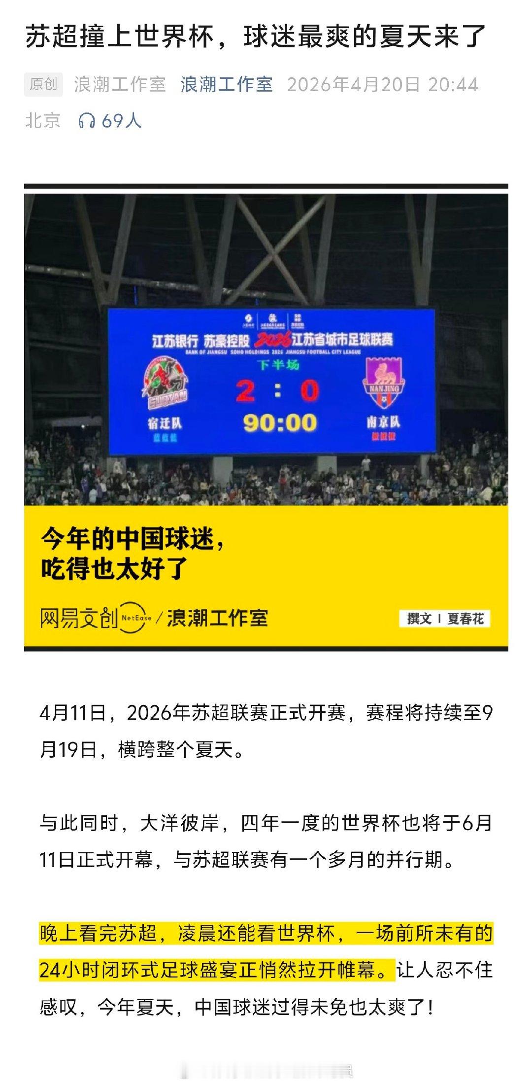 晚上看完苏超,凌晨还能看世界杯,一场前所未有的24小时闭环式足球盛宴正悄然拉开帷幕。让人忍不住感叹,今年夏天,中国球迷过得未免也太爽了!(