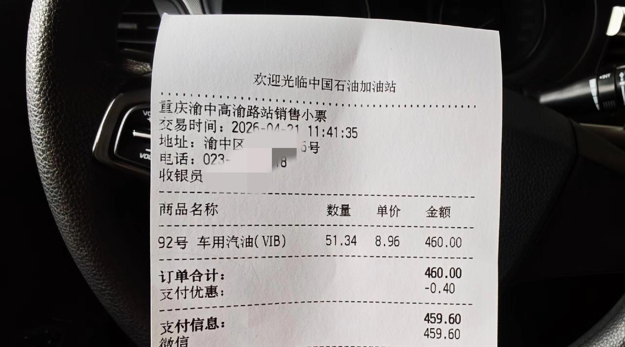 现在油价确实非常高,今天朋友在渝中区加的,92号汽油8块9毛6,花了460元,还是挺肉疼的,只能跑600km,但如果是电车的话,充460元的电,起码够跑三四千公里了吧?好消息是,从今晚24点开始,油价就要下调了,92号汽油下调0.44元,加满50升的油箱可以少花22元,这个降价幅度还是可以,但是要想回到7块钱,估计还是有点难。