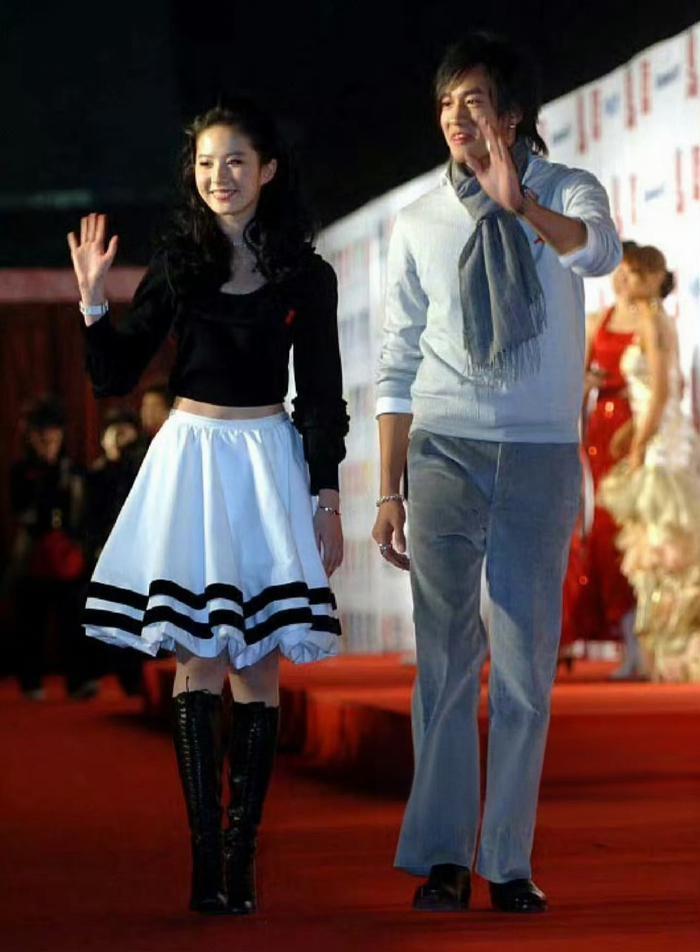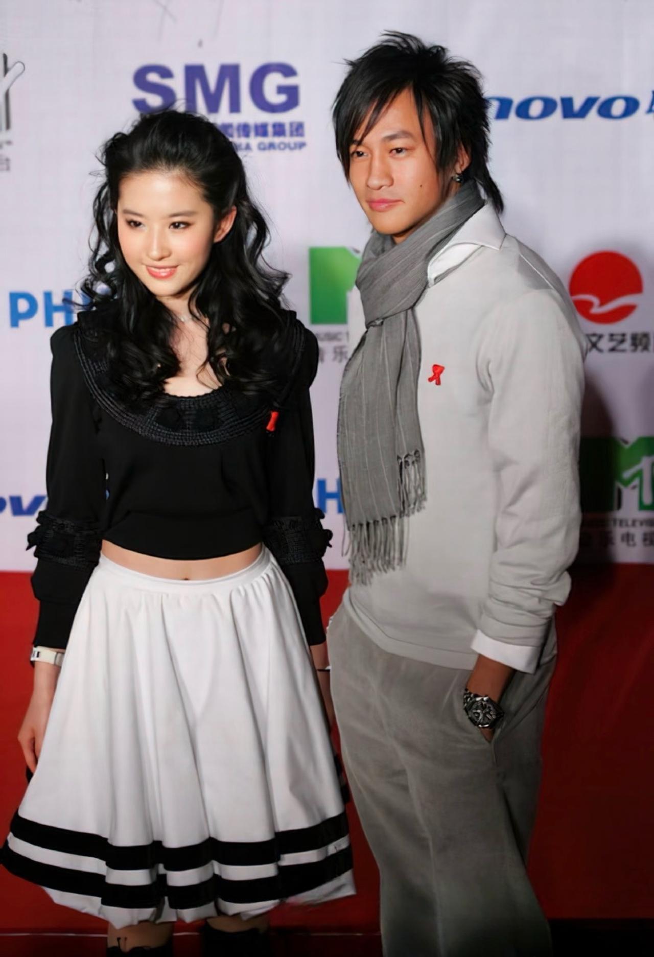 2005年,何润东与刘亦菲参加在上海举行的MTV超级盛典,两人一起走红毯时的画面。 当时,刘亦菲18岁,身穿黑色圆领上衣和白色短裙,学院风的搭配Look,很有青春美少女的气息。何润东 刘亦菲