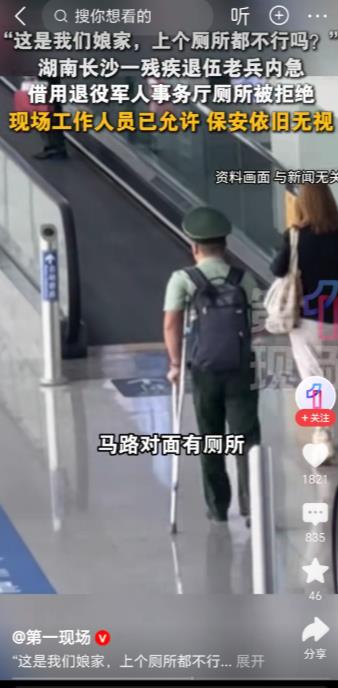 天下之大无奇不有。近日,一湖南长沙的残疾退伍老兵,因内急而且行动不方便,就近去湖南省退役军人事务厅借用厕所,殊不知却遭到保安的坚决拒绝,甚至保安还报警企图阻拦该残疾退休老兵。