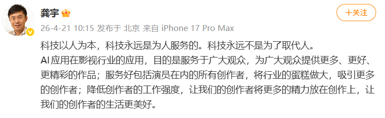 100多位艺人入驻爱奇艺AI艺人库,龚宇称AI让演员一年演4部戏