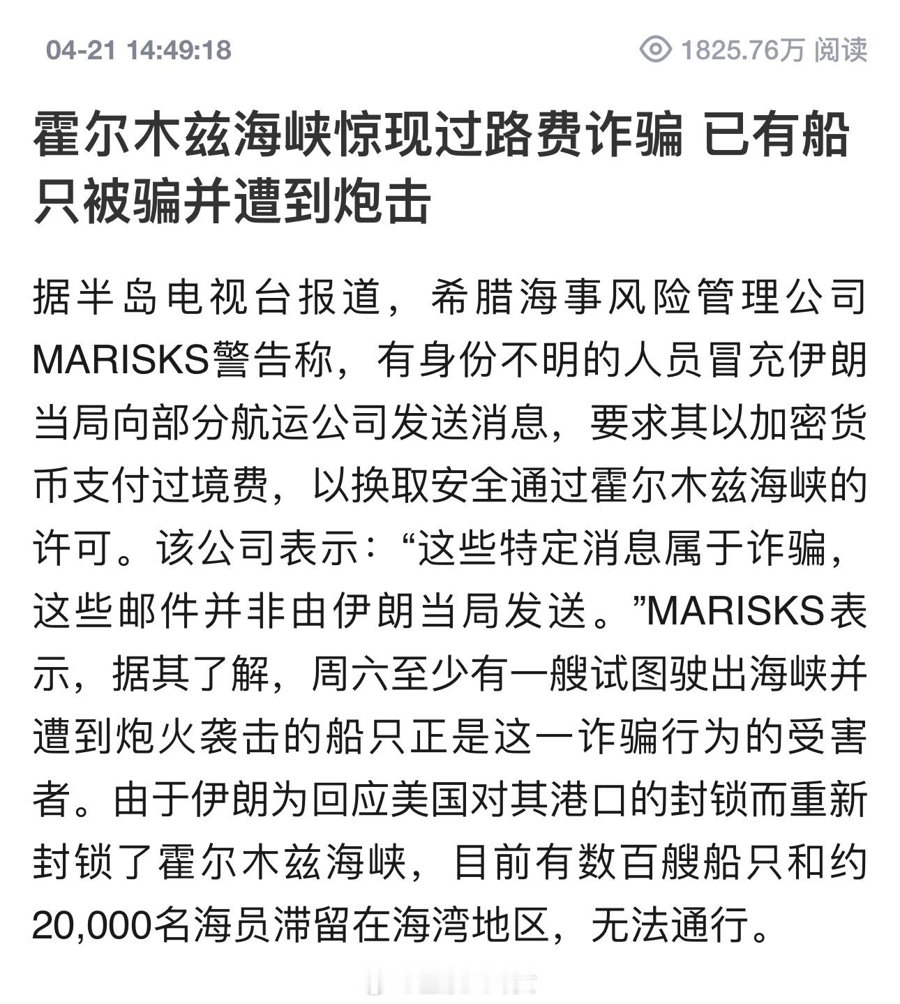 霍尔木兹海峡惊现过路费诈骗 已有船只被骗并遭到炮击
