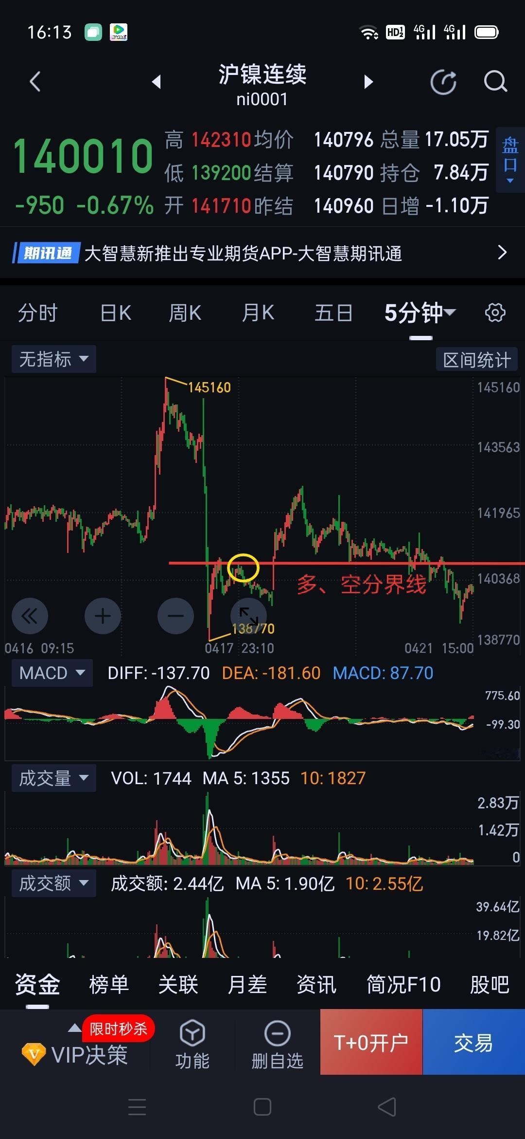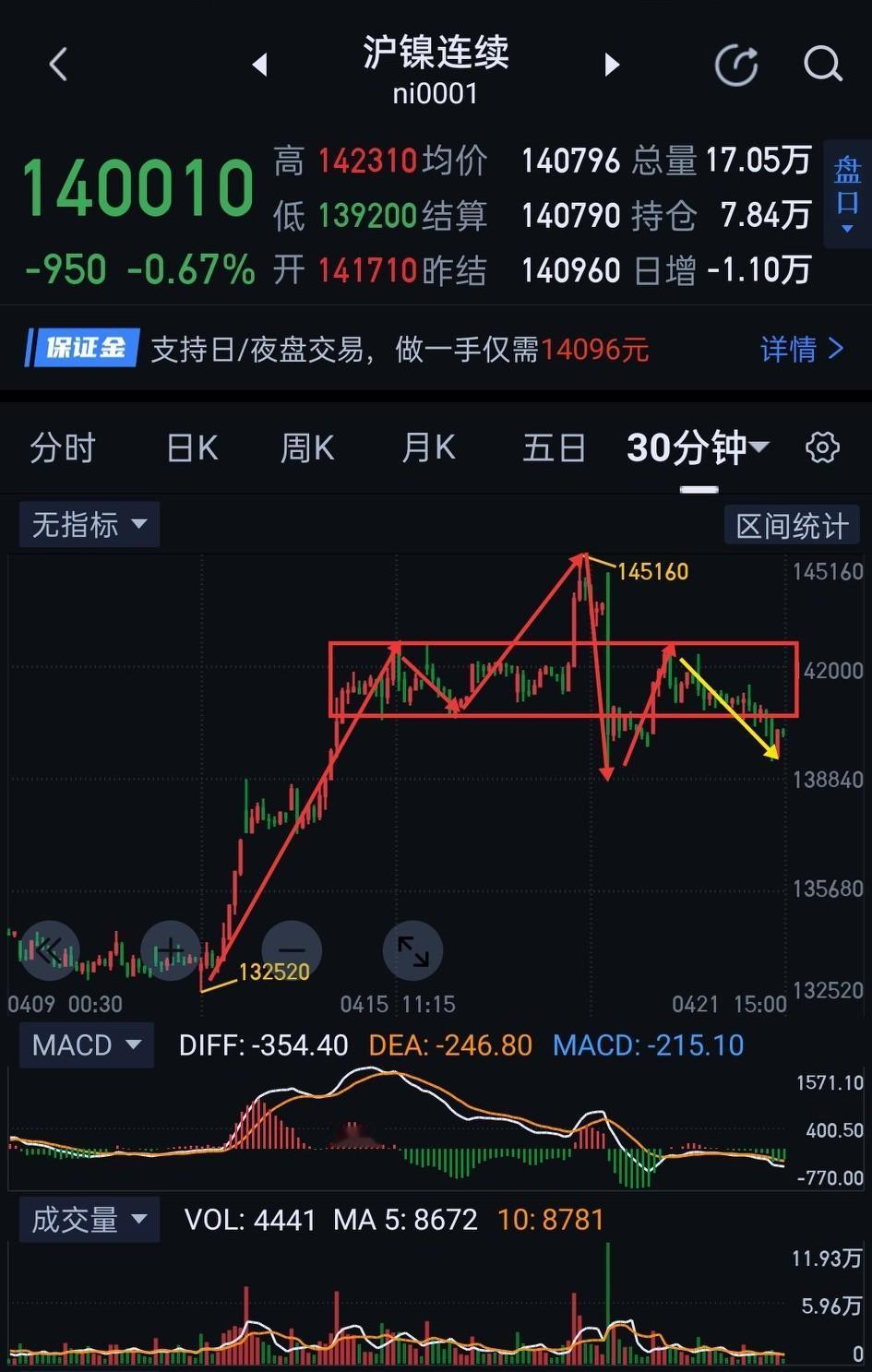 沪镍,暂时回归空方主场。 沪镍日盘下破关键点位140650(图1),重回弱势震荡。 沪镍夜盘,仍可关注图(2)140650的得失。若能重新站稳140650,从142540开始的三十分钟一笔下将面临结束,后期暂可用图(3)五分钟中枢震荡视角跟随。若不能重新回到140650,将有再次下破138770的风险,一旦呈现此结构,从131840~145160开始的日线一笔上将面临结束,沪镍将再次陷入图(4)的中枢震荡。