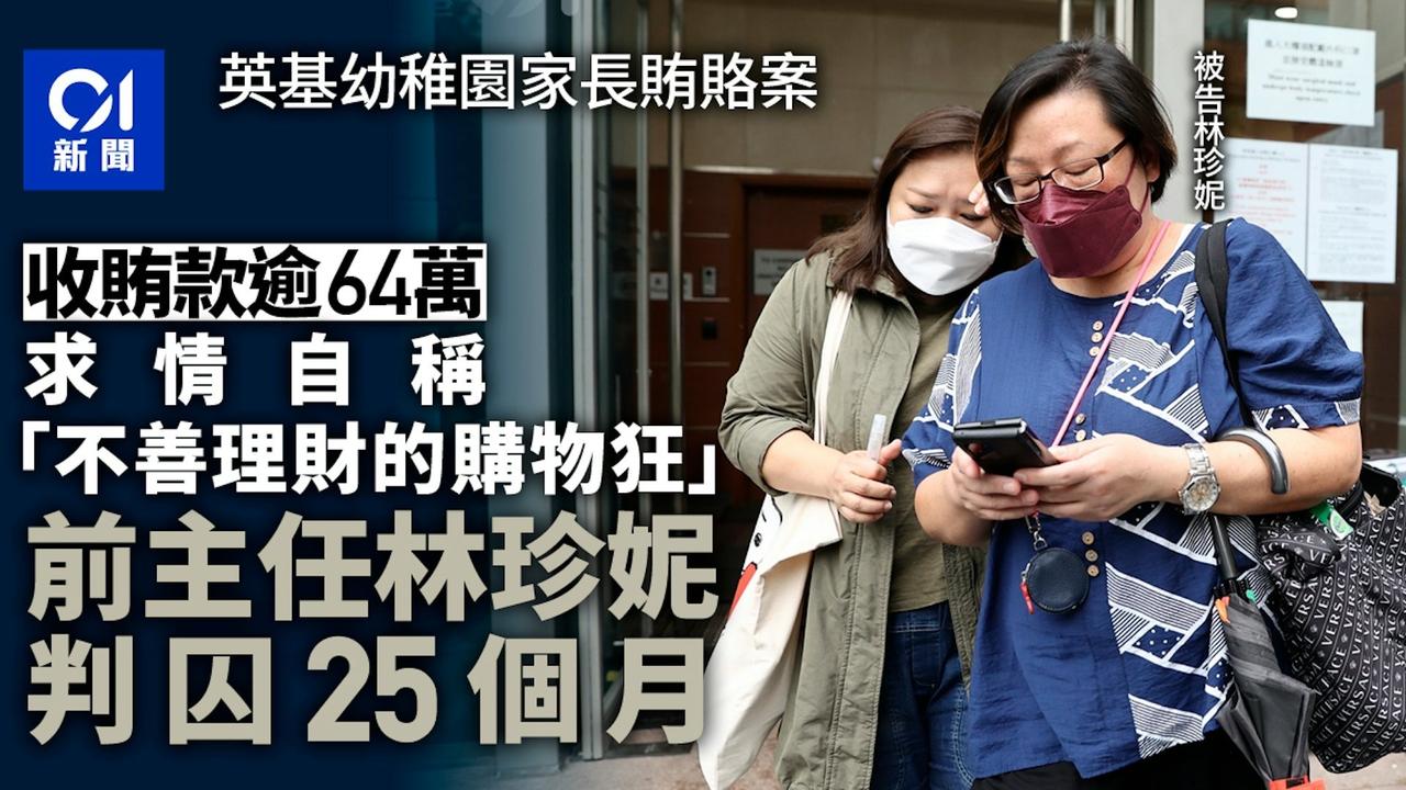 香港幼稚园主任受贿判刑。 英基国际幼稚园(乌溪沙)前行政主任林珍妮,涉向多名家长索款逾64万元贿款,以助他们的子女插队获该校幼儿班取录,林及多名家长同被廉署控告。 林珍妮在求情信自称是「不善理财的购物狂」,因为陷入经济窘境犯案,她愿意承担责任,早日获释照顾家人。 陈官斥林是事件的主脑,罪责最重,她严重破坏英基的信任和声誉,利用父母对子女优质教育的渴求犯案,完全暴露其贪婪。考虑到林认罪和任污点证人,减刑50%后判囚25个月,并须3年内向英基支付64万元。 林认罪后曾出庭指证曾贿赂她13名家长及1名商人,该14人早前已全部被裁定罪名成立,被判囚8至14个月。 该些家长不乏背景不错的人,包括有临床心理学家、岩土工程师,亦有曾投资银行工作。有家长早前求情时,直指林才是始作俑者,指她主动向家长索款。 亦有家长称,觉得英基的制度,会先优惠买学券及有其他子女已在校就读的家庭,认为制度本身存在不公。有部份涉行贿的家长已经逃离香港。