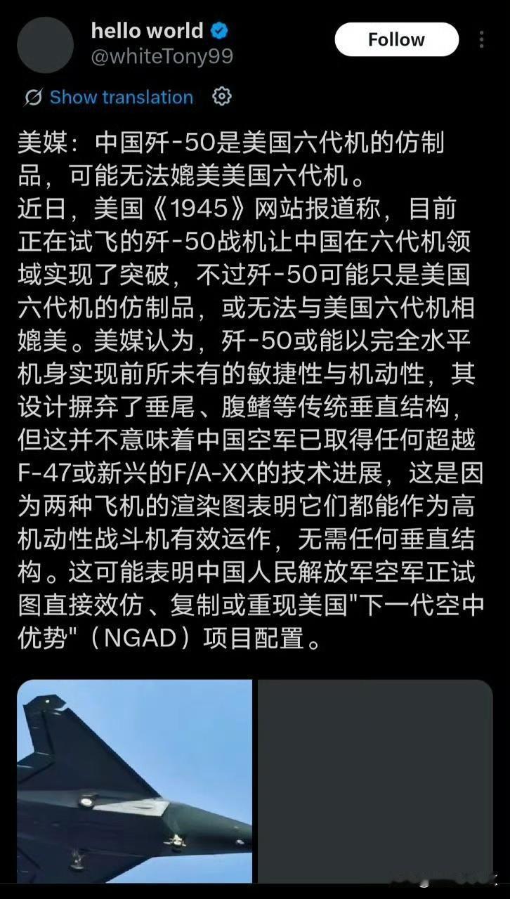 美媒:中国歼-50是对美国六代机的拙劣模仿 最近美国国内异常火爆的一个新闻,美国军事网站1945称,中国又又又抄袭了美国军工,而且方言中国六代机无法媲美美国F-47或F/A-XX ,不过文章下面的一个评论给我看的破大防了,一个德国网友怼道:美国人才是世界上最大的技术抄袭者(二战结束时的“回形针”行动掠夺了大量的德国科技) [笑哭] 军事 六代机