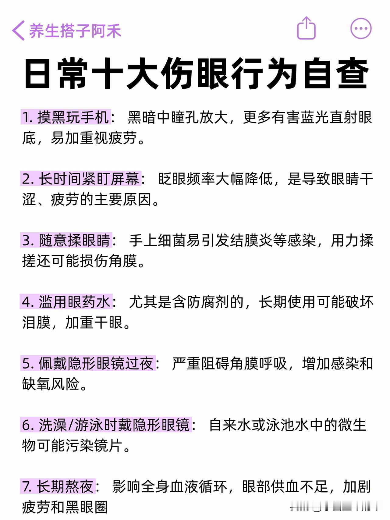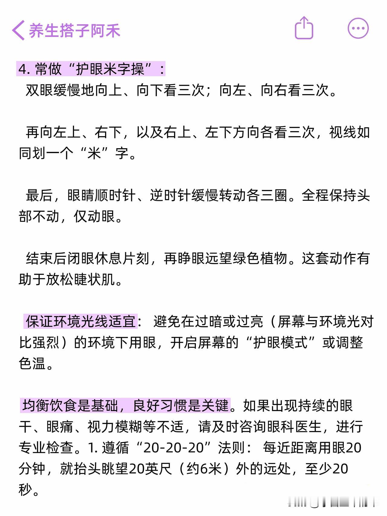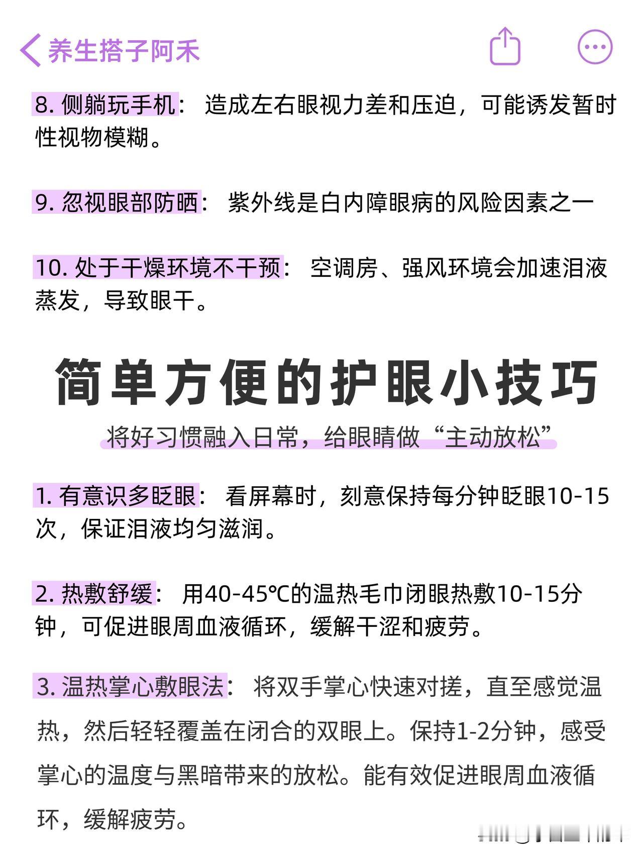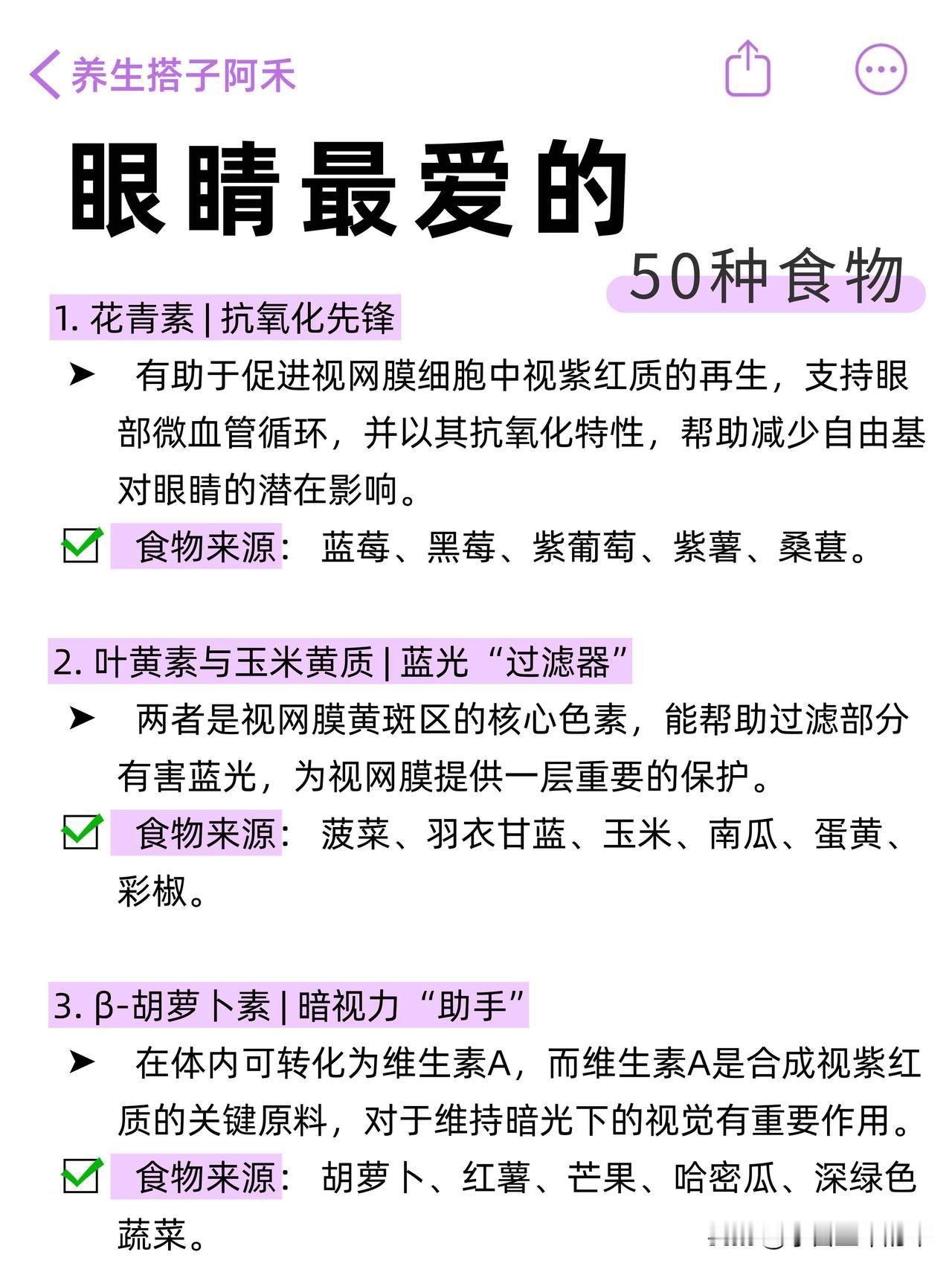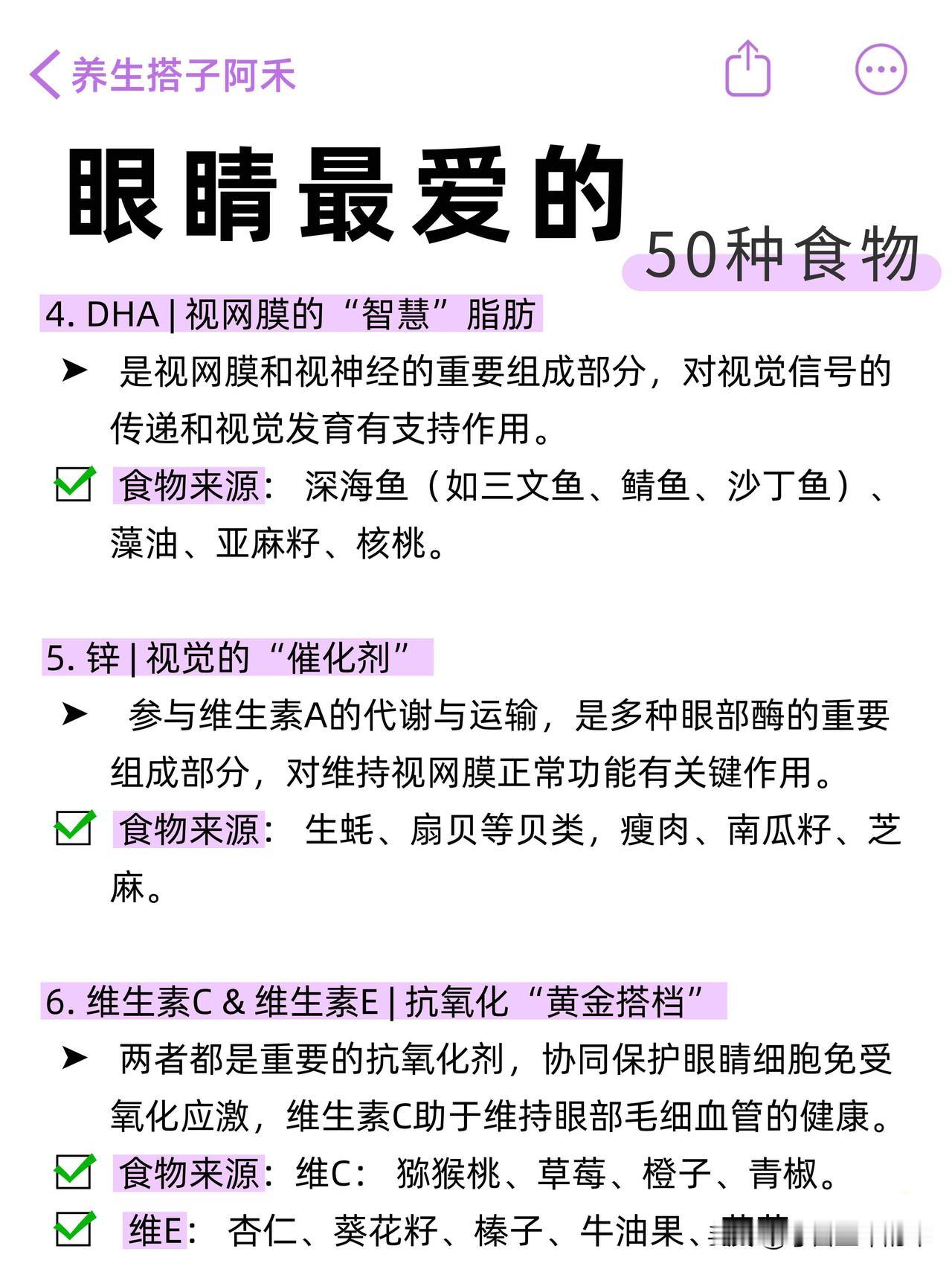 眼睛养护全指南:吃对食物+避开误区+实用技巧 这组图片从饮食、避坑、日常护理三个维度,整理了一套完整的护眼方案👇 一、眼睛最爱的7类食物(共50种) 不同营养成分对眼睛的作用各不相同,按类别整理如下: 营养成分 护眼作用 食物来源 花青素 抗氧化先锋,促进视网膜视紫红质再生,改善眼部微循环 蓝莓、黑莓、紫葡萄、桑葚、紫薯、紫甘蓝、紫洋葱、红心火龙果、樱桃、茄子 叶黄素/玉米黄质 蓝光“过滤器”,视网膜黄斑区核心色素,过滤有害蓝光 菠菜、羽衣甘蓝、芥蓝、韭菜、小白菜、油麦菜、玉米、南瓜、彩椒(黄/橙/红)、蛋黄 β-胡萝卜素 暗视力助手,体内转化为维生素A,维持暗光视觉 胡萝卜、红薯、芒果、哈密瓜、木瓜、杏、枸杞、西洋菜、空心菜、苋菜 DHA/Omega-3 视网膜“智慧脂肪”,视神经重要组成部分,支持视觉发育 三文鱼、鳕鱼、鲭鱼、沙丁鱼、金枪鱼、核桃、亚麻籽、奇亚籽、海带、紫苏籽 锌 视觉“催化剂”,参与维生素A代谢,维持视网膜正常功能 生蚝、扇贝、瘦牛肉、猪肝(适量)、南瓜籽、黑芝麻、腰果、黑豆、燕麦、藜麦 维生素E 抗氧化搭档,保护眼部细胞免受氧化应激 杏仁、葵花籽、榛子、花生、牛油果、橄榄油、小麦胚芽、松子、开心果、菠菜 维生素C 维持眼部毛细血管健康,协同抗氧化 猕猴桃、鲜枣、草莓、橙子、柚子、青椒、西兰花、菜花、番石榴、柿子椒 二、十大伤眼行为自查 这些日常习惯正在悄悄伤害你的眼睛,快对照看看: 1. 摸黑玩手机:黑暗中瞳孔放大,有害蓝光直射眼底,加重视疲劳。 2. 长时间紧盯屏幕:眨眼频率大幅降低,导致眼睛干涩、疲劳。 3. 随意揉眼睛:手上细菌易引发结膜炎,用力揉搓还可能损伤角膜。 4. 滥用眼药水:含防腐剂的眼药水长期使用会破坏泪膜,加重干眼。 5. 佩戴隐形眼镜过夜:阻碍角膜呼吸,增加感染和缺氧风险。 6. 洗澡/游泳时戴隐形眼镜:水中微生物可能污染镜片,引发眼部感染。 7. 长期熬夜:影响全身血液循环,眼部供血不足,加剧疲劳和黑眼圈。 8. 侧躺玩手机:造成左右眼视力差和压迫,可能诱发暂时性视物模糊。 9. 忽视眼部防晒:紫外线是白内障等眼病的风险因素之一。 10. 处于干燥环境不干预:空调房、强风环境会加速泪液蒸发,导致眼干。 三、简单实用的护眼小技巧 1. 刻意多眨眼:看屏幕时,保持每分钟眨眼10-15次,保证泪液均匀滋润眼球。 2. 热敷舒缓:用40-45℃的温热毛巾闭眼热敷10-15分钟,促进眼周血液循环,缓解干涩和疲劳。 3. 掌心敷眼法:双手快速对搓至发热,轻轻覆盖在闭合的双眼上,保持1-2分钟,利用温度和黑暗帮助眼睛放松。 4. 护眼米字操:双眼缓慢上下、左右、左上右下、右上左下各看三次,再顺时针、逆时针缓慢转动各三圈,全程保持头部不动,结束后闭眼休息片刻。 5. 20-20-20法则:每近距离用眼20分钟,抬头眺望20英尺(约6米)外的远处,至少20秒,让睫状肌得到放松。 6. 保证环境光线适宜:避免在过暗或过亮的环境下用眼,开启屏幕护眼模式,减少强光刺激。 💡 小贴士:均衡饮食是护眼的基础,养成良好习惯是关键。如果出现持续眼干、眼痛、视力模糊等不适,请及时咨询眼科医生。