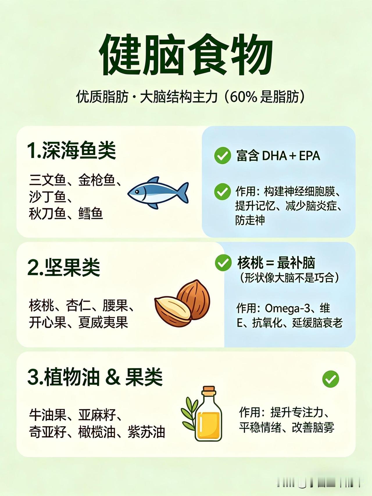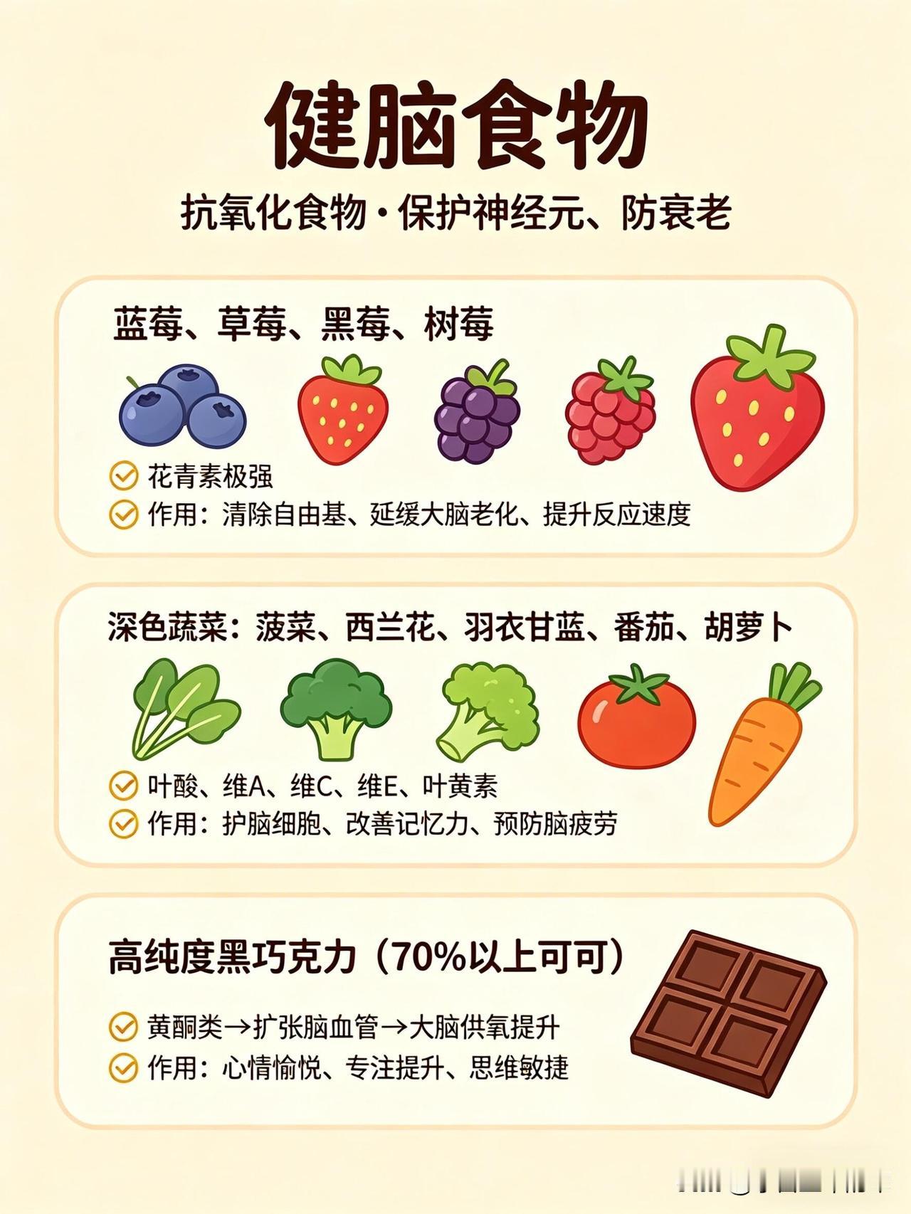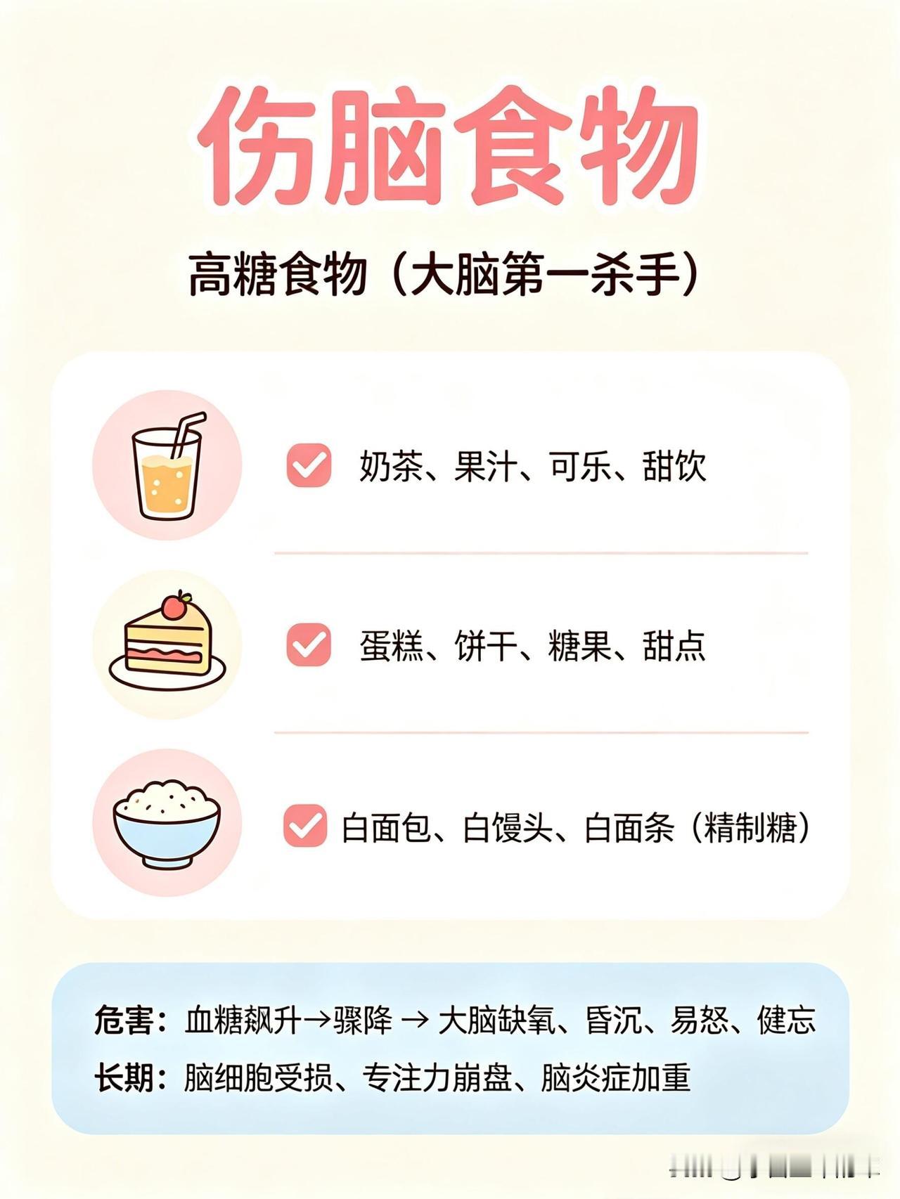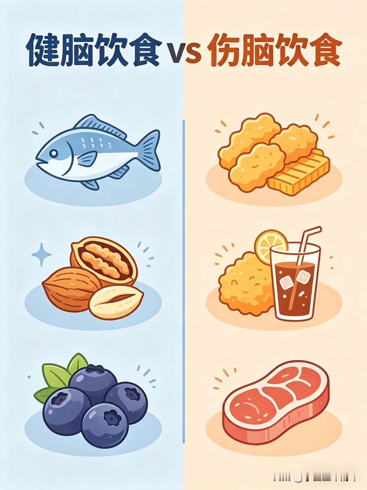 这份健脑vs伤脑饮食清单,帮你一眼看懂哪些食物养大脑、哪些会拖垮脑力👇 🧠 健脑食物:按营养分类,吃对了思路更清晰 1. 优质脂肪(大脑的“建筑材料”) • 深海鱼类:三文鱼、金枪鱼、沙丁鱼、秋刀鱼、鳕鱼。富含DHA+EPA,帮助构建神经细胞膜、提升记忆力、减少脑部炎症。 • 坚果类:核桃、杏仁、腰果、开心果、夏威夷果。补充Omega-3和维生素E,抗氧化、延缓脑衰老。 • 植物油与果类:牛油果、亚麻籽、奇亚籽、橄榄油、紫苏油。帮助提升专注力、平稳情绪、改善脑雾。 2. 抗氧化食物(保护神经元,延缓衰老) • 莓果类:蓝莓、草莓、黑莓、树莓。花青素含量高,清除自由基、延缓大脑老化、提升反应速度。 • 深色蔬菜:菠菜、西兰花、羽衣甘蓝、番茄、胡萝卜。富含叶酸、维生素A/C/E和叶黄素,保护脑细胞、改善记忆力。 • 黑巧克力(70%以上可可):黄酮类物质能扩张脑血管,提升大脑供氧量,让人心情愉悦、思维敏捷。 3. 优质蛋白(专注力与情绪的基石) • 鸡蛋:蛋黄中的卵磷脂和胆碱,是合成乙酰胆碱(记忆神经递质)的关键原料,能提升记忆力和反应力。 • 动物蛋白:鸡胸肉、牛肉、鱼虾、瘦猪肉。含酪氨酸,帮助合成多巴胺和肾上腺素,让人保持清醒专注、不易烦躁。 • 植物蛋白:豆腐、豆浆、豆干、鹰嘴豆。平稳血糖、保护脑血管、改善脑雾。 4. 慢碳水(大脑的稳定能量来源) • 全谷物:燕麦、糙米、藜麦、黑米、荞麦 • 薯类:红薯、山药、芋头、玉米、土豆 • 作用:缓慢释放葡萄糖,让大脑持续供能,避免昏沉、犯困和注意力分散。 5. 微量元素(大脑的“电池”) • 镁:抗焦虑、助眠、防走神,来源包括香蕉、杏仁、菠菜、黑巧克力等。 • B族维生素:防脑萎缩、抗疲劳,来源包括糙米、燕麦、动物肝脏、蛋黄、深绿色蔬菜。 • 锌:提升记忆力和反应速度,来源包括生蚝、南瓜子、牛肉、坚果。 • 维生素D:影响情绪和认知,来源包括深海鱼、晒太阳。 6. 健脑饮品 • 白开水(大脑75%是水,缺水会直接影响思维) • 纯牛奶/无糖酸奶(补充钙、蛋白和色氨酸) • 绿茶(含茶多酚,帮助清醒和抗氧化) • 豆浆(补充植物蛋白和卵磷脂) ⚠️ 伤脑食物:这些食物会悄悄拖垮脑力 1. 高糖食物(大脑的“第一杀手”) • 奶茶、果汁、可乐、甜饮 • 蛋糕、饼干、糖果、甜点 • 精制碳水:白面包、白馒头、白面条 • 危害:血糖骤升骤降,导致大脑缺氧、昏沉易怒、健忘,长期会损伤脑细胞、加重脑部炎症。 2. 油炸与反式脂肪 • 炸鸡、薯条、油条、油饼 • 酥皮点心、奶油蛋糕、起酥面包 • 方便面、薯片、快餐 • 危害:引发炎症、损伤脑血管,导致大脑供血下降,反应变慢、记忆力衰退。 3. 高盐食物 • 咸菜、腌菜、咸鱼、腊肉 • 重盐外卖、卤味、泡面 • 危害:升高血压,损伤脑部微血管,导致记忆力下降、头晕。 4. 精加工食品 • 火腿、香肠、培根、腊肉 • 罐头、酱料、零食、速冻食品 • 过量的味精、鸡精 • 危害:添加剂加重肝肾负担,影响大脑供能,导致注意力涣散、情绪波动和脑雾。 5. 伤脑饮品 • 酒精(会杀死海马体细胞,直接损伤记忆) • 过量咖啡(易引发心慌、焦虑、失眠,消耗脑力) • 能量饮料(导致神经紊乱、崩溃式疲劳) 💡 小贴士:不用刻意追求某一种“超级食物”,关键是长期保持均衡饮食,多吃天然、少加工的食物,减少高糖、高油、高盐的摄入,大脑才能一直保持在线状态。