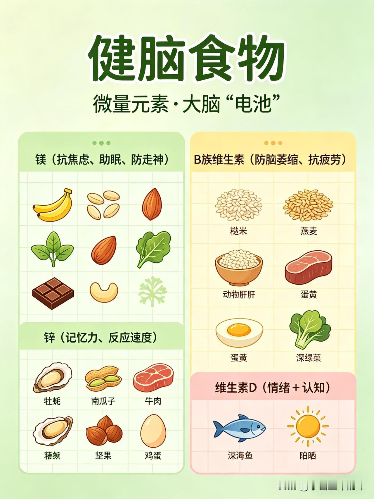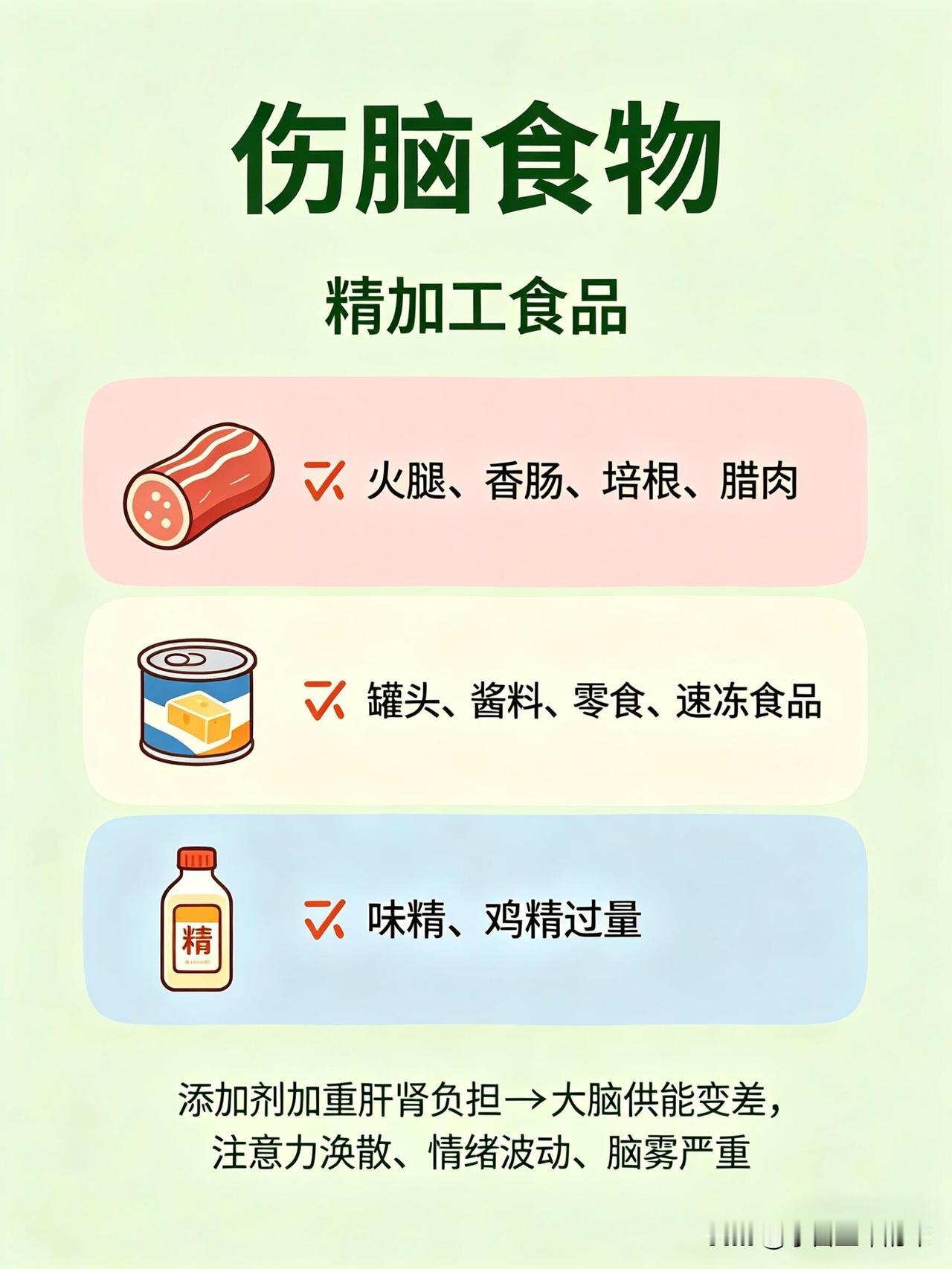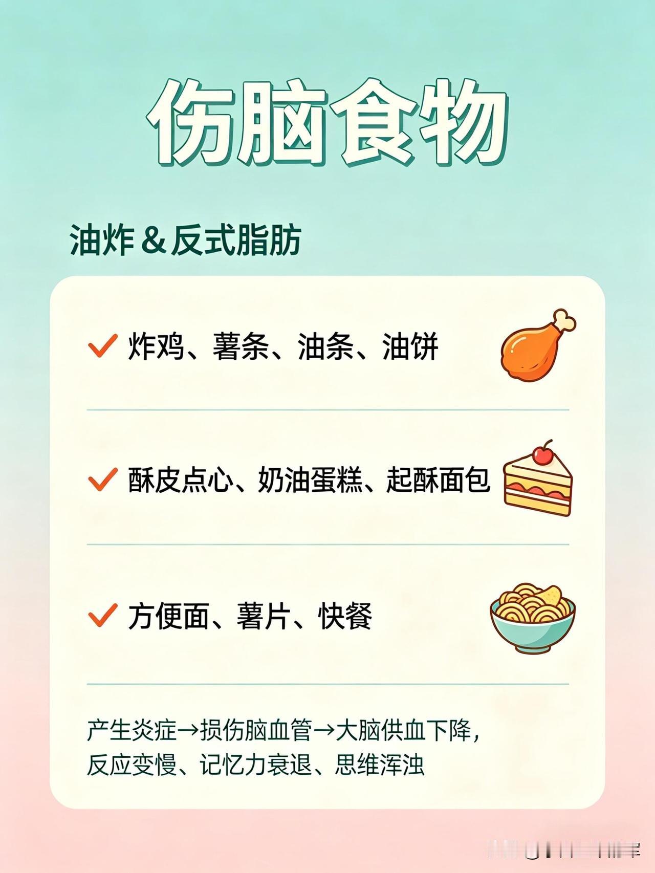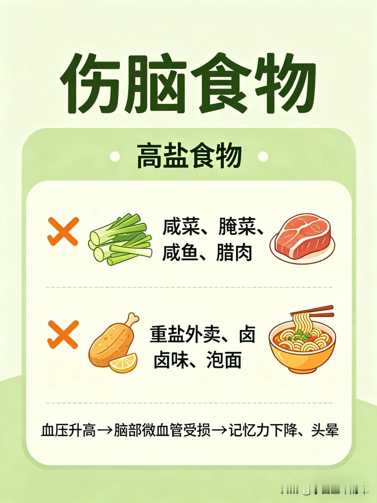 这份健脑vs伤脑饮食清单,帮你一眼看懂哪些食物养大脑、哪些会拖垮脑力👇 🧠 健脑食物:按营养分类,吃对了思路更清晰 1. 优质脂肪(大脑的“建筑材料”) • 深海鱼类:三文鱼、金枪鱼、沙丁鱼、秋刀鱼、鳕鱼。富含DHA+EPA,帮助构建神经细胞膜、提升记忆力、减少脑部炎症。 • 坚果类:核桃、杏仁、腰果、开心果、夏威夷果。补充Omega-3和维生素E,抗氧化、延缓脑衰老。 • 植物油与果类:牛油果、亚麻籽、奇亚籽、橄榄油、紫苏油。帮助提升专注力、平稳情绪、改善脑雾。 2. 抗氧化食物(保护神经元,延缓衰老) • 莓果类:蓝莓、草莓、黑莓、树莓。花青素含量高,清除自由基、延缓大脑老化、提升反应速度。 • 深色蔬菜:菠菜、西兰花、羽衣甘蓝、番茄、胡萝卜。富含叶酸、维生素A/C/E和叶黄素,保护脑细胞、改善记忆力。 • 黑巧克力(70%以上可可):黄酮类物质能扩张脑血管,提升大脑供氧量,让人心情愉悦、思维敏捷。 3. 优质蛋白(专注力与情绪的基石) • 鸡蛋:蛋黄中的卵磷脂和胆碱,是合成乙酰胆碱(记忆神经递质)的关键原料,能提升记忆力和反应力。 • 动物蛋白:鸡胸肉、牛肉、鱼虾、瘦猪肉。含酪氨酸,帮助合成多巴胺和肾上腺素,让人保持清醒专注、不易烦躁。 • 植物蛋白:豆腐、豆浆、豆干、鹰嘴豆。平稳血糖、保护脑血管、改善脑雾。 4. 慢碳水(大脑的稳定能量来源) • 全谷物:燕麦、糙米、藜麦、黑米、荞麦 • 薯类:红薯、山药、芋头、玉米、土豆 • 作用:缓慢释放葡萄糖,让大脑持续供能,避免昏沉、犯困和注意力分散。 5. 微量元素(大脑的“电池”) • 镁:抗焦虑、助眠、防走神,来源包括香蕉、杏仁、菠菜、黑巧克力等。 • B族维生素:防脑萎缩、抗疲劳,来源包括糙米、燕麦、动物肝脏、蛋黄、深绿色蔬菜。 • 锌:提升记忆力和反应速度,来源包括生蚝、南瓜子、牛肉、坚果。 • 维生素D:影响情绪和认知,来源包括深海鱼、晒太阳。 6. 健脑饮品 • 白开水(大脑75%是水,缺水会直接影响思维) • 纯牛奶/无糖酸奶(补充钙、蛋白和色氨酸) • 绿茶(含茶多酚,帮助清醒和抗氧化) • 豆浆(补充植物蛋白和卵磷脂) ⚠️ 伤脑食物:这些食物会悄悄拖垮脑力 1. 高糖食物(大脑的“第一杀手”) • 奶茶、果汁、可乐、甜饮 • 蛋糕、饼干、糖果、甜点 • 精制碳水:白面包、白馒头、白面条 • 危害:血糖骤升骤降,导致大脑缺氧、昏沉易怒、健忘,长期会损伤脑细胞、加重脑部炎症。 2. 油炸与反式脂肪 • 炸鸡、薯条、油条、油饼 • 酥皮点心、奶油蛋糕、起酥面包 • 方便面、薯片、快餐 • 危害:引发炎症、损伤脑血管,导致大脑供血下降,反应变慢、记忆力衰退。 3. 高盐食物 • 咸菜、腌菜、咸鱼、腊肉 • 重盐外卖、卤味、泡面 • 危害:升高血压,损伤脑部微血管,导致记忆力下降、头晕。 4. 精加工食品 • 火腿、香肠、培根、腊肉 • 罐头、酱料、零食、速冻食品 • 过量的味精、鸡精 • 危害:添加剂加重肝肾负担,影响大脑供能,导致注意力涣散、情绪波动和脑雾。 5. 伤脑饮品 • 酒精(会杀死海马体细胞,直接损伤记忆) • 过量咖啡(易引发心慌、焦虑、失眠,消耗脑力) • 能量饮料(导致神经紊乱、崩溃式疲劳) 💡 小贴士:不用刻意追求某一种“超级食物”,关键是长期保持均衡饮食,多吃天然、少加工的食物,减少高糖、高油、高盐的摄入,大脑才能一直保持在线状态。