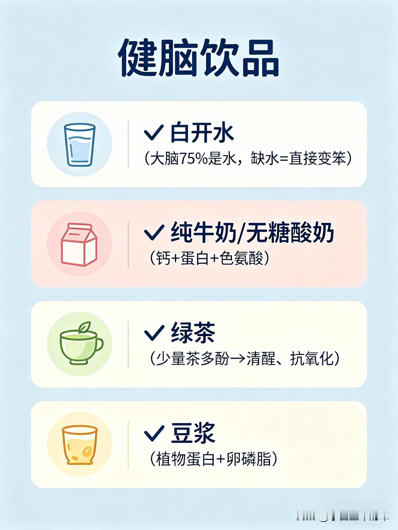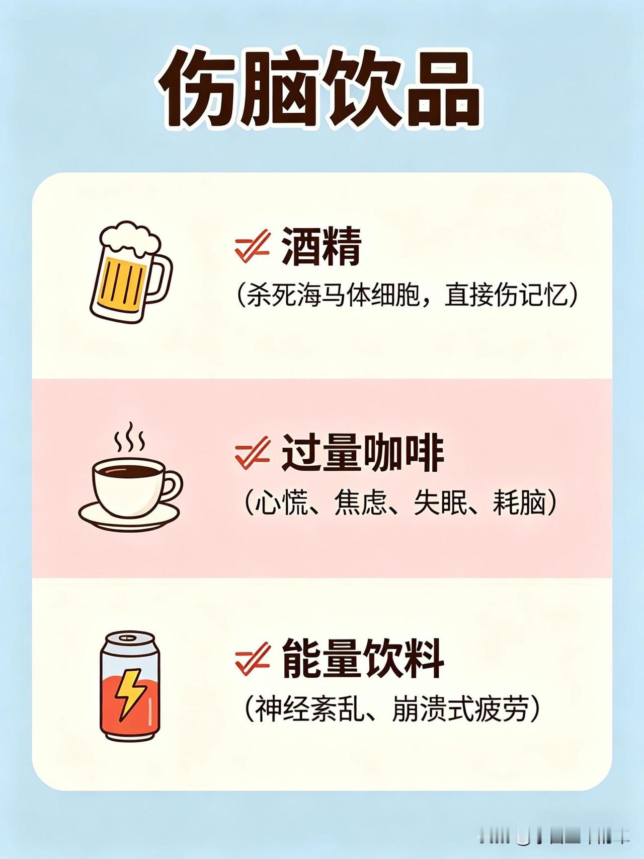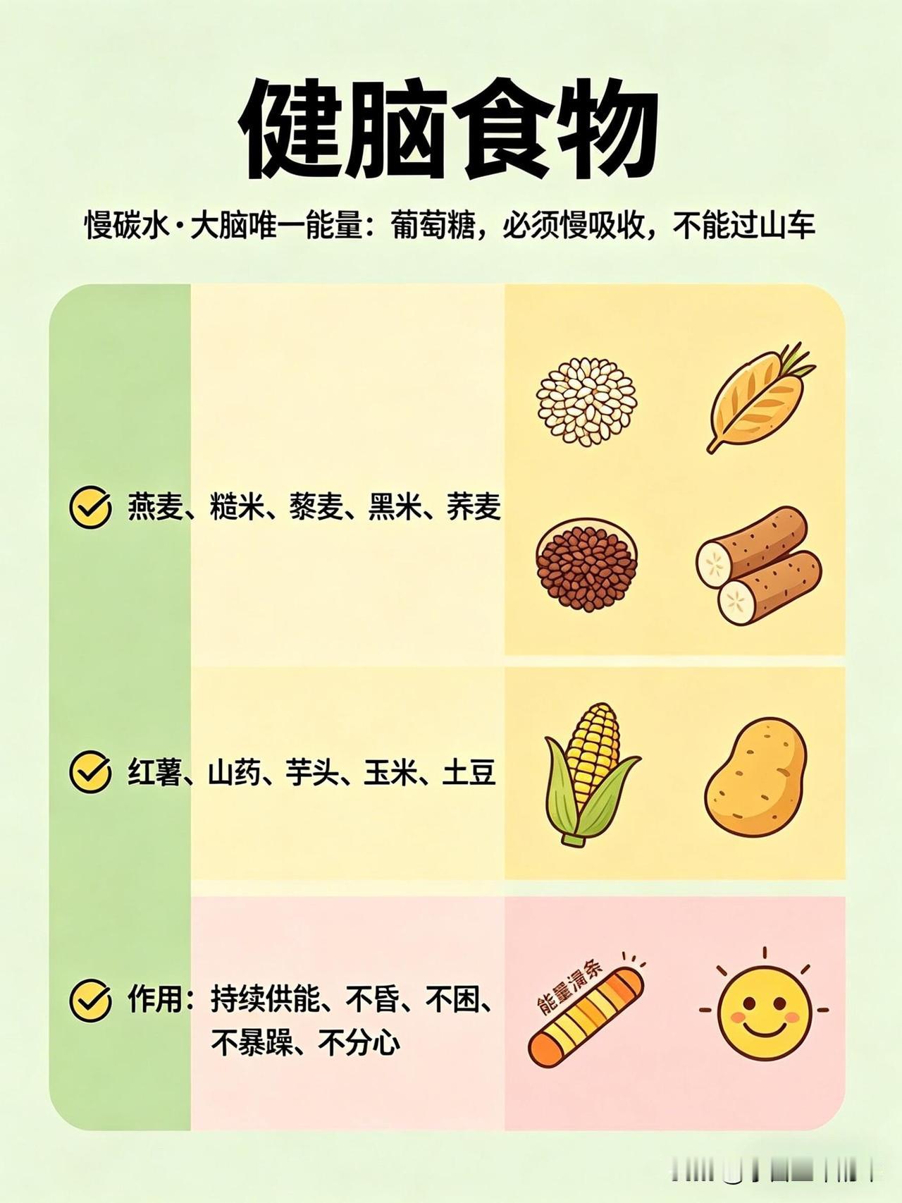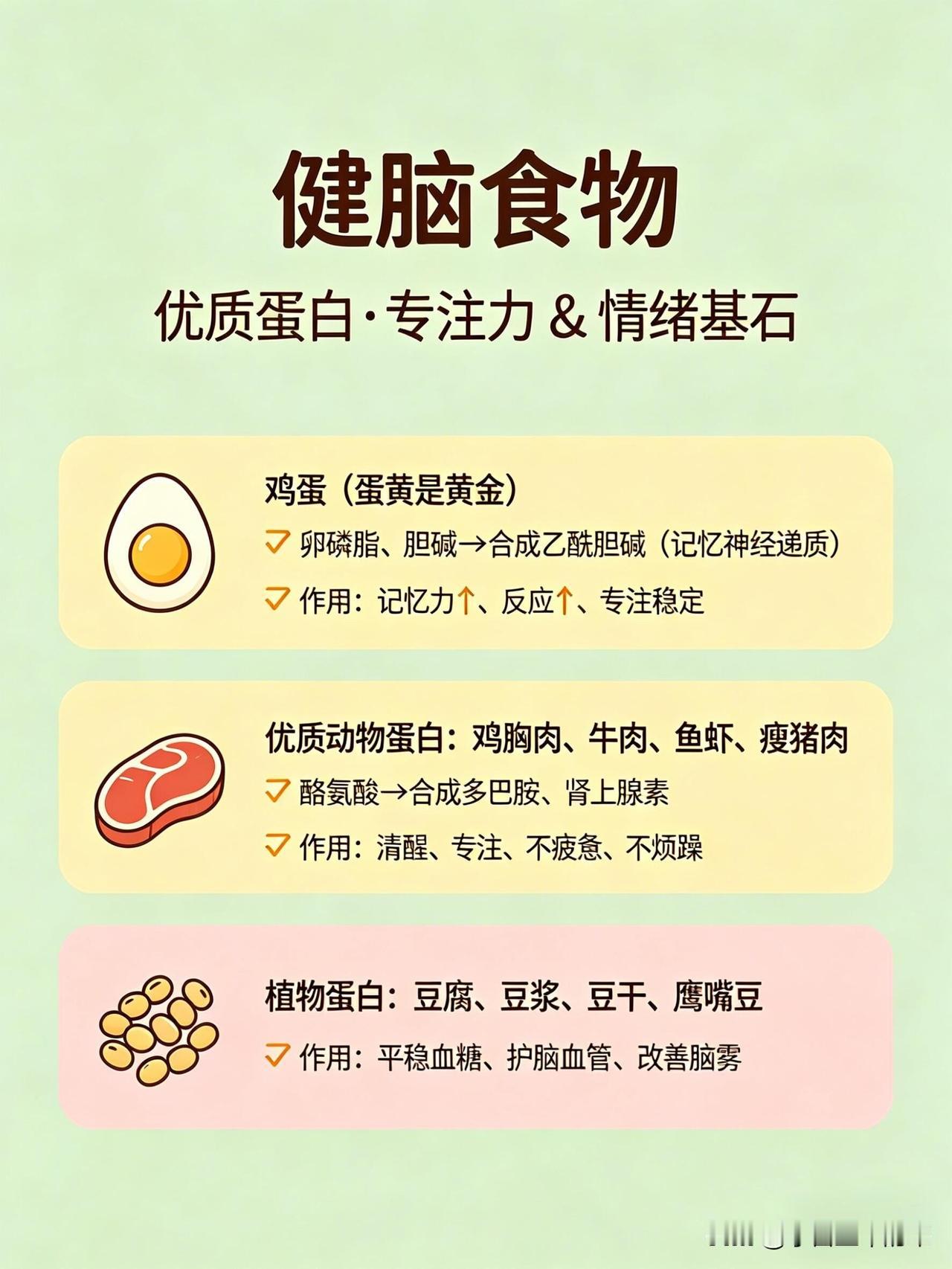 这份健脑vs伤脑饮食清单,帮你一眼看懂哪些食物养大脑、哪些会拖垮脑力👇 🧠 健脑食物:按营养分类,吃对了思路更清晰 1. 优质脂肪(大脑的“建筑材料”) • 深海鱼类:三文鱼、金枪鱼、沙丁鱼、秋刀鱼、鳕鱼。富含DHA+EPA,帮助构建神经细胞膜、提升记忆力、减少脑部炎症。 • 坚果类:核桃、杏仁、腰果、开心果、夏威夷果。补充Omega-3和维生素E,抗氧化、延缓脑衰老。 • 植物油与果类:牛油果、亚麻籽、奇亚籽、橄榄油、紫苏油。帮助提升专注力、平稳情绪、改善脑雾。 2. 抗氧化食物(保护神经元,延缓衰老) • 莓果类:蓝莓、草莓、黑莓、树莓。花青素含量高,清除自由基、延缓大脑老化、提升反应速度。 • 深色蔬菜:菠菜、西兰花、羽衣甘蓝、番茄、胡萝卜。富含叶酸、维生素A/C/E和叶黄素,保护脑细胞、改善记忆力。 • 黑巧克力(70%以上可可):黄酮类物质能扩张脑血管,提升大脑供氧量,让人心情愉悦、思维敏捷。 3. 优质蛋白(专注力与情绪的基石) • 鸡蛋:蛋黄中的卵磷脂和胆碱,是合成乙酰胆碱(记忆神经递质)的关键原料,能提升记忆力和反应力。 • 动物蛋白:鸡胸肉、牛肉、鱼虾、瘦猪肉。含酪氨酸,帮助合成多巴胺和肾上腺素,让人保持清醒专注、不易烦躁。 • 植物蛋白:豆腐、豆浆、豆干、鹰嘴豆。平稳血糖、保护脑血管、改善脑雾。 4. 慢碳水(大脑的稳定能量来源) • 全谷物:燕麦、糙米、藜麦、黑米、荞麦 • 薯类:红薯、山药、芋头、玉米、土豆 • 作用:缓慢释放葡萄糖,让大脑持续供能,避免昏沉、犯困和注意力分散。 5. 微量元素(大脑的“电池”) • 镁:抗焦虑、助眠、防走神,来源包括香蕉、杏仁、菠菜、黑巧克力等。 • B族维生素:防脑萎缩、抗疲劳,来源包括糙米、燕麦、动物肝脏、蛋黄、深绿色蔬菜。 • 锌:提升记忆力和反应速度,来源包括生蚝、南瓜子、牛肉、坚果。 • 维生素D:影响情绪和认知,来源包括深海鱼、晒太阳。 6. 健脑饮品 • 白开水(大脑75%是水,缺水会直接影响思维) • 纯牛奶/无糖酸奶(补充钙、蛋白和色氨酸) • 绿茶(含茶多酚,帮助清醒和抗氧化) • 豆浆(补充植物蛋白和卵磷脂) ⚠️ 伤脑食物:这些食物会悄悄拖垮脑力 1. 高糖食物(大脑的“第一杀手”) • 奶茶、果汁、可乐、甜饮 • 蛋糕、饼干、糖果、甜点 • 精制碳水:白面包、白馒头、白面条 • 危害:血糖骤升骤降,导致大脑缺氧、昏沉易怒、健忘,长期会损伤脑细胞、加重脑部炎症。 2. 油炸与反式脂肪 • 炸鸡、薯条、油条、油饼 • 酥皮点心、奶油蛋糕、起酥面包 • 方便面、薯片、快餐 • 危害:引发炎症、损伤脑血管,导致大脑供血下降,反应变慢、记忆力衰退。 3. 高盐食物 • 咸菜、腌菜、咸鱼、腊肉 • 重盐外卖、卤味、泡面 • 危害:升高血压,损伤脑部微血管,导致记忆力下降、头晕。 4. 精加工食品 • 火腿、香肠、培根、腊肉 • 罐头、酱料、零食、速冻食品 • 过量的味精、鸡精 • 危害:添加剂加重肝肾负担,影响大脑供能,导致注意力涣散、情绪波动和脑雾。 5. 伤脑饮品 • 酒精(会杀死海马体细胞,直接损伤记忆) • 过量咖啡(易引发心慌、焦虑、失眠,消耗脑力) • 能量饮料(导致神经紊乱、崩溃式疲劳) 💡 小贴士:不用刻意追求某一种“超级食物”,关键是长期保持均衡饮食,多吃天然、少加工的食物,减少高糖、高油、高盐的摄入,大脑才能一直保持在线状态。