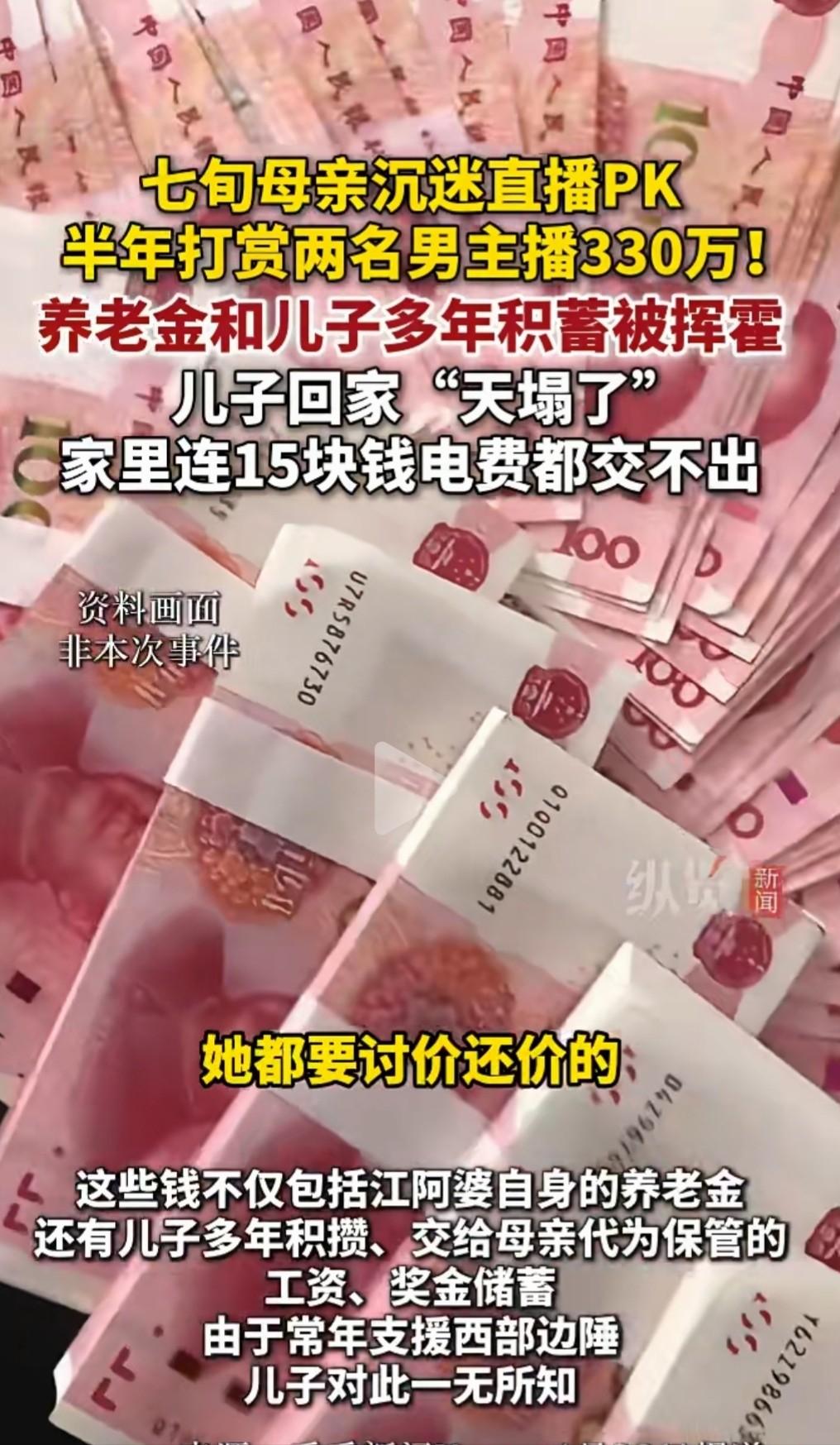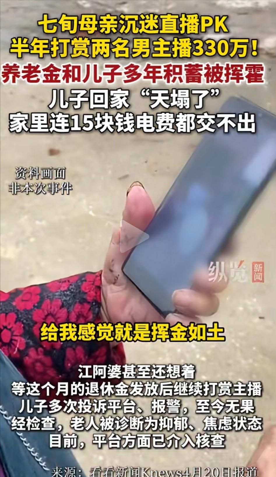 悲剧还是发生了!上海,70多岁的单身老太太,没人陪她,她太缺爱了,疯狂迷上了网上俩年轻男人,男人的温柔乡把老太太哄得团团转,她沉迷当“大姐”的快乐无法自拔,半年内掏光家底330万,最后穷的连几块钱的电费都交不上了! 336万,就这么没了。 上海一位七旬老人平日生活极度节俭,买菜时就连几毛钱的差价都会反复计较。可她沉迷直播仅半年,就将巨额积蓄,尽数挥霍,悉数打赏给了两名男性网络主播。单个虚拟礼物价值三千元,她出手却格外阔绰。 动辄一次性连刷三四个,丝毫没有犹豫,花钱完全不带迟疑,出手十分大方。最后,窘迫到连十几元的电费都无力缴纳,生活已然陷入拮据。可即便处境这般艰难,他依旧心心念念,只盼着养老金发放后,继续给他人充值打赏。 这事听起来荒诞,但荒诞背后藏着一套精密的情感收割系统。 江阿婆丧偶多年,儿子常年驻守边疆,一个人过日子。某天闲暇刷手机时,她偶然刷到一位男主播的唱歌片段。对方嗓音温润,言辞温柔又饱含深情,字字句句都格外戳心,瞬间打动了她,让她心生触动。自那之后,这位往日总爱出门散步闲逛的老人性情大变,整日寸步不离抱着手机,整日精神萎靡,连饭菜也没了胃口,日渐沉默消沉。 后来她又认识了另一个跳舞男主播,同样的套路再来一遍,她照单全收。两个男人构建出来的虚假陪伴感,让她觉得自己还被人需要着、惦记着。这种感觉太久违了,她舍不得放手。 钱是怎么没的?大头砸进了跳舞主播的直播间,另外50多万给了唱歌的那个。她不仅耗尽了毕生积攒的全部积蓄,就连儿子托付给她代为保管的钱财,也一并填了进去,尽数付诸一空。 儿子远赴边疆务工,难得归家探望母亲,无意间查到账单,才惊觉真相。望着母亲日积月累的高额打赏流水,一笔笔数额触目惊心,眼前的一幕,瞬间让他整个人错愕不已,难以接受。他带母亲去做精神鉴定,结果显示老人处于焦虑、抑郁状态。 眼下最关键的疑问来了,这笔高达336万的款项,究竟还有没有追回的希望,后续能否顺利全额要回来? 从法律层面来看分两种情形:若江阿婆具备完全民事行为能力,主动打赏属于自愿民事行为,依法无法要求返还;但如果她的焦虑抑郁严重到影响了判断力和自控力,那她就属于限制民事行为能力人,打赏行为可能被认定无效,钱就有希望追回。 难点在于举证。单纯年龄大不构成理由,得证明她在每一笔打赏发生时,精神状态已经严重到无法正常判断。这个时间线拉了半年,每一笔都要界定,难度可想而知。 更麻烦的是老人自己的态度。家人越指责,她反而越护着那两个主播。不是她真糊涂到底,是她不愿承认自己的孤独被人看穿了,不愿承认自己花大钱买的只是几句好听话。这种羞耻感,比损失本身还难受。 这类骗局早就不是单纯骗钱了。其本质是刻意维系人情牵绊,刻意制造情感依附,再借着群体情绪造势,精准批量拿捏、收割大众心绪,暗藏功利算计。 过去保健品推销多靠人员上门兜售,如今则变成平台算法精准投喂。加上AI换脸、模拟人声技术泛滥,虚实影像与真假人声交织,人和虚拟形象的边界愈发模糊难辨。从一对一围猎进化成系统化筛选,老人爱看什么、容易被什么打动,很快就被摸清。 问题的根子不在老人糊涂,在于整个社会对老年孤独的忽视。不少子女误以为按时给足生活费,就算尽到赡养责任。殊不知老人即便手头不缺钱,情感上却倍感孤单,缺少陪伴与牵挂,内心依旧空虚落寞,晚年生活难有真正的安稳与温暖。家里人不去填那块空地方,外面就会有人盯上。 江阿婆丧失的不只是钱,是安全感、价值感和被需要的感觉。当一个70岁的老人只能从屏幕里找到存在感,谁才是真正的帮凶? 治这类事,光靠老人提高警惕远远不够。家庭陪伴、社区接住、平台约束,一个都不能少。否则类似的事只会一桩接一桩,下一个江阿婆随时可能出现。 参考信息:新闻坊.(2026,4月20日).为赢PK刷光家底!七旬老妪狂撒336万,儿子:怎么有这样的妈…….环球网.