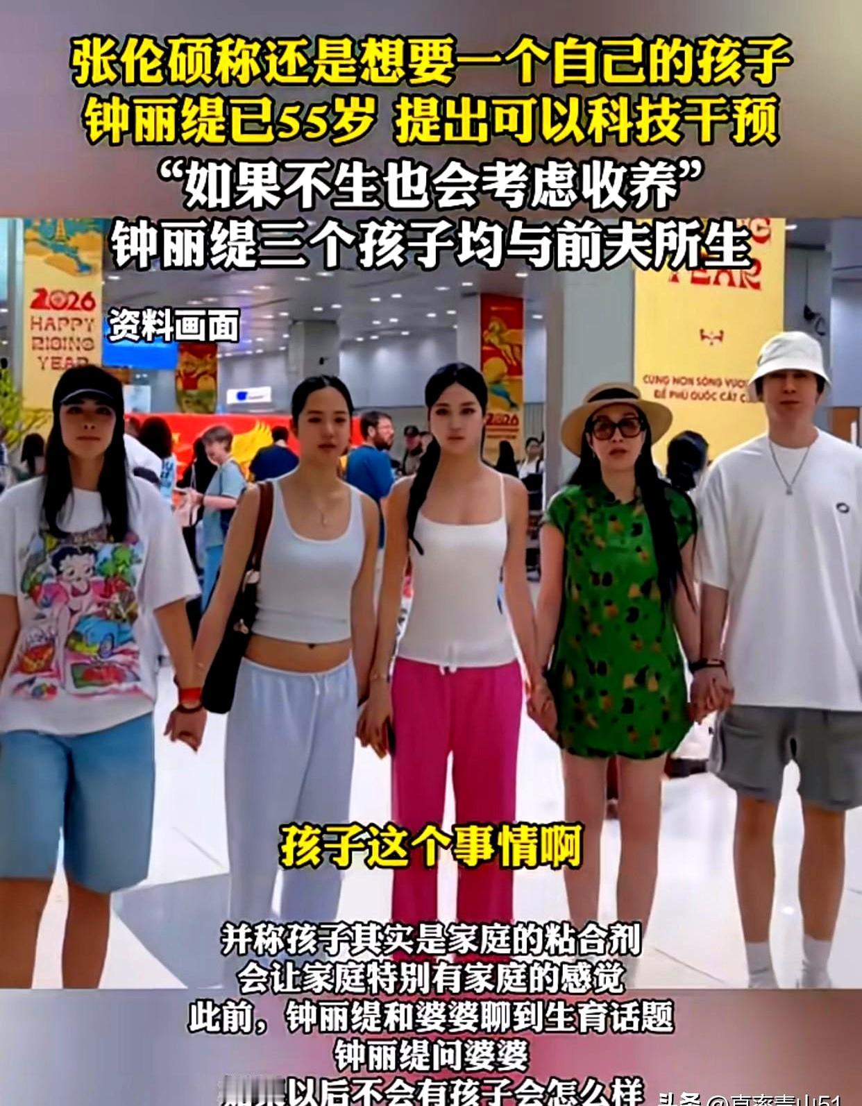 55岁还在拼四胎? 这事儿听着都让人捏把汗! 钟丽缇上节目聊财产分配时,突然提了一句“可能还有第四个”,旁边43岁的张伦硕立马接话,说可以靠科技或者收养,还念叨孩子是家庭粘合剂。 说白了,这想法让不少人听着就来气,一个家幸福不幸福,难道非得靠多生个娃来盖章认证? 想想钟丽缇当年可是《人鱼传说》里美到发光的人鱼公主,现在都抱仨闺女了,身体也不比年轻时候,她自己更想好好陪女儿长大。 这不就跟咱身边那些催生亲戚一个味儿吗,逢年过节饭桌上总有人叨叨“再添一个更热闹”,可生孩子又不是拼业绩指标。 大家觉得,夫妻俩想法不一样的时候,该谁让步?