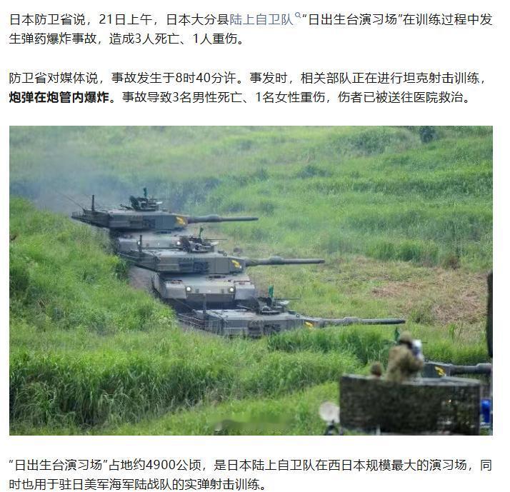 小日本,居然还有喜讯! 日本陆上自卫队搞射击演练,发生弹药爆炸!3人噶,1人重伤。重伤的是女兵,噶掉的是男兵。 按照日本的说法,炮弹是在坦克的炮管内爆炸的! 所以,这是一个坦克乘组,玩炮弹装填出现了巨大失误? 演练地点是出生台演习场,这是哪支部队,如此神勇,放个炮都能献祭三头大兵? 很久之前写长文分析过日本自卫队,整个日本,除了北海道的第7师团是装甲师团之外,就只剩下东京附近的14旅团装备了10式坦克。 所以,这是14旅团的部队在这搞训练,然后发生炸膛了。 10式坦克是自动装弹机装弹,弹药存放于炮塔尾舱,与乘员舱隔离。这款坦克2012年开始服役,算是小日子的新锐品种。 按道理,10式坦克是3人车组,咋会有一个女兵呢? 原来,日本搞射击,会有一个摇旗子的女兵,站炮塔口那报靶! 这个就很好理解了,日军进行炮弹射击,3人乘组在车里,女兵报靶员在车外。然后,喜闻乐见的消息——炸膛了。 估计车里三人瞬间被弹片扎透被火烤8分熟,剩下的女兵报靶员半身露车外所以捡了半条命和半个身子。 至于原因嘛———嗯,说出来又觉得好笑,日本的10式主战坦克的炮膛,是人工加工的!对,“工匠技艺”,百年传承! 这话是日本人自己说的! 常在河边走,哪有不湿鞋!工匠技艺撞大运了,卡住炮弹了!
