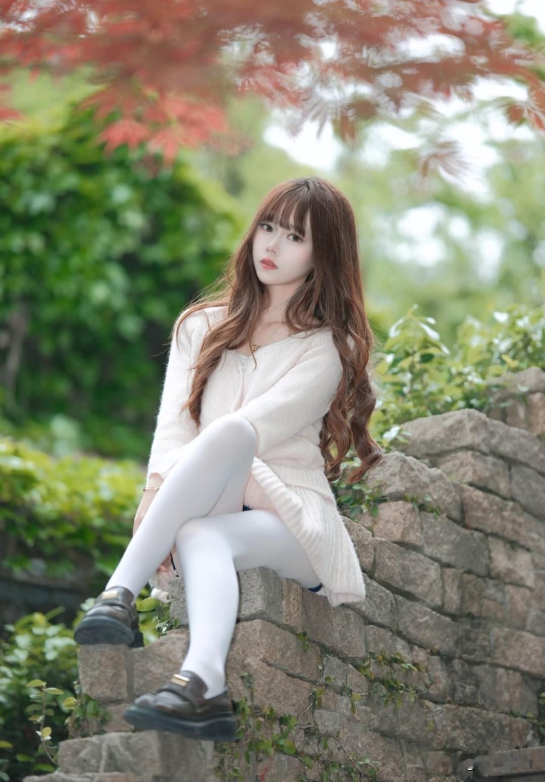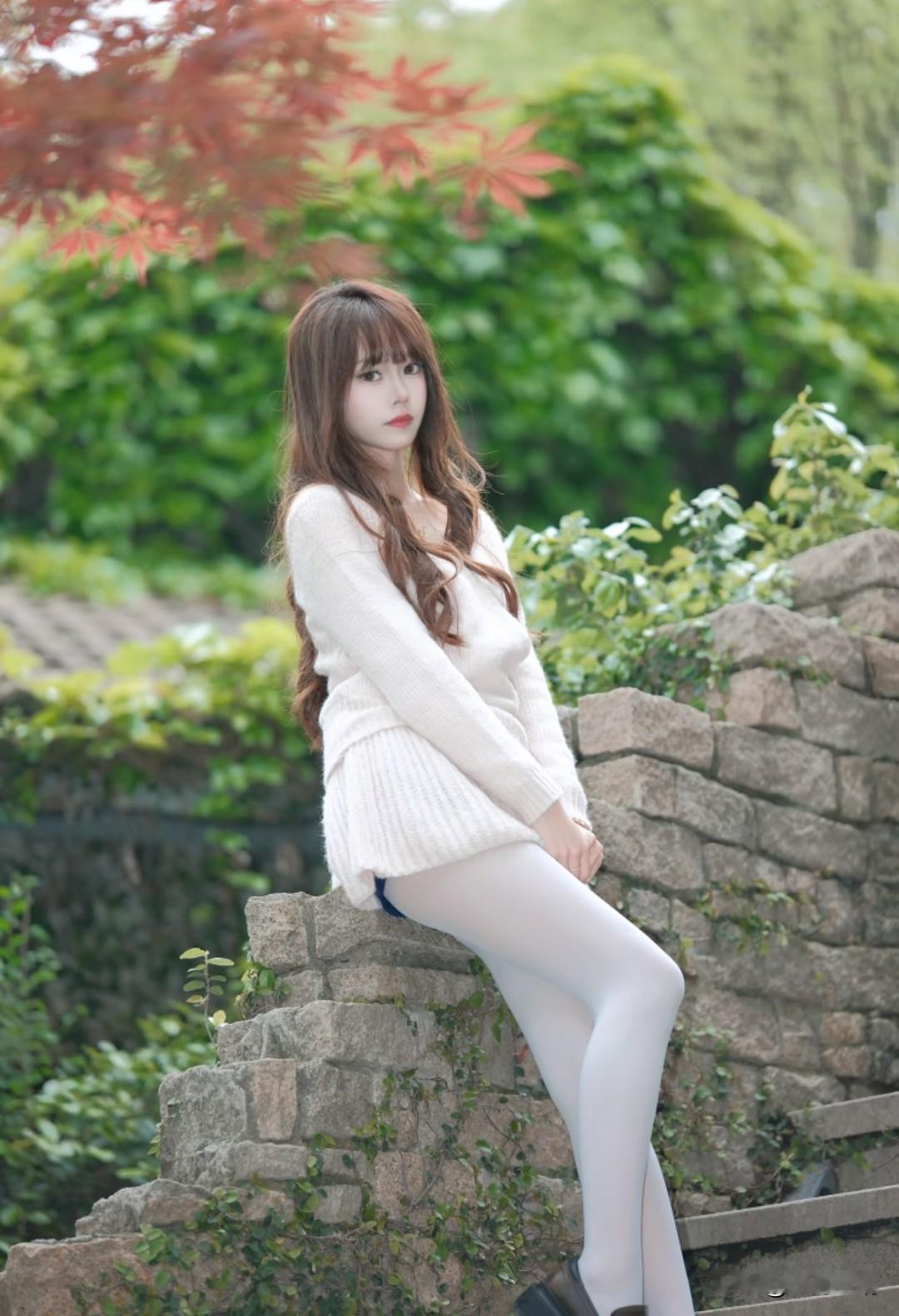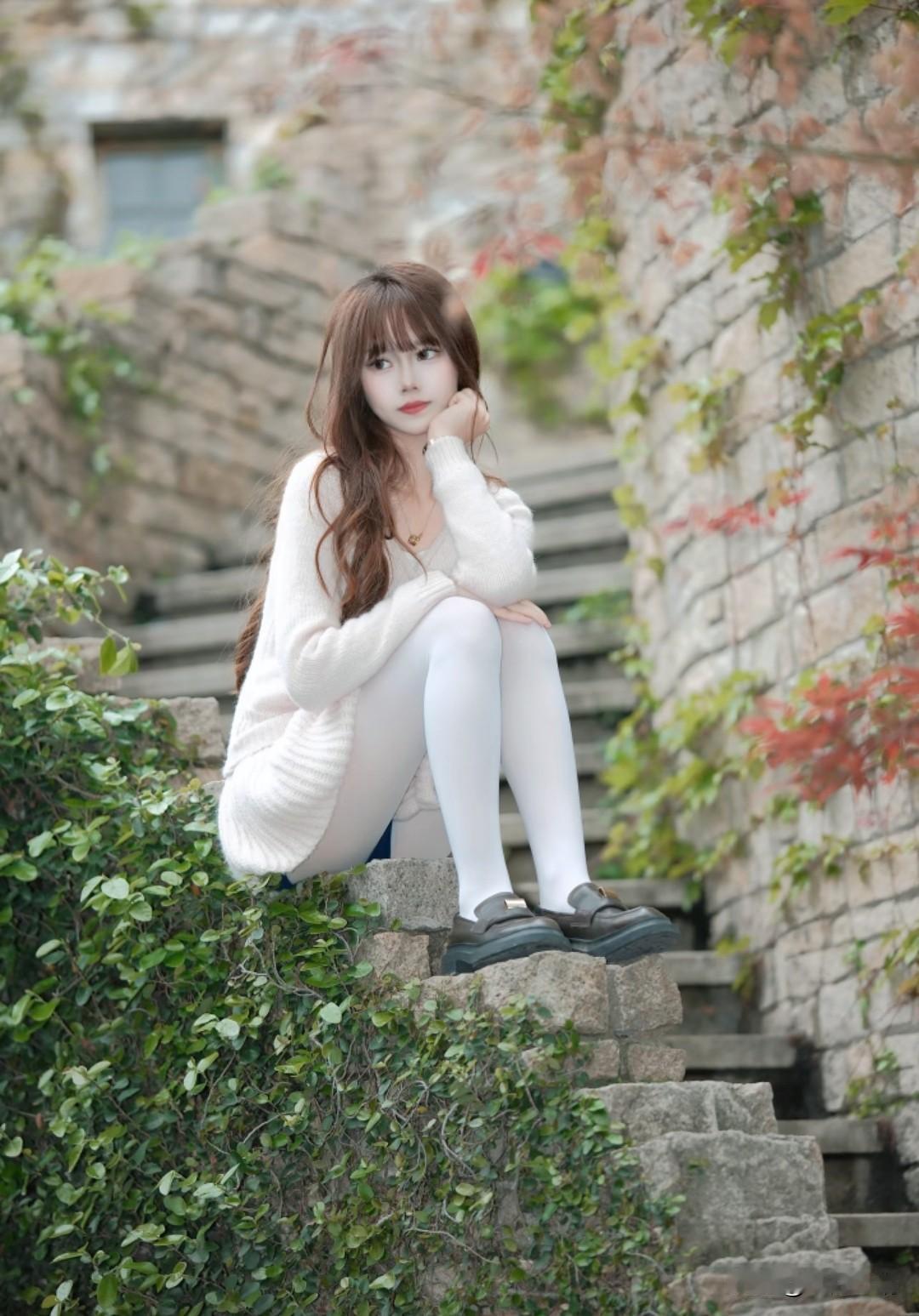 藏在石墙藤蔓里的温柔,米白毛衣配白丝,秋日氛围感直接拉满