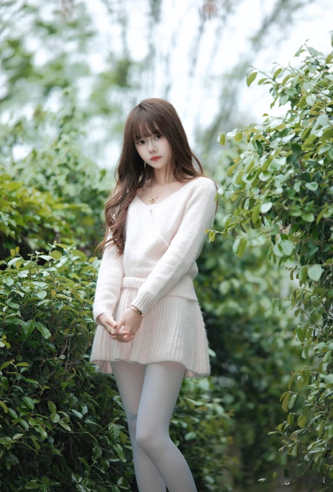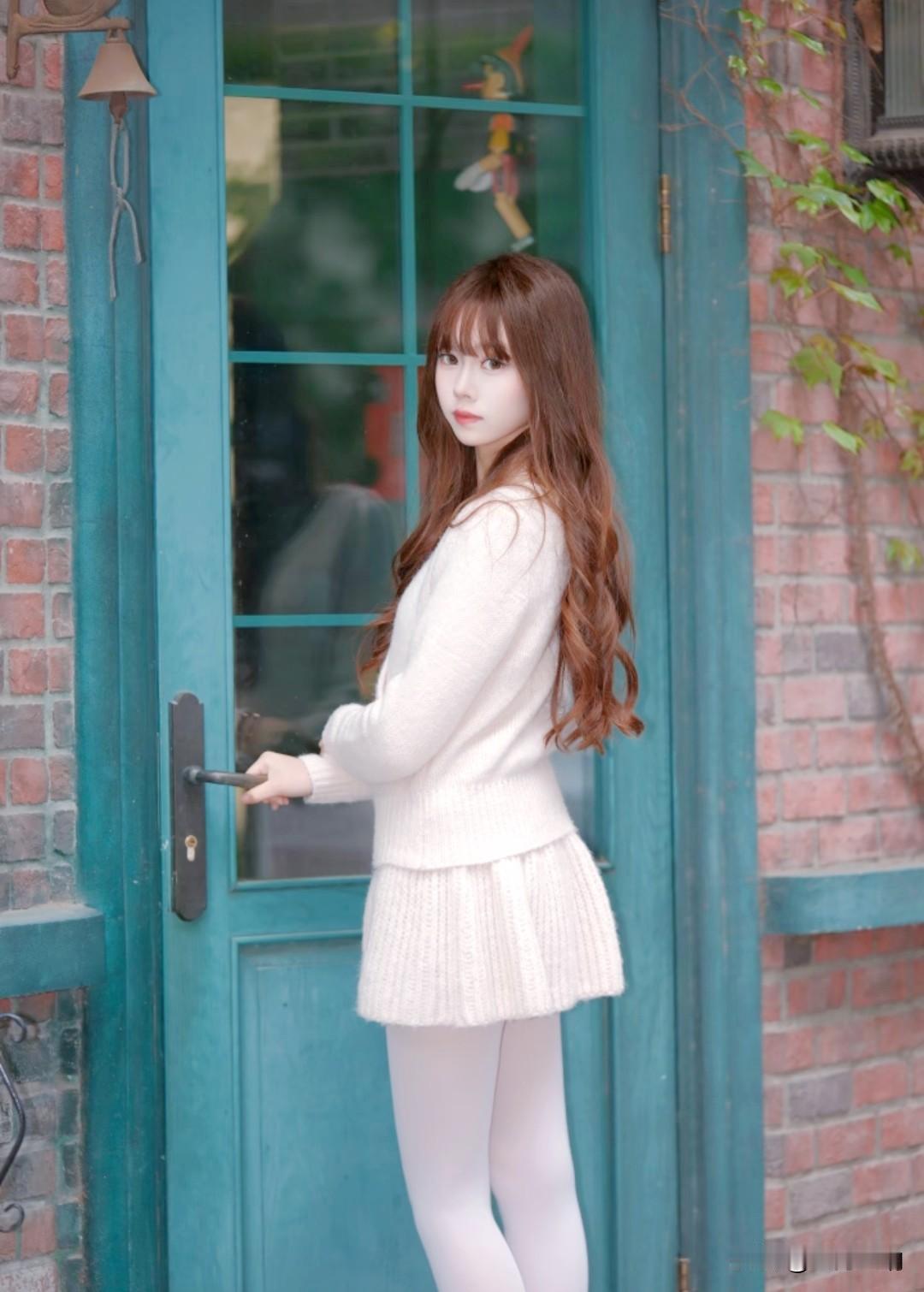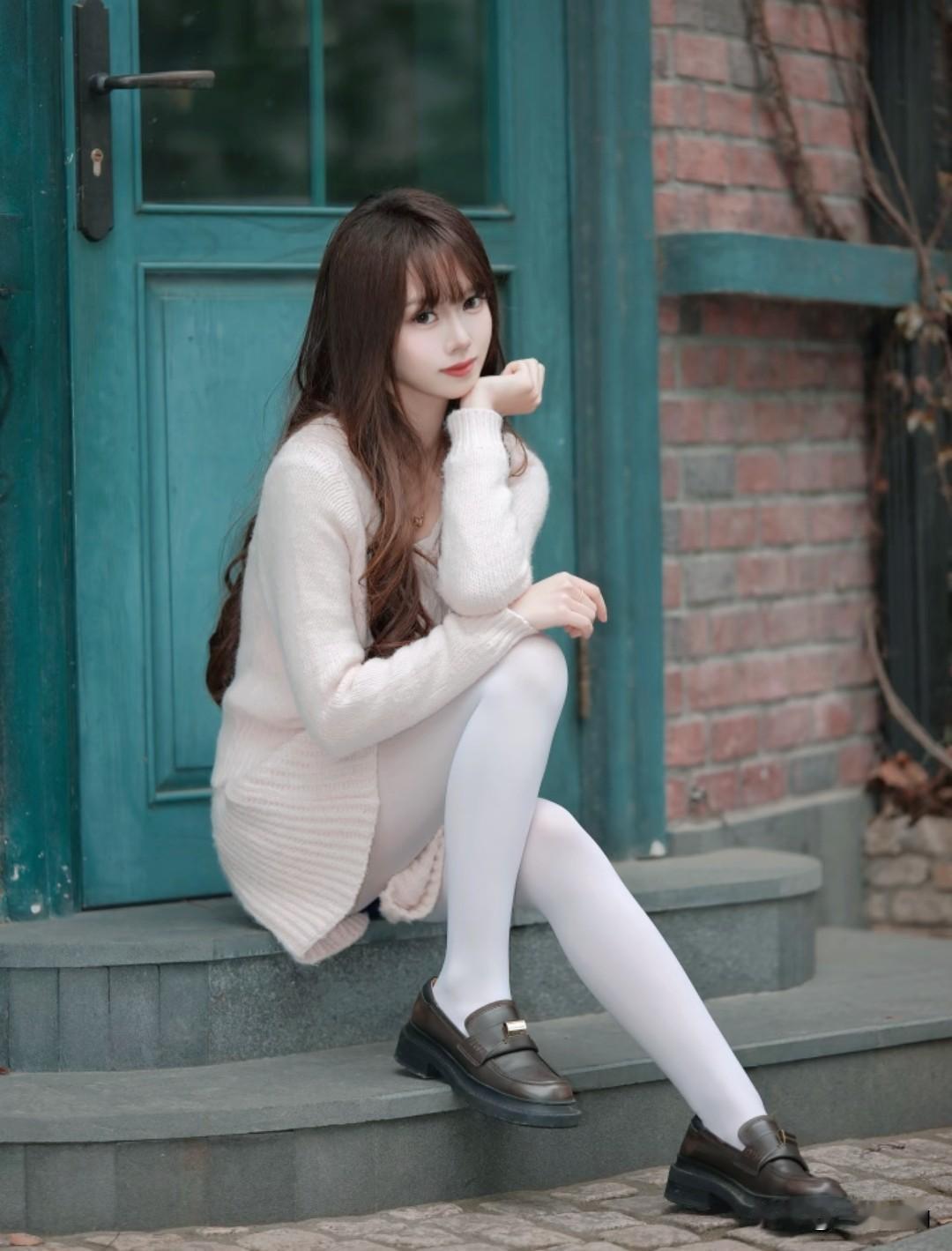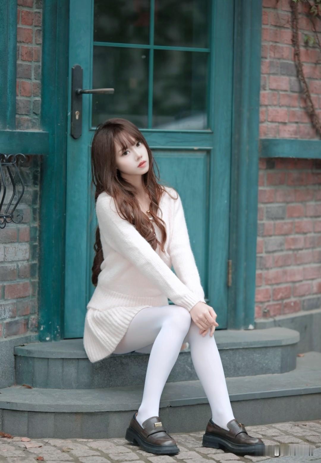 藏在石墙藤蔓里的温柔,米白毛衣配白丝,秋日氛围感直接拉满