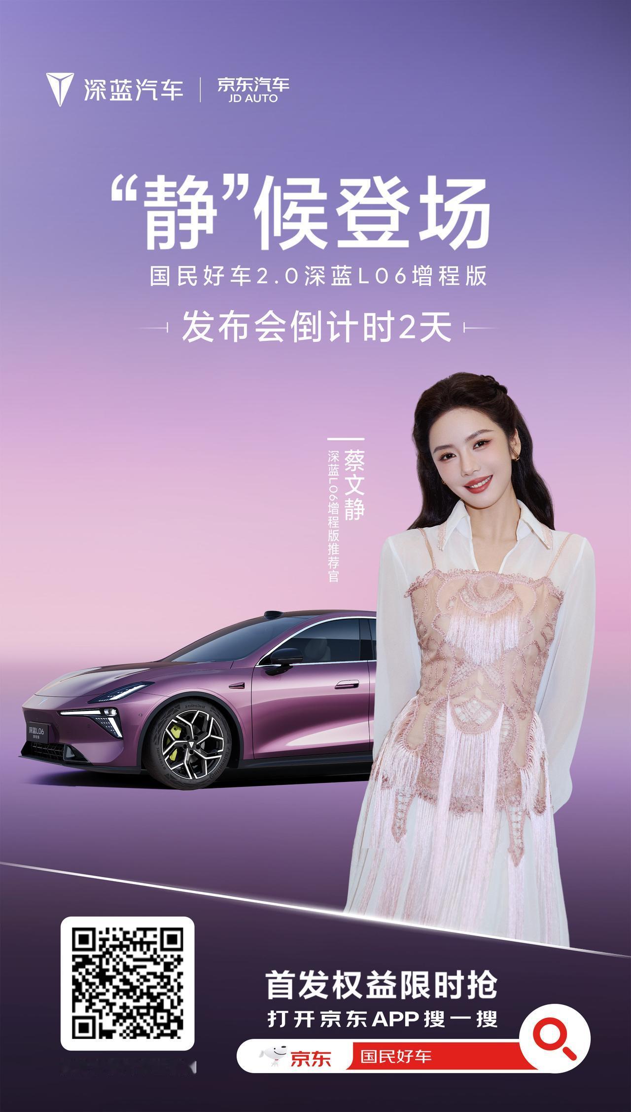 深蓝L06增程版发布会倒计时2天! 📢这次@蔡文静 不写小说、不打卡粤语 而是“静”候登场,解锁新科技 👉首发权益限时抢上京东搜索「国民好车」预约发布会 国民好车2.0