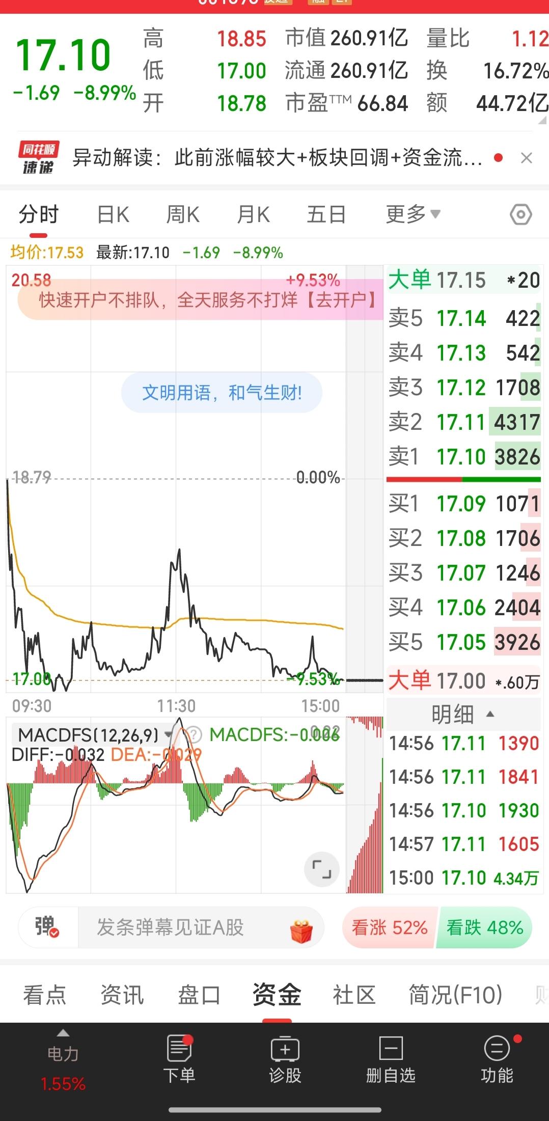 今天电力板块涨那么好他却反向而行,大好形势居然将近跌停了,接近尾盘的时候果断抄底了,我就不相信在里面喝不到一点汤!他可是前期电力板块的龙头,也可以说是整个板块的风向标,就在昨天他也涨停了,可今天开盘却一直趴在水下。我想整个板块涨那么好他不可能就此废掉,他今天只是获利回吐一个洗盘的过程,明天应该会修复然后重拾升势!大家都知道我今天是在华电负5个点卖的,卖了之后看到它涨停就后悔,今天在华电没有吃到肉肉,明天在这支票上一定能赚点银子,大家等着瞧好了。说的不好听一点我也就万把块钱,希望这点筹码不要被主力给盯到了,他和华电两个玩跷跷板效应,明天开始他的表现,你们觉得呢?大家都说别人恐惧的时候我们要贪婪,今天就赌上这么一回,明天看正确率怎么样?