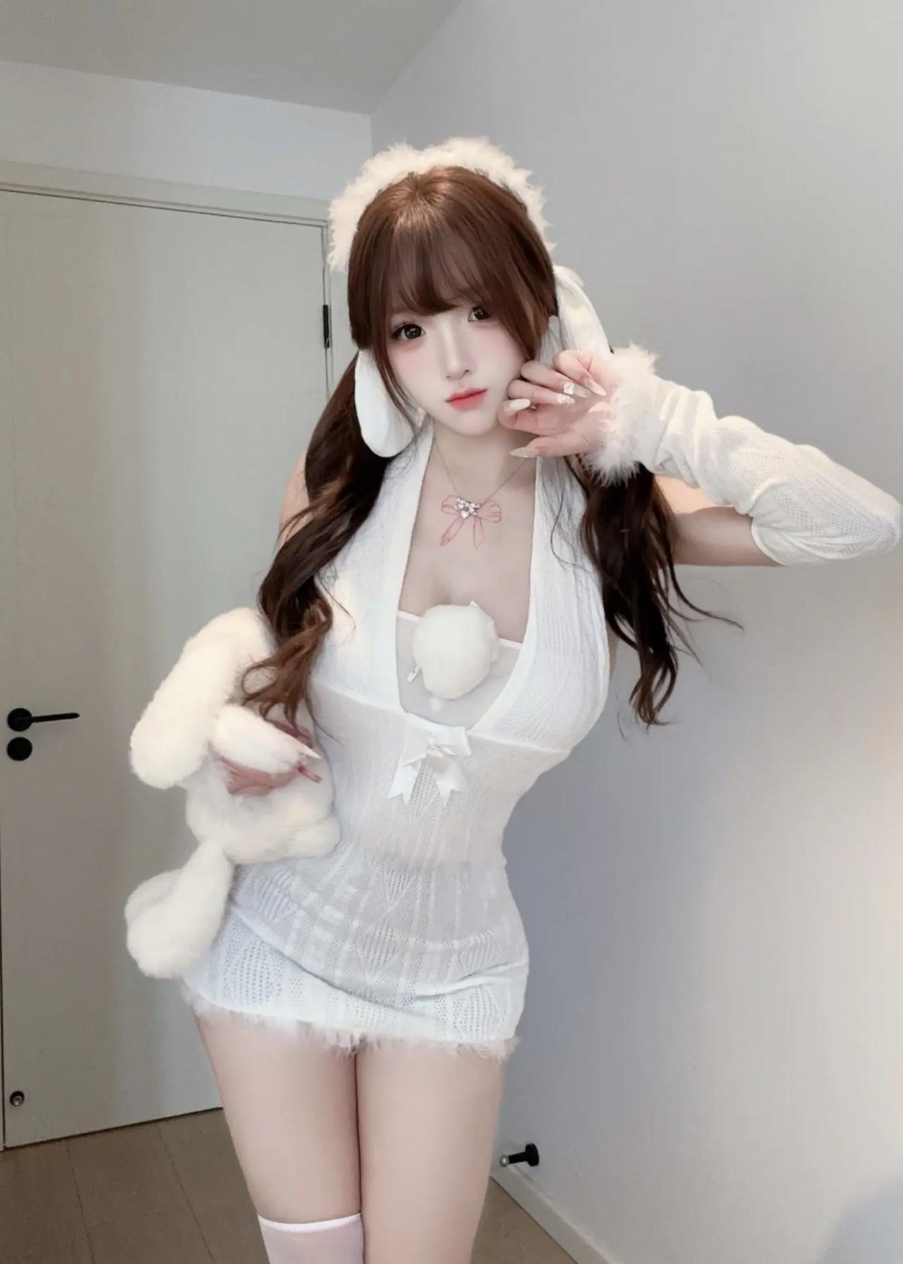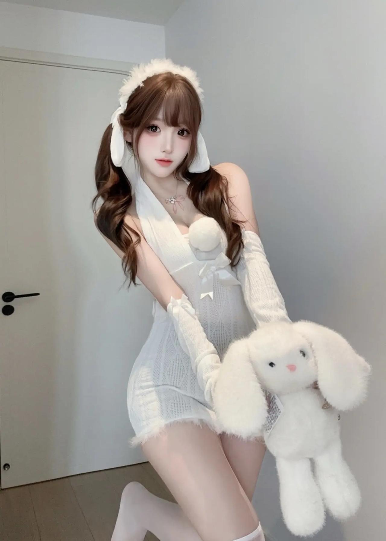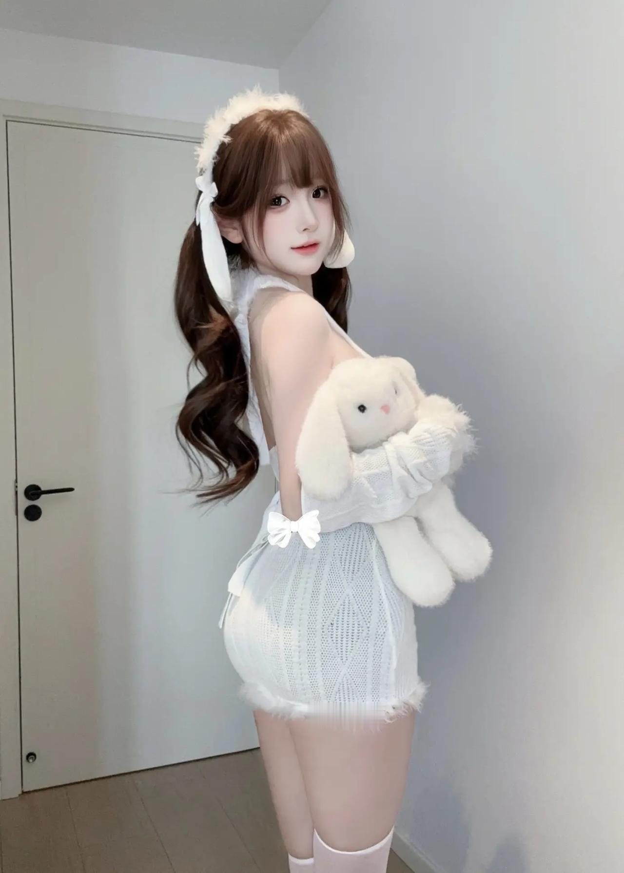 不用去漫展,在家也能拍出“兔娘”氛围感!白色毛绒发箍+露肩针织裙,慵懒中带着小性感~背景白墙+木门当背景,随手一拍都是软萌壁纸! 居家拍照 兔娘写真 纯欲风 少女感