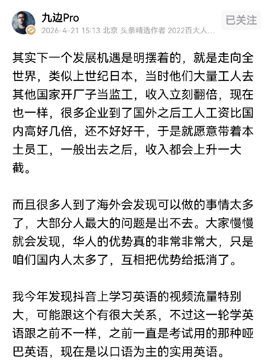 走出去一定没有在国内发展安全,这是一定的,哪怕现在出去的利润更高,但这种利润是没有保障的,哪怕你在海外已经定居几代人,你自认为自己也是当地人了也没用,印尼惨案就是例子。 所以除非万不得已,在国内确实没有前途了再选择出去,只要有一代人在国内搞成了,未来几代人都会受益,在生活安全上,中国在世界上就是最安全的。