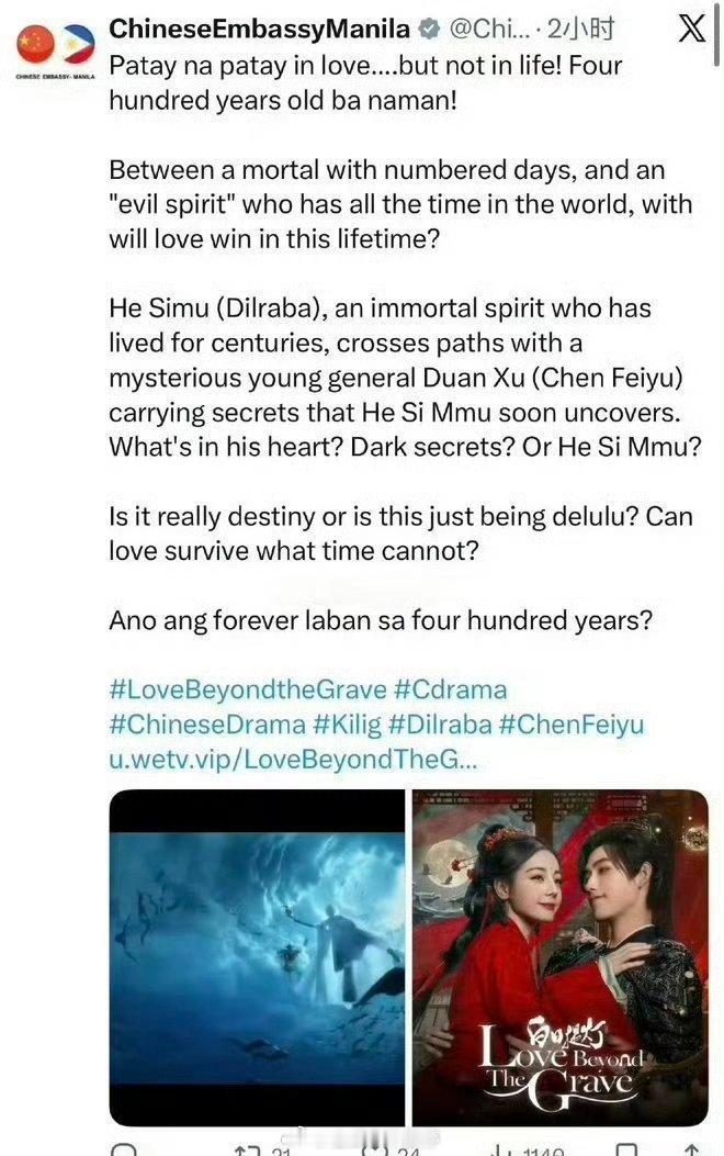 中国驻菲律宾大使馆在平台分享迪丽热巴 陈飞宇《白日提灯》相关内容,好🔥