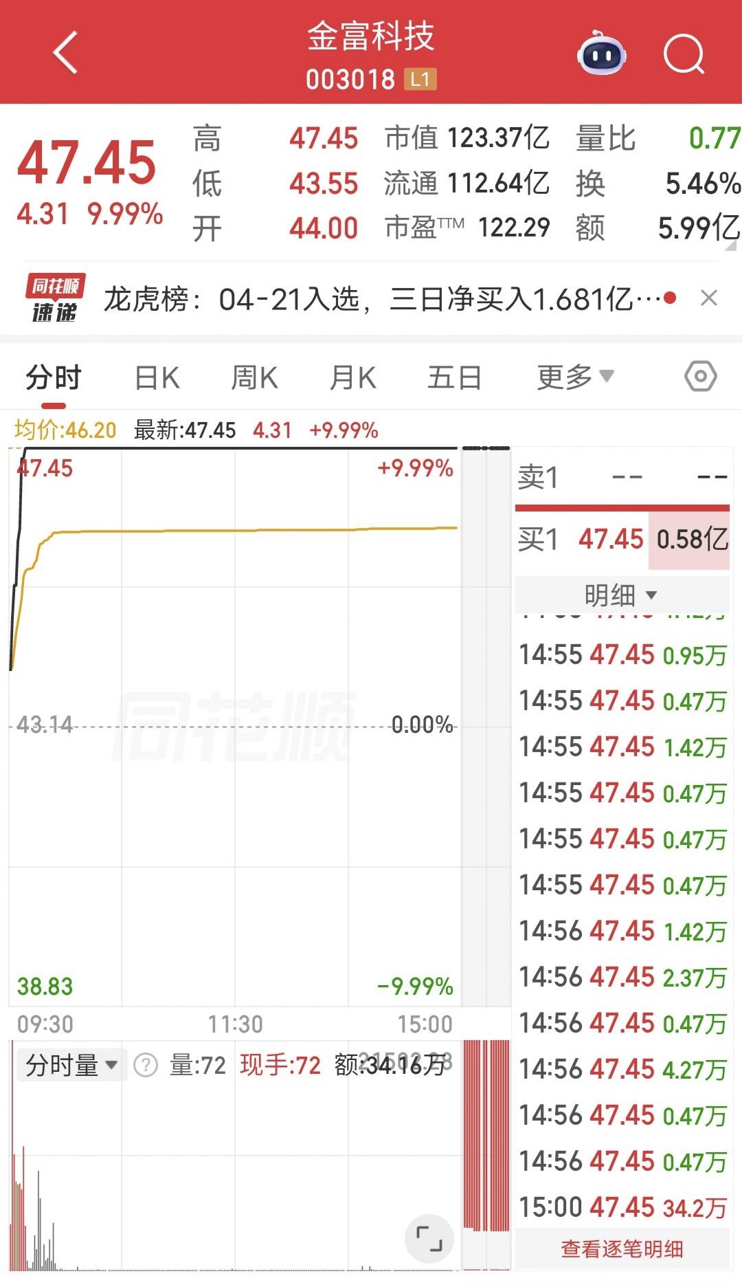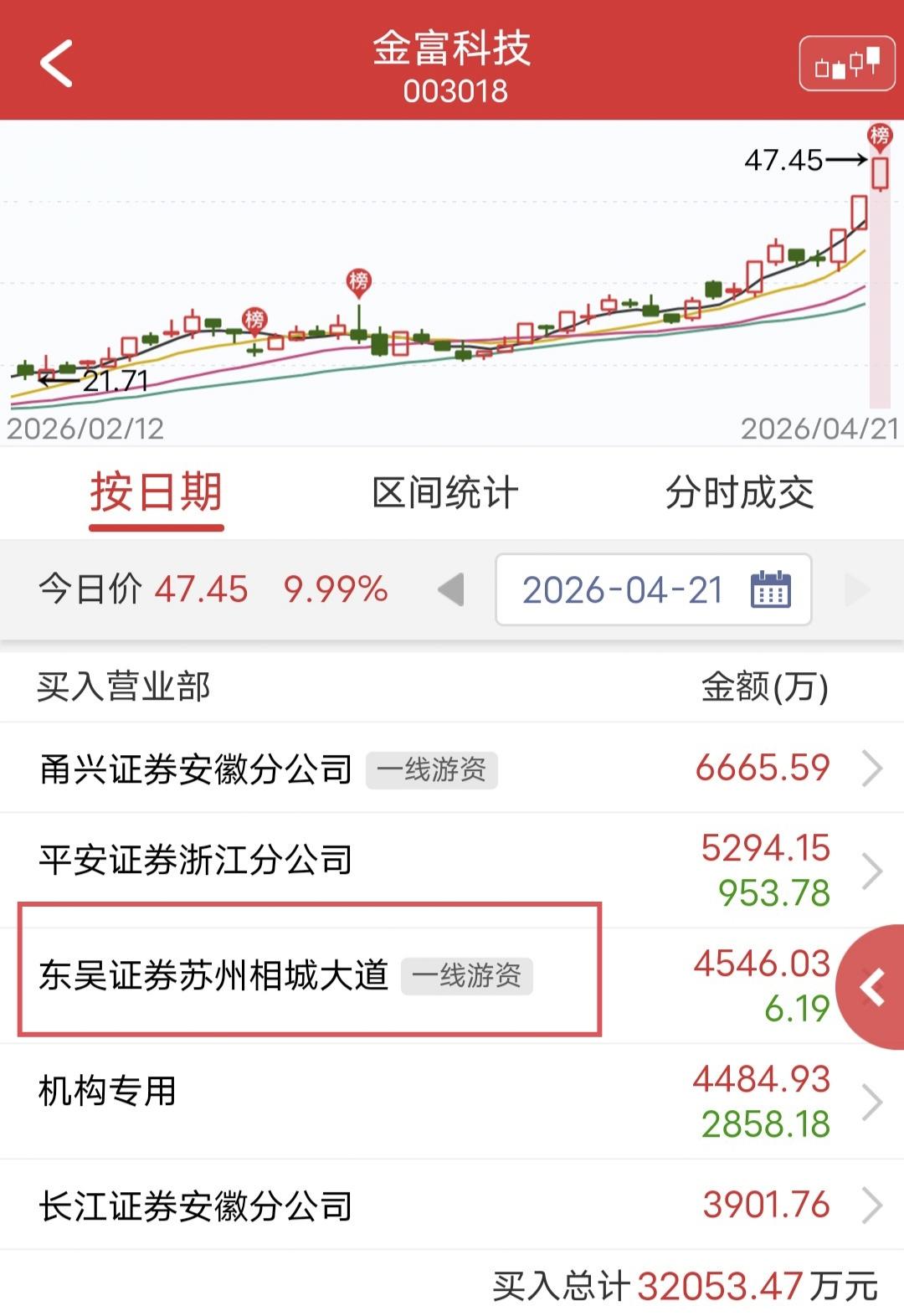 久未露面的相城大道出手4500万! 今天金富科技开盘快速涨停。 盘后龙虎榜显示,相城大道买入4500万。 好久没看到相城大道(余哥)出手了。