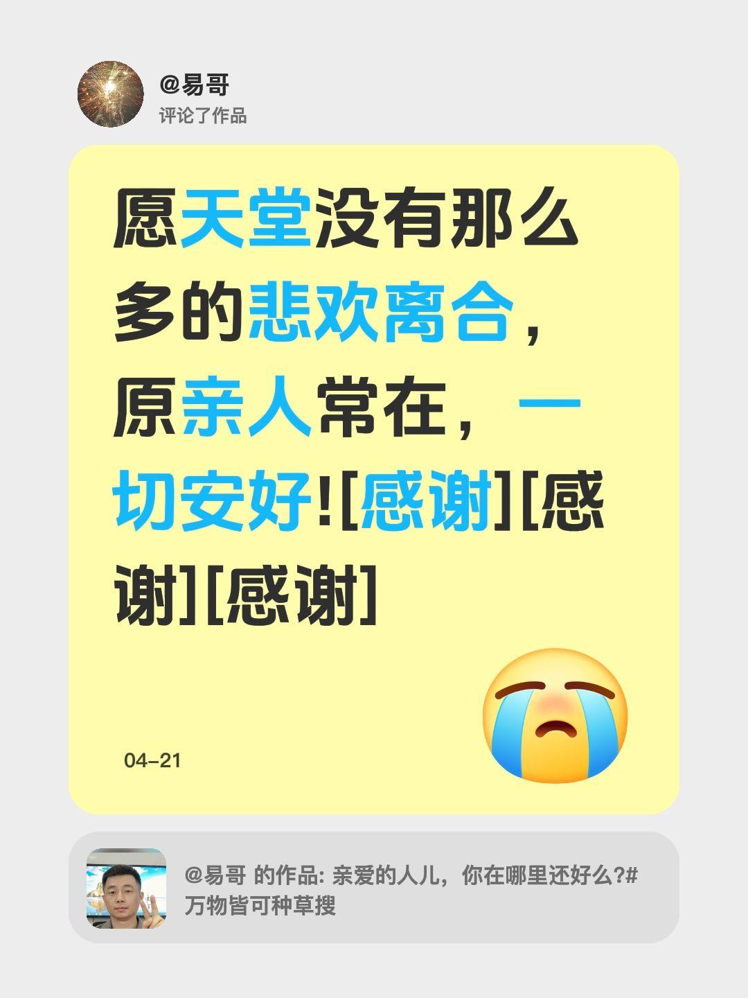 我评论了@易哥 的作品: 愿天堂没有那么多的悲欢离合,原亲人常在,一切安好![感谢][感谢][感谢]