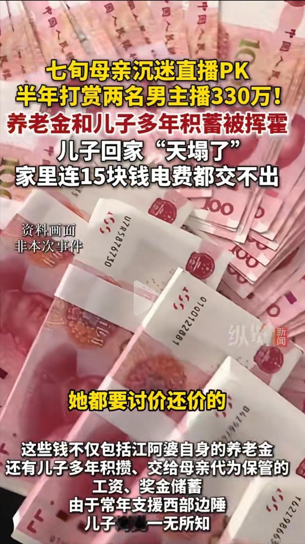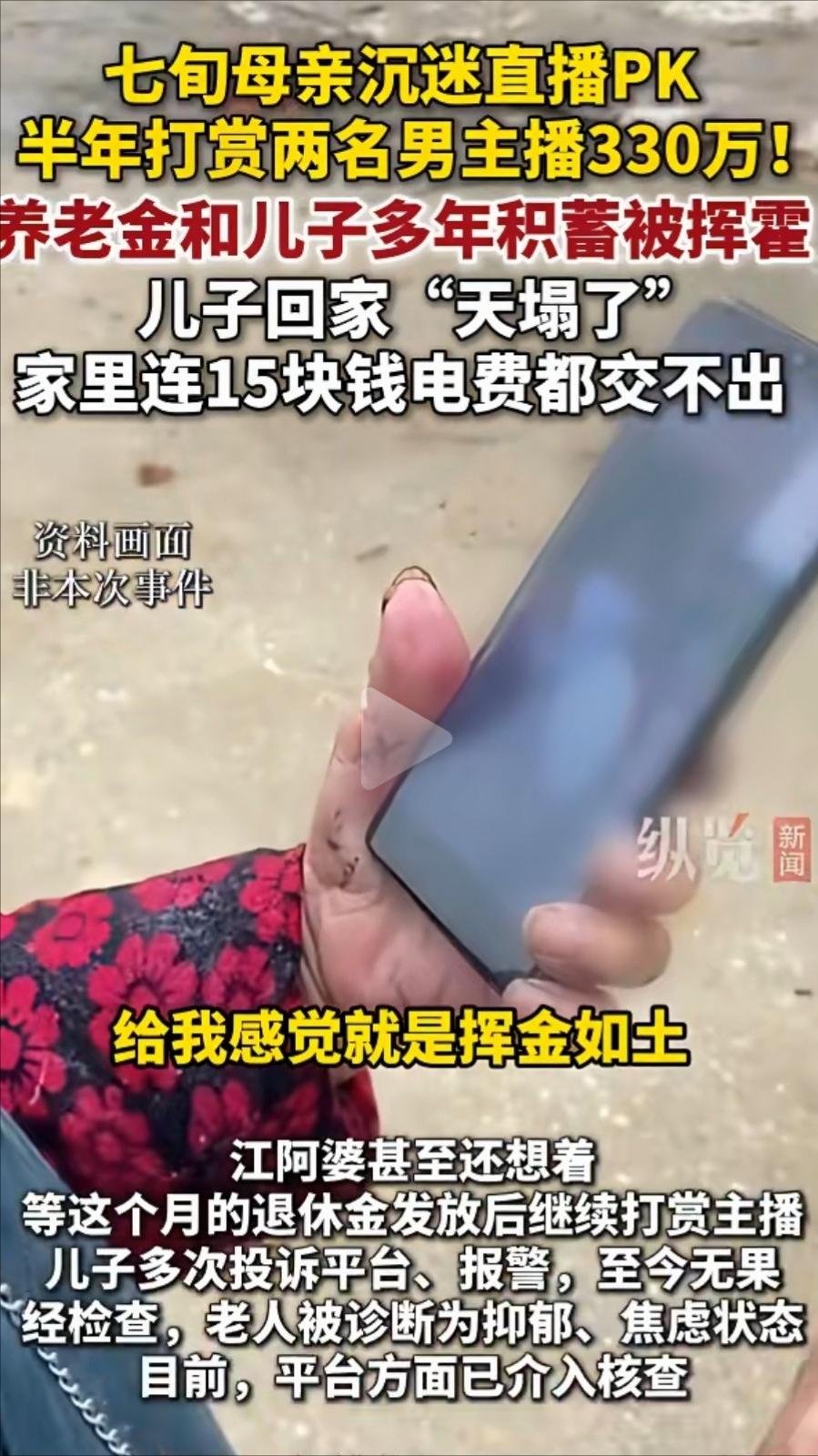 [中国赞]上海,70多岁的单身老太太,没人陪她,她太缺爱了,疯狂迷上了网上俩年轻男人,男人的温柔乡把老太太哄得团团转,她沉迷当“大姐”的快乐无法自拔,半年内掏光家底330万,最后穷的连几块钱的电费都交不上了! (信源:纵览新闻) 一场虚假线上陪伴和情感骗局,让上海70岁独居老太付出惨痛代价。她丧偶多年、儿子在外,常年孤独空虚,刷短视频结识两名年轻男主播,被温柔话术和虚假陪伴打动,陷入情感依赖。 平日省吃俭用的她,半年内疯狂打赏330万元,耗尽自己养老积蓄和儿子存款,穷困到交不起电费仍执念打赏,令人痛心唏嘘。 这位70岁老太丧偶后独居上海老房子,儿子为生计常年在外,一年难得回家几次。独居时无家人陪伴、邻里往来,老人内心孤独空虚、精神匮乏,变得沉默寡言,对生活失去热情。短视频普及后,老人学会刷视频,本想打发时间,却坠入无法挽回的情感陷阱。 一次偶然的机会,老人刷到了两名年轻男主播的直播间,镜头前的他们,言语温柔、态度体贴,一口一个“阿姨”“奶奶”地称呼,耐心倾听老人的倾诉,陪着老人聊天解闷,哪怕是老人絮絮叨叨的家常,也会认真回应。 对于常年缺爱、无人陪伴的老人来说,这份虚假的温柔,就像一束“光”,瞬间照亮了她灰暗的生活,让她感受到了久违的温暖与被重视。 就这样,老人对两名男主播产生强烈情感依赖,每天准时守在直播间,怕错过直播。主播了解老人心理,用温柔话语安抚,不动声色诱导打赏,时而让“阿姨打赏一点点”,时而用直播PK、守护榜单刺激其攀比心和保护欲。 久而久之,老人失去判断力,疯狂打赏,金额从几十、几百元,逐渐增至几千、几万元,甚至几十万元。 没人知道,这位平日极度节俭的老人为打赏主播付出了多少。她舍不得买新衣、吃好饭,买菜挑最便宜的,水电省着用,打赏主播却格外“大方”,只为换主播几句感谢和短暂关注。 半年内,老人累计打赏330万元,这是她一辈子省吃俭用的养老钱,是应对疾病、安享晚年的保障,也是儿子多年打拼的全部积蓄。 儿子因为太久没回家,心里牵挂母亲,特意请假返乡探望,可推开家门的那一刻,眼前的景象让他彻底愣住了。家里冷冷清清,水电几乎要被停用,老人穿着破旧的衣服,餐桌上只有简单的咸菜和馒头,与往日虽然节俭却整洁有序的模样判若两人。 疑惑之下,儿子查询了家里的银行卡和存款,当看到余额为零时,他瞬间崩溃,追问之下才得知,家里的330万存款,全被母亲打赏给了两名陌生的男主播。 更让儿子无奈又痛心的是,即便已经穷困到连电费都交不起,老人依旧没有醒悟,还在念叨着要给主播打赏,甚至偷偷藏起儿子给的生活费,想着攒够了继续刷礼物。 看着母亲执迷不悟的样子,儿子又气又心疼,连忙带老人去医院检查,结果显示,老人长期处于焦虑、抑郁状态,认知能力下降,判断力和自控力也明显减弱,早已没有了往日的清醒。 如今,老人的处境陷入了两难,而这笔巨额打赏能否追回,也成了全家最关心的问题。根据我国相关法律规定,若经专业鉴定,老人被认定为限制民事行为能力人,那么她所作出的大额打赏行为,并非其真实意愿,家属可依法主张追回。 但如果老人被认定为完全民事行为能力人,那么打赏行为将被视为自愿消费,想要追回这笔钱,将会难如登天。 很多主播抓住独居老人缺爱、孤独、判断力下降的特点,编造虚假人设、用温柔话术进行情感控制,诱导老人无休止打赏,而部分直播平台缺乏针对老年人的保护机制,未设置打赏上限和风险提示,也加剧了此类乱象的发生。 上海这位70岁老太的悲剧,不仅是一个家庭的不幸,更敲响了一记沉重的警钟。它提醒着每一个子女,再忙碌也不要忽略对家中老人的陪伴与关爱,多打一个电话、多回一次家,或许就能避免老人被虚假的温暖欺骗。 也警示着所有独居老人,网络世界真假难辨,切勿被几句温柔话术迷惑,守护好自己的养老钱,才是安享晚年的根本;更督促着直播平台,要履行社会责任,完善老年人保护模式,遏制诱导老年人大额打赏的乱象。