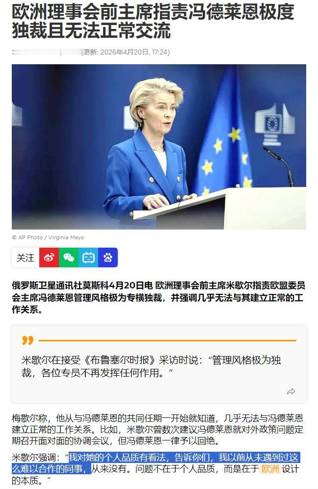 笑死,欧盟前“总统”,也就是俗称的理事会主席,大骂欧盟“总理”,也就是欧盟委员会主席冯德莱恩——极其毒菜,无法正常交流。 这得是有多恨,工作中被使了多大的绊子,才会在公开场合里直接开喷——我对它的个人品质有看法,我从未遇到过如此难以合作的同事。NEVER! 我仿佛已经看到米歇尔咬牙切齿的样子了。 欧盟理事会,本身是欧盟的大脑,欧盟委员会是欧盟大脑的执行机构,这就是为什么米歇尔是欧盟总统,而冯德莱恩是欧盟总理的说法来源。 而米歇尔,名义上来说,还是冯德莱恩的上级而非下级,堂堂上级居然被折磨成这样,可见冯德莱恩真是好作态! 又是一个女领导,压迫感,极难伺候……嗯,和高市早苗差不多的类型。 不过,冯德莱恩比高市早苗稍好的地方,就是它,略微没有那么矫揉做作!看上去稍微正常点点。 冯德莱恩作为驴党安插的裸官,能让米歇尔如此抓狂,估计就是米歇尔作为欧盟首脑,制定的很多方向和策略,冯德莱恩估计全都是阳奉阴违,打折执行。 就这样的欧盟,还拿什么和中美俄竞争哦!