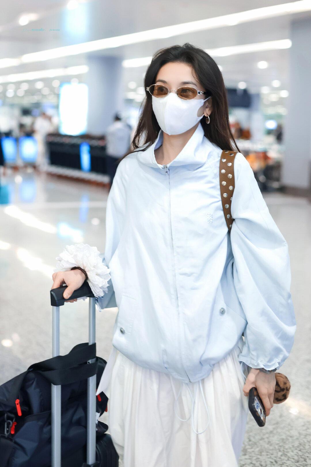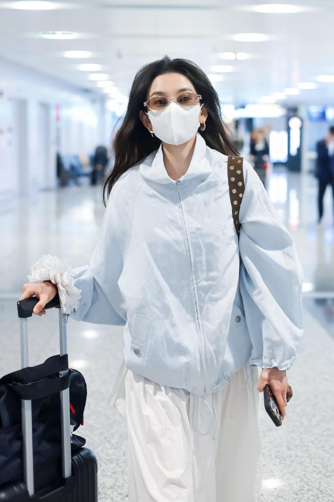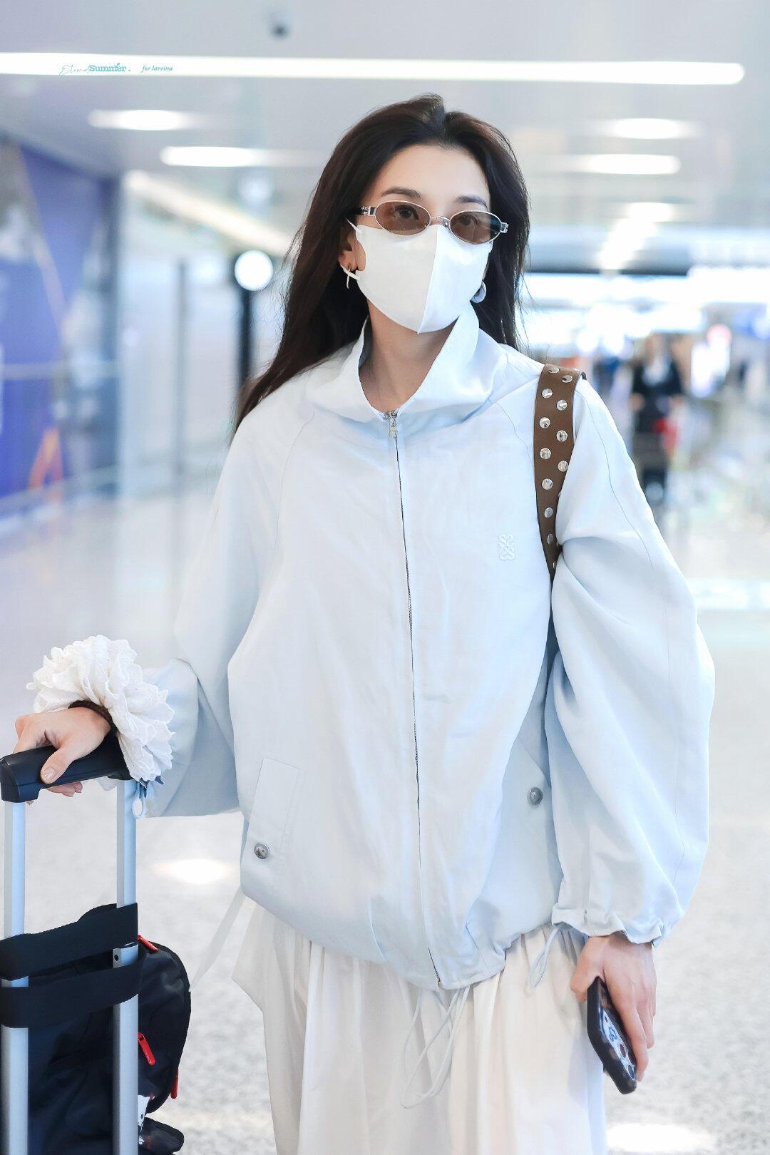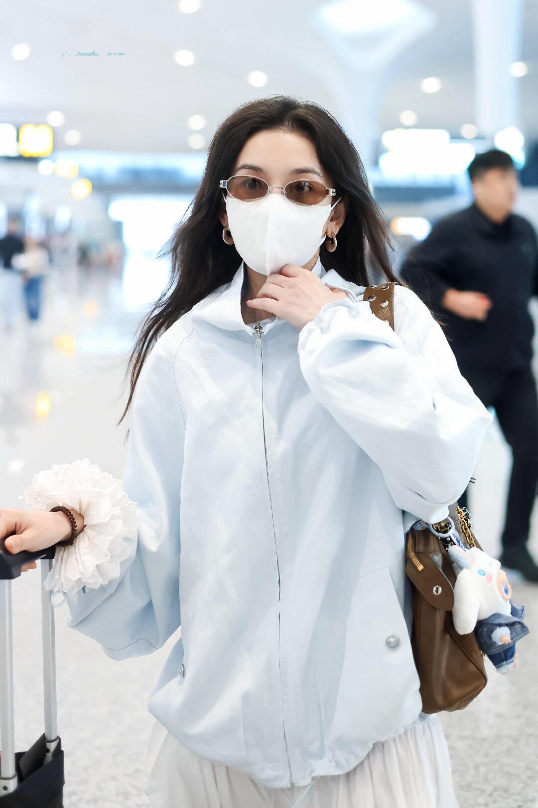 宋祖儿街拍,蓝白配色清爽干净,超减龄! 浅蓝廓形防晒外套搭配白色飘逸长裙,宽松版型松弛又显瘦,蓝白撞色清新又亮眼。棕色包包和金色凉鞋中和了整体的清爽感,袖口的白色花边更是点睛之笔,整套造型兼具舒适感与少女感,是不费力的机场时髦范本。