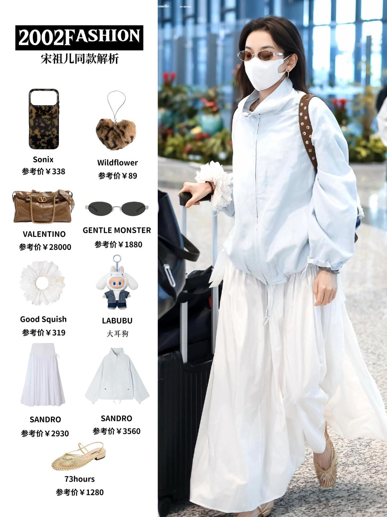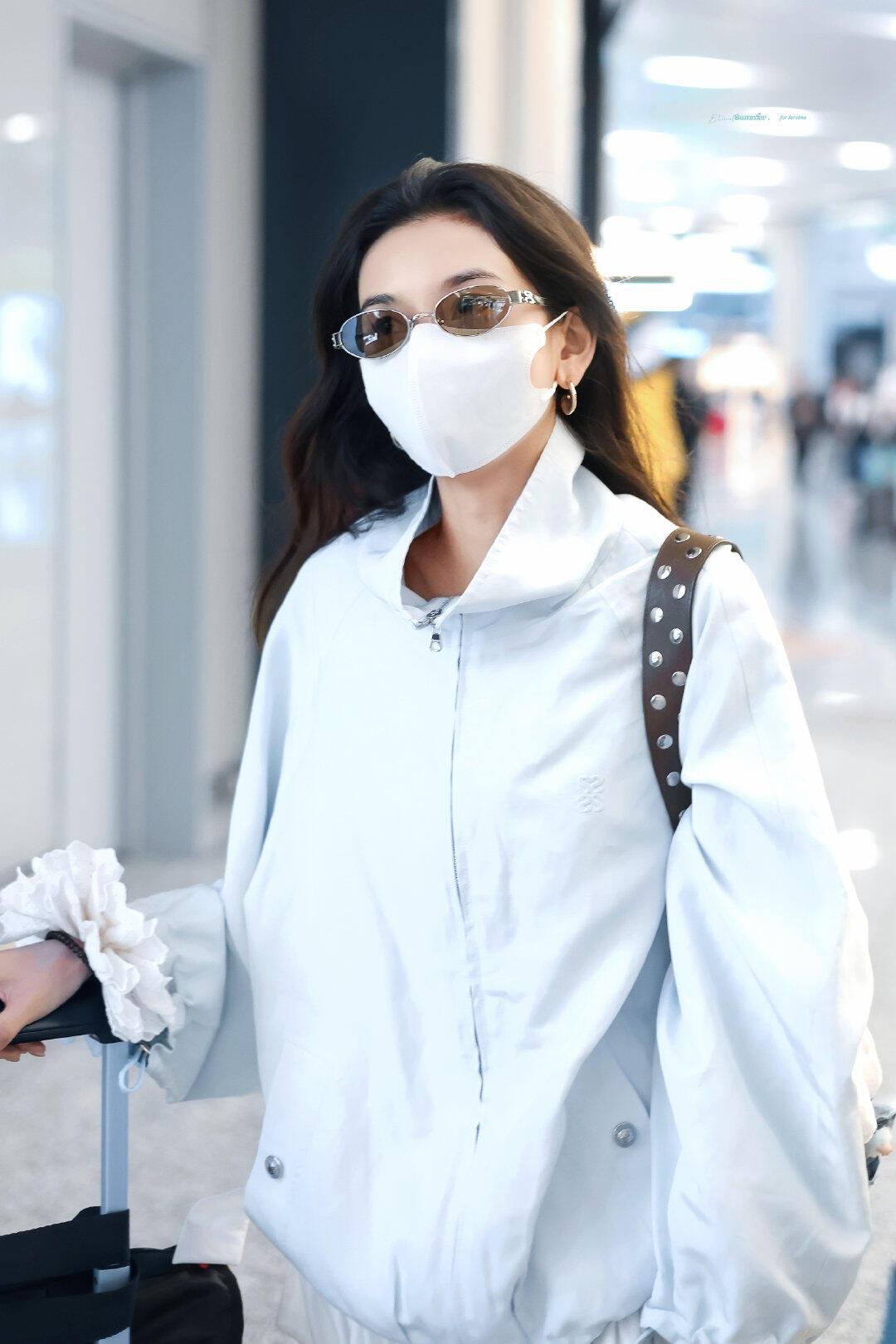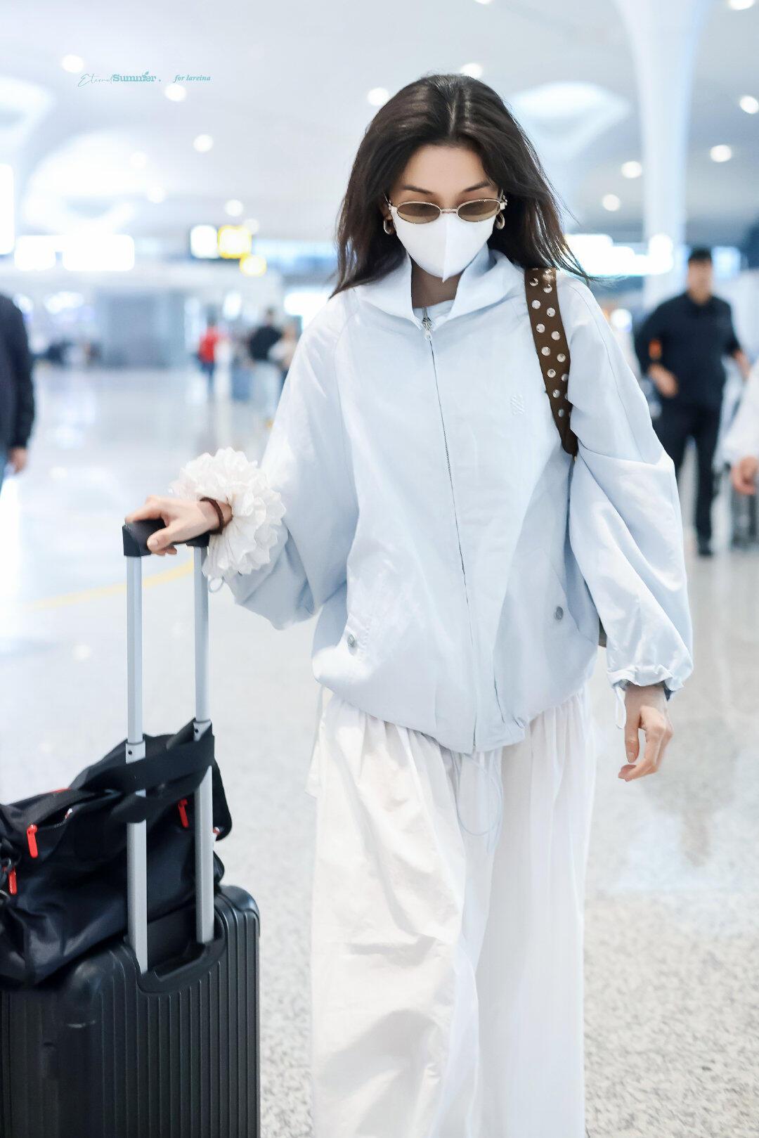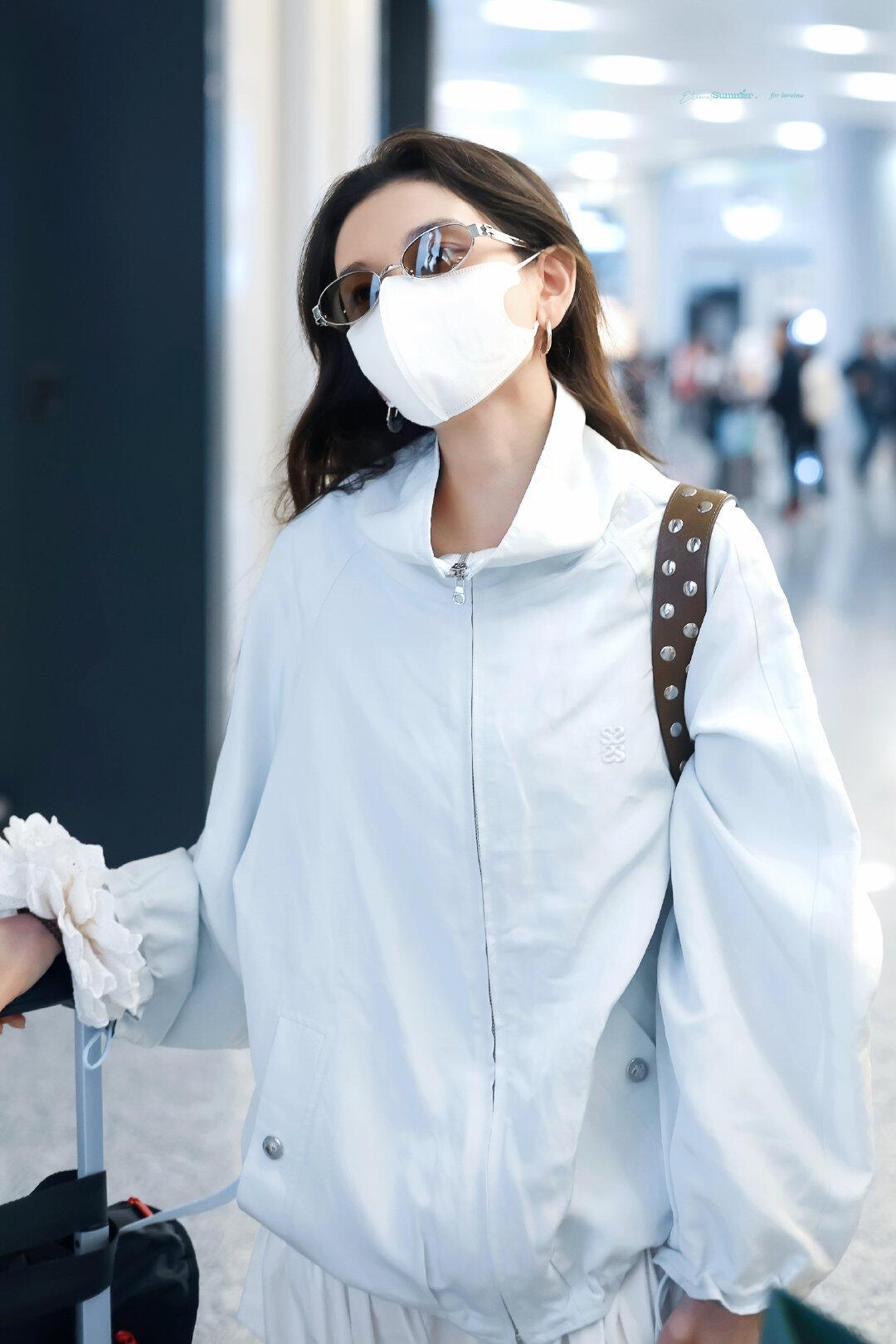宋祖儿街拍,蓝白配色清爽干净,超减龄! 浅蓝廓形防晒外套搭配白色飘逸长裙,宽松版型松弛又显瘦,蓝白撞色清新又亮眼。棕色包包和金色凉鞋中和了整体的清爽感,袖口的白色花边更是点睛之笔,整套造型兼具舒适感与少女感,是不费力的机场时髦范本。