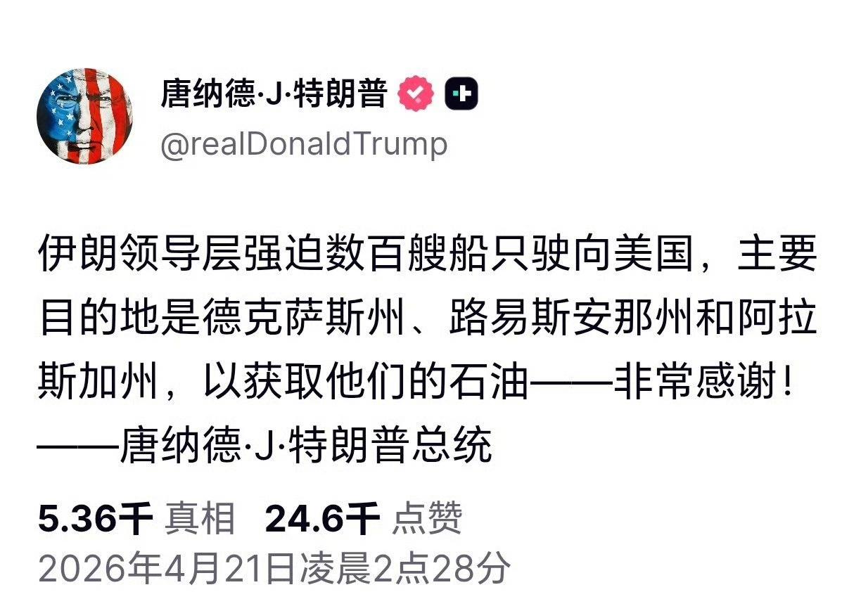 特朗普太辛苦了! 特朗普在美东时间4月21日凌晨两点就起来发文: 伊朗迫使很多油轮来美国买石油,所以“非常感谢”这些远道而来在美国买石油的人! 再者,在工作效率如此之高、工作时间如此之长的特朗普手下任职确实是一种耐力考验,怪不得诺姆、邦迪还有今天的德雷莫劳工部长都被打发了。