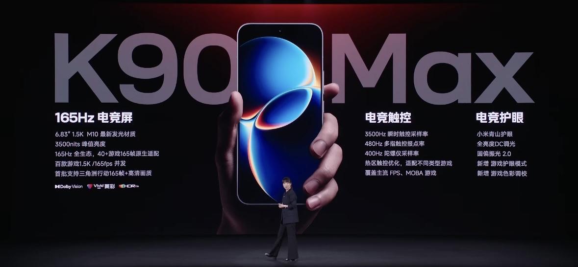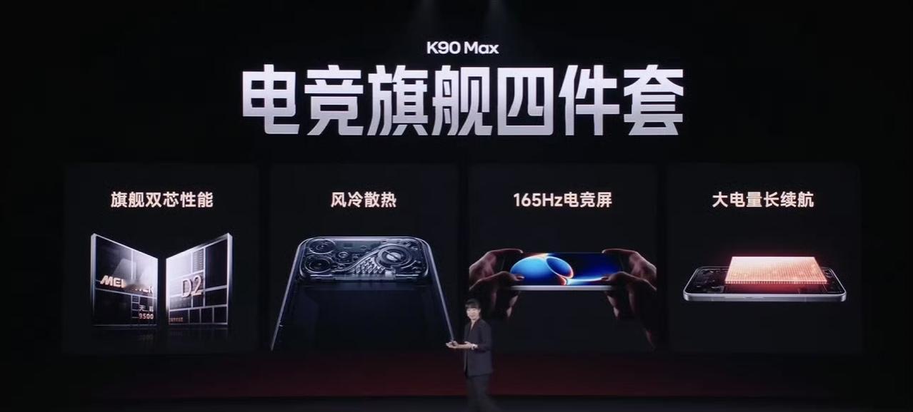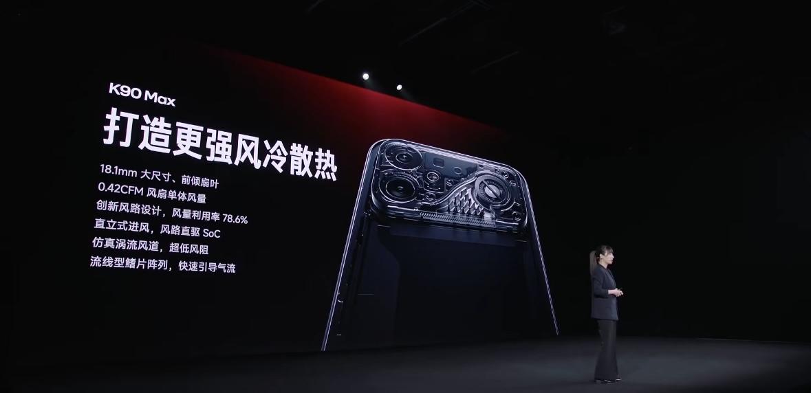 REDMI K90 Max发布了:风冷游戏旗舰 内置主动散热风扇,风扇尺寸18.1mm ,全新风道,单体最大风量0.42 CFM,最大噪声32dB,3档可调 moba游戏,144帧+极致画面持续4小时,温度不超37°C 天玑9500处理器,独立显示芯片D2,6.83英寸165hz屏,40+游戏适配165帧,首批支持《三角洲行动》165FPS +高清画质,1.5K/ 165fps 并发满帧 小米青山护眼,全亮度DC调光,游戏护眼模式,3500nits 超高亮度,3500Hz 瞬时采样率 整机通过 IP661 IP68/IP69认证,风扇单体通过IPX8 / IPX9,下单限时6年风扇保修 400hz陀螺仪,分区触控优化,旁路充电,X轴线性马达,对称双扬,3MIC收音,两颗信号增强芯片,两颗WiFi 芯片,7根天线 5000万主摄,金属中框,8550mAh电池+100W,22.5W有线反充