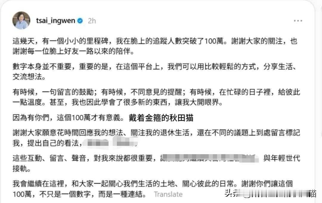 蔡英文粉丝竟破百万,其社交媒体“爬山、种菜、喂狗”常刷屏,俨然一位邻家退休老人~ 蔡英文退休快两年了,翻看她在自媒体上分享的退休生活,日子过得好像有滋有味。 联合早报、中评社等媒体多次报道她的退休生活,不是在爬山,就是走在前往山野的路上。 联合早报还专门刊发评论提到,蔡英文只需陪着徒步健行的普通民众合影互动、随口说几句轻松玩笑话,就能牵动民众情绪。 除了喜欢爬山、健步,蔡英文的退休生活还挺接地气。 中评社曾拍到,她身着简单便服、戴着白手套,在邻居菜园里拔菜、割葱、采摘橘子。 她笑着自嘲“自己加菜自己拔,但是菜是别人煮的”,更调侃自己“越来越像一个退休的老人”。 春节期间,她带着自家爱犬“乐乐”、“凤梨妹”上山,特意给邻居家的10只狗狗准备零食,还按照每只狗狗的口味偏好亲手分发,为它们拍摄新年照片,画面十分好玩。 4月21日,联合早报再度曝出消息:蔡英文在Threads上的粉丝数量已突破100万。 反观赖清德,粉丝数量仅有52万,足足比她少了将近一半,人气差距一目了然。 对于这个情况,蔡英文还表现得十分谦虚,坦言这不只是一个数字,更是一种人与人之间的连结。 猫仔掰着手指算了算,100万对比52万,两者的差距绝非一星半点。 即便已经退休,她前往东吴大学演讲时,人气依旧挺高。 说到这里,猫仔不由得想起号称“祖母绿”的另一位民进党元老——吕秀莲。 她在2026年元旦登上政论节目公开表态,明确表示“台湾是中国不可分割的一部分”、“我们都是中华民族一份子”。 这番话从吕秀莲口中说出,让不少人眼前一亮。 即便岛内有舆论质疑她是出于政治考量,但能迈出这一步,足以说明她看清了历史大势、回归了民族清醒。 猫仔一直在想,吕秀莲能够转变认知、认清大势,蔡英文有没有这种可能呢? 如今她过着爬山、种菜、遛狗的安逸生活,完全可以趁着平静的独处时光,把两岸关系的来龙去脉、是非曲直好好琢磨明白。 猫仔真心期待,退休后的蔡英文在享受生活之余,也能想通透、变清醒,以实际行动维护国家主权与领土完整。 两岸同胞本是同根生,和平发展才是人间正道。 如果能用这份人气,多做一些有利于两岸缓和、有利于民众安宁的事,让两岸少一点紧张、多一份平安,那这百万粉才不只是流量,而是真正温暖有力的力量。 友友们,大家说是不是这个理儿?