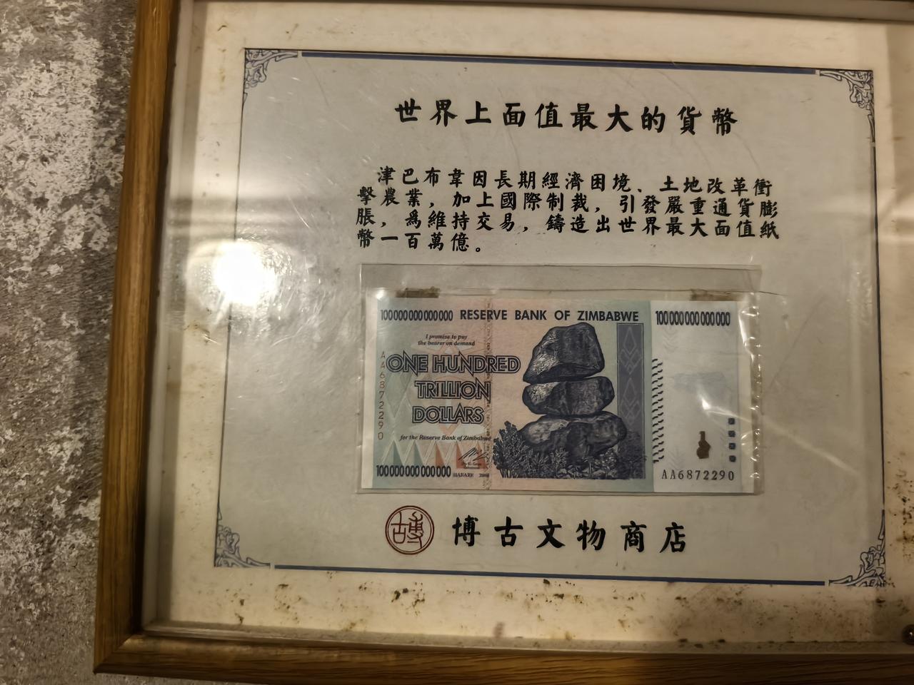 真是开眼界了。晒图笔记大赛旅行见闻 4月16号。游览了重庆李子坝的地下金库。让我大为吃惊的是。中国历史上面值最大的纸币竟然是60亿元,经过复杂的换算,只相当于人民币几毛钱,在当时只能买一盒火柴。世界上面值最大的钱是津巴布韦的100万亿元,当时换算成人民币两块多钱,通胀后期已经彻底沦为废纸一张。 这两张纸币都严重超出了我的想象力。 1953年版的大黑拾人民币也是第1次见到。我一个60多岁的人,过去都没有听说过。据说这个大黑拾就是在我出生的1964年停止流通的,大量回收集中销毁,存世量极少,收藏价值极高。