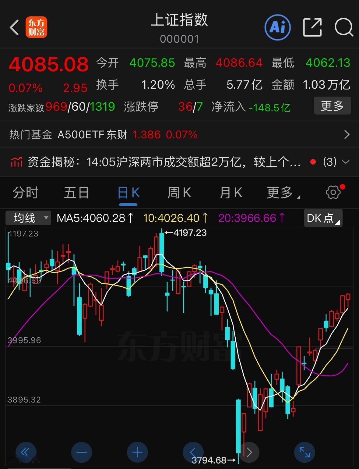 今天大盘继续创出本轮反弹新高,不少朋友问踏空了要不要追,我的观点很明确:不要追,当前位置追涨性价比很低,同时要警惕指数出现回踩调整。今天指数在银行、地产、券商、煤炭等蓝筹板块带动下继续上攻,最高触及4086点,刷新反弹高点,但全天上涨个股仅1943家,多数题材股反而回调,说明指数与个股出现明显分化。 接下来大盘怎么走、还会不会继续冲高?我认为指数层面大概率仍有新高可期,因为还有不少板块明显弱于大盘,不少仍在60日均线下方运行,且以权重蓝筹为主导,后续指数依旧看4141附近的压力位。操作上该如何应对,波段方面我继续将仓位控制在4到5成,主要布局新能源与科技方向,不过这两个方向从波段来看暂时没有新的介入机会,耐心等待下一轮节点即可;短线方面,今天已经了结昨天关注的多晶硅和光伏短线机会,今日没有新开短线方向。对于明天走势,上方压力继续看4092至4108区间,触及压力位后仓位较重的可以适当减仓,下方支撑关注4055区域,这个位置暂时不考虑低吸。