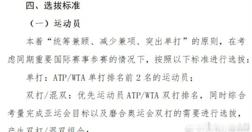 双打/混双:优先运动员 ATP/WTA 双打排名,同时综合考量完成亚运会目标以及磨合奥运会双打的需要进行选拔,产生双打/混双组合;