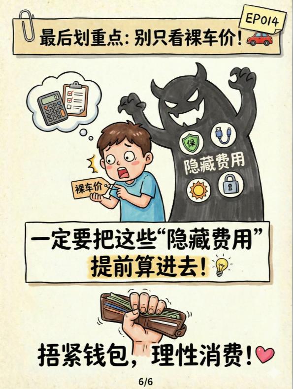 买电车必看!4 大隐藏费用劝退指南🚗 姐妹们,是不是攒够钱终于要提 “梦中情车” 了?想象中早高峰在车里舒舒服服补妆,周末带狗子去郊外露营的美好画面✨!但先停手!销售报的价绝不是落地价,今天就来扒一扒电车那些藏在深处的 “花钱刺客”,看完再提车不踩坑! ❌ 刺客一:首年 “天价” 新能源保费 别以为电车只省充电钱,交保费时能让你瞬间傻眼!电车的电池相当于汽车 “心脏”,维修更换成本极高,所以专属车险比同价位油车贵不少,这波真的冤大头💸! ✅ 避坑指南: 第一年大多要在店里投保,千万别被忽悠买 “全险全家桶”!只选交强险 + 200 万起三者险 + 车损险(自带电池保障),完全够用,保费直接砍半! ❌ 刺客二:充电桩 “隐形” 线缆费 以为买车送充电桩就万事大吉?大错特错!这就和买空调一个道理,机器送你,但外机离得远,额外加的铜管、线缆全要加钱🔌! ✅ 避坑指南: 官方配套线缆通常只有 30 米,超一米就要花几十上百。如果你的车位离小区电表远,直接放弃官方安装,去网上选大牌第三方充电桩包安装,性价比拉满,省下来的钱吃顿火锅不香吗🍲! ❌ 刺客三:“微波炉天幕” 防晒配件费 试驾时看全景天幕看星星超浪漫?等夏天实测,车内温度能直接把底妆烤融化!销售会趁机推销两三千的官方隔热膜、遮阳套装,纯纯智商税🌞! ✅ 避坑指南: 物理防晒才是王道!别在 4S 店当冤种,网购几百块的专车专用卡扣式遮阳帘,隔热效果拉满,省下的钱买几支护大牌口红不香吗💄! ❌ 刺客四:高阶智驾 “买断费” 试驾时看车子自动变道、避让超酷?但真相是,高阶智驾就像游戏付费 DLC,有些品牌送几年甚至终身免费,有些却要花大几万买断才能解锁🚘! ✅ 避坑指南: 如果是每天跑市中心复杂路况,想靠智驾应付早晚高峰,买断高阶智驾值得;但如果只是日常两点一线通勤,车子自带的免费 L2 级基础辅助驾驶,完全够用! ✨ 最后划重点 算购车预算时,千万别只盯着裸车价!这 4 大隐藏费用一定要提前算进总预算,捂紧钱包,咱们要把每一分钱都花在刀刃上👛!【来自懂车帝车友圈】