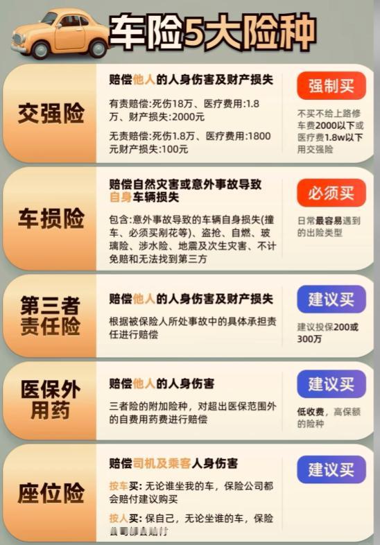 吐血整理!车险这样买,一分冤枉钱都不花 买车容易养车难,车险更是每年固定大额开销。险种繁杂、销售套路多,买多浪费钱,买少保障不够。这份完整选购攻略,新手老司机直接照搬,轻松避坑。 🌟刚需必买险种 交强险 国家强制投保险种,未购买无法正常上路,一经查到会面临扣车罚款。仅赔付事故第三方的人身与财产损失,赔付额度偏低,只能作为基础兜底,必须搭配其他商业险补足保障。 车损险 专门保障自身车辆损失,碰撞、意外、火灾、被盗、水淹等情况均可理赔。 2020 年车险综合改革后,已整合玻璃险、自燃险、涉水险、盗抢险等附加保障,保障范围十分全面。新车、高价值车辆建议必入;车龄久、残值较低的老车可酌情考虑。 第三者责任险 补充交强险的高额赔付缺口,承担事故中第三方人身伤亡、车辆及财物损失。 建议保额最低 200 万起步,经常跑高速、一线城市用车、路况豪车较多,直接选择 300 万及以上保额,保费差价小,风险抵御能力更强。 车上人员责任险(座位险) 保障车内驾驶员与全部乘车人员人身伤亡,可自由选择每座保额。保费低廉,日常经常载人、家用出行频繁的车主非常有必要配置。 ❌没必要单独买的险种 发动机涉水险 早已全部并入车损险保障范围,除车辆进水后二次打火造成损坏不予理赔外,其余涉水损坏均正常赔付,无需额外投保。 不计免赔险 目前已经默认包含在商业险主险内,不再单独收费,切勿被业务员诱导重复购买。 📌续保省钱小技巧 车险支持提前 45 天报价,建议提前 30 天左右完成投保。 提前续保可以享受老客户专属折扣、保费返现,以及洗车、代驾、免费道路救援等增值福利。 上一年度无出险记录,续保时可正常享受无赔款优惠系数,保费会逐年下调,下单前务必核对好个人出险记录。 💡保险公司选择建议 优先挑选理赔速度快、线下网点多、售后口碑稳定的大型保险公司。 投保前可参考银保监会官方投诉数据,结合身边车主真实理赔体验综合对比,优先选择售后体系完善、出险处理高效的品牌。 买车险不用盲目全险配齐,按需搭配险种、选对投保时机,既能保障到位,又能省下大量不必要开支。【来自懂车帝车友圈】