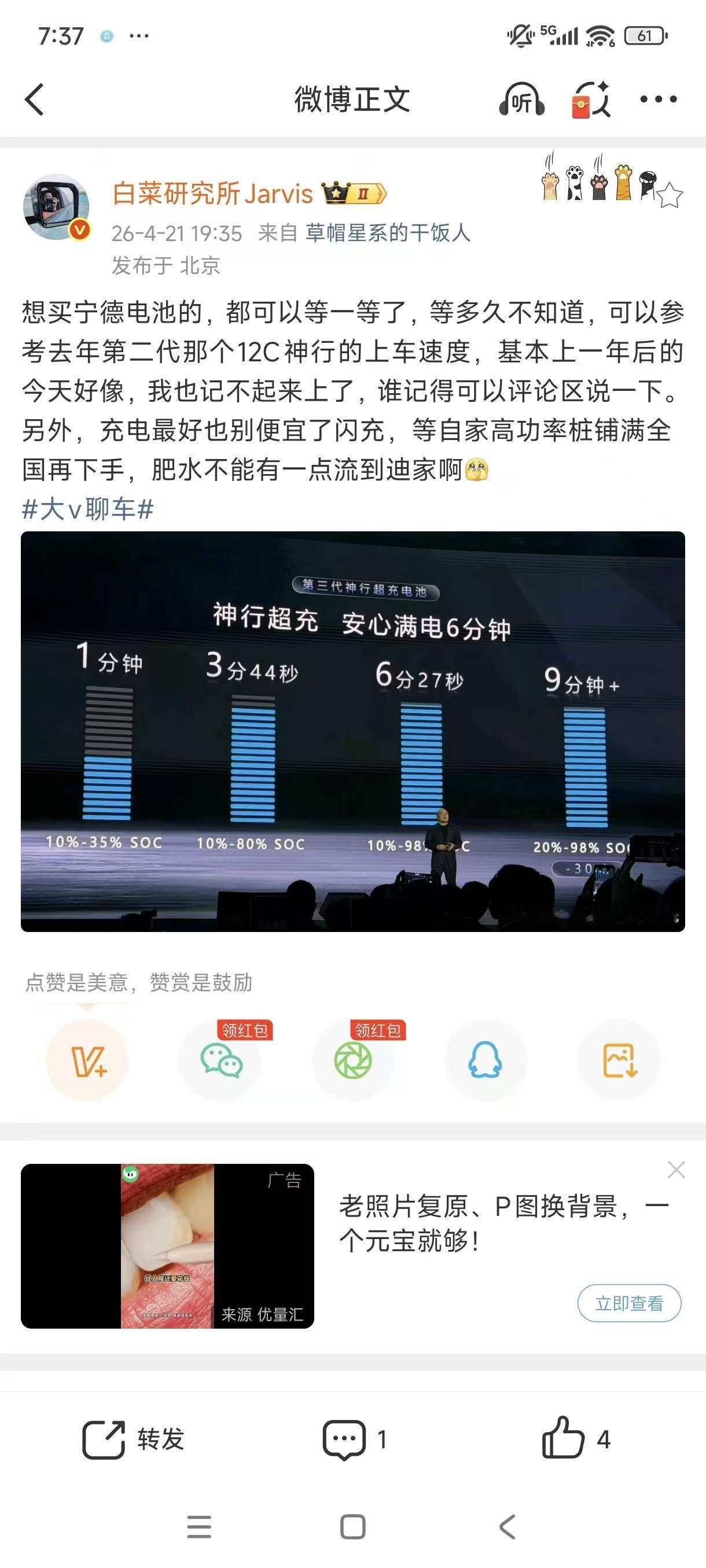 不愧是宁王,3月底,高管还在强调不可为超快充牺牲电池可靠性,转眼间,在今晚就发布了世界上最牛X的闪充技术,10%到98%仅仅需要6分27秒!一下子把迪子的九分钟彻底比下去了,迪王也只能甘拜下风了。这才过了不到一个月,显然,这中间宁王一定取得了前所未有的技术突破,犹如一个修武之人,一夜之间打通任督二脉,神功大成!唯一有点遗憾的就是,没有看到实车跟实桩,对比吉利的神盾闪充,人家起码还有对标车型领克10。