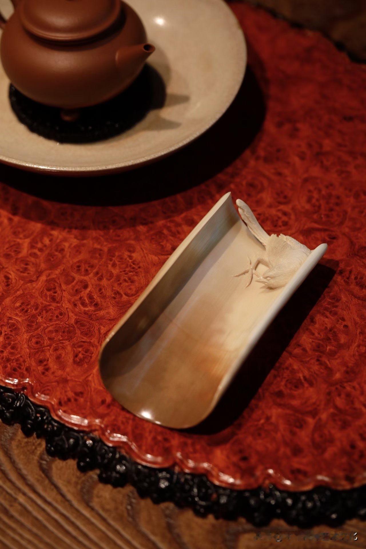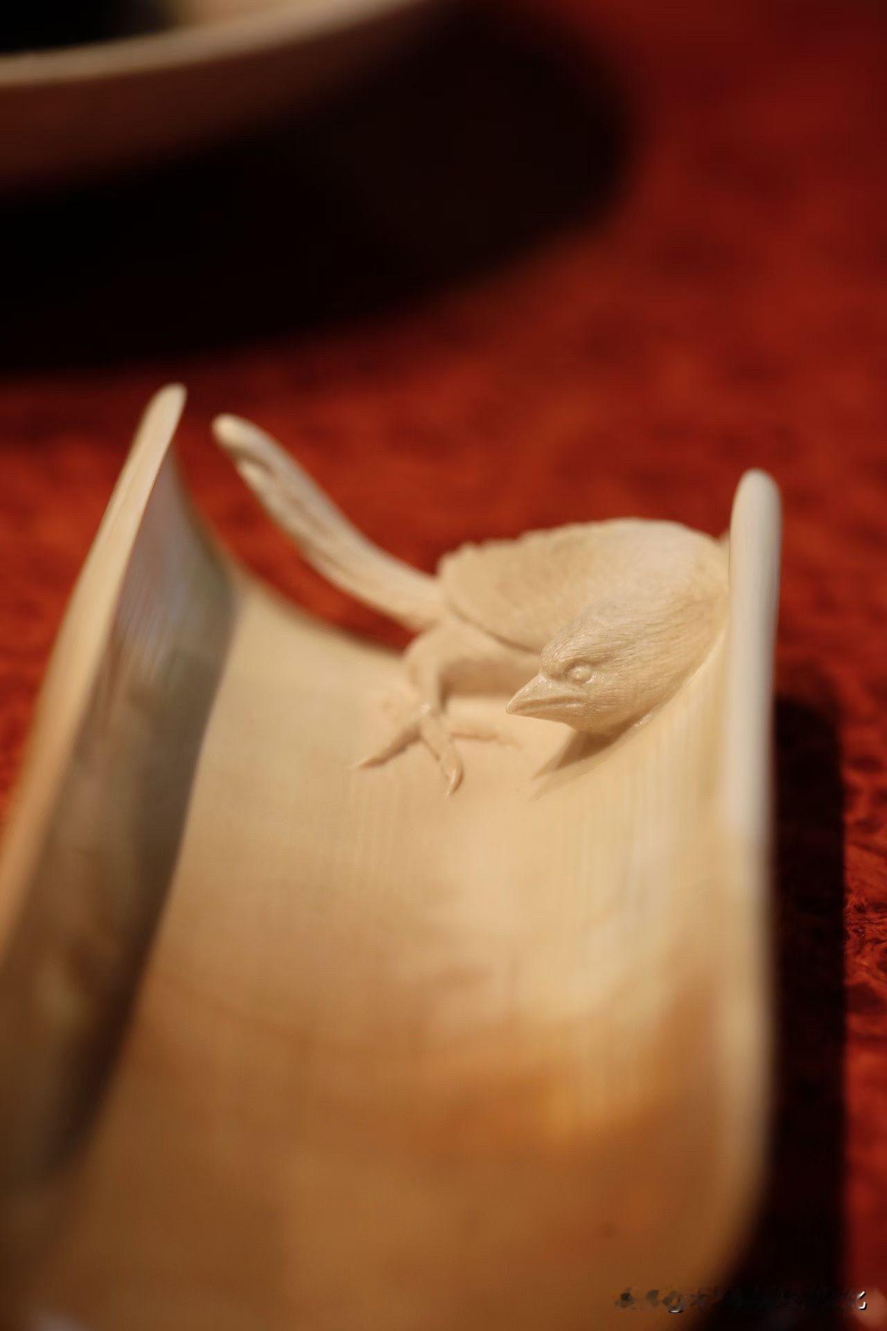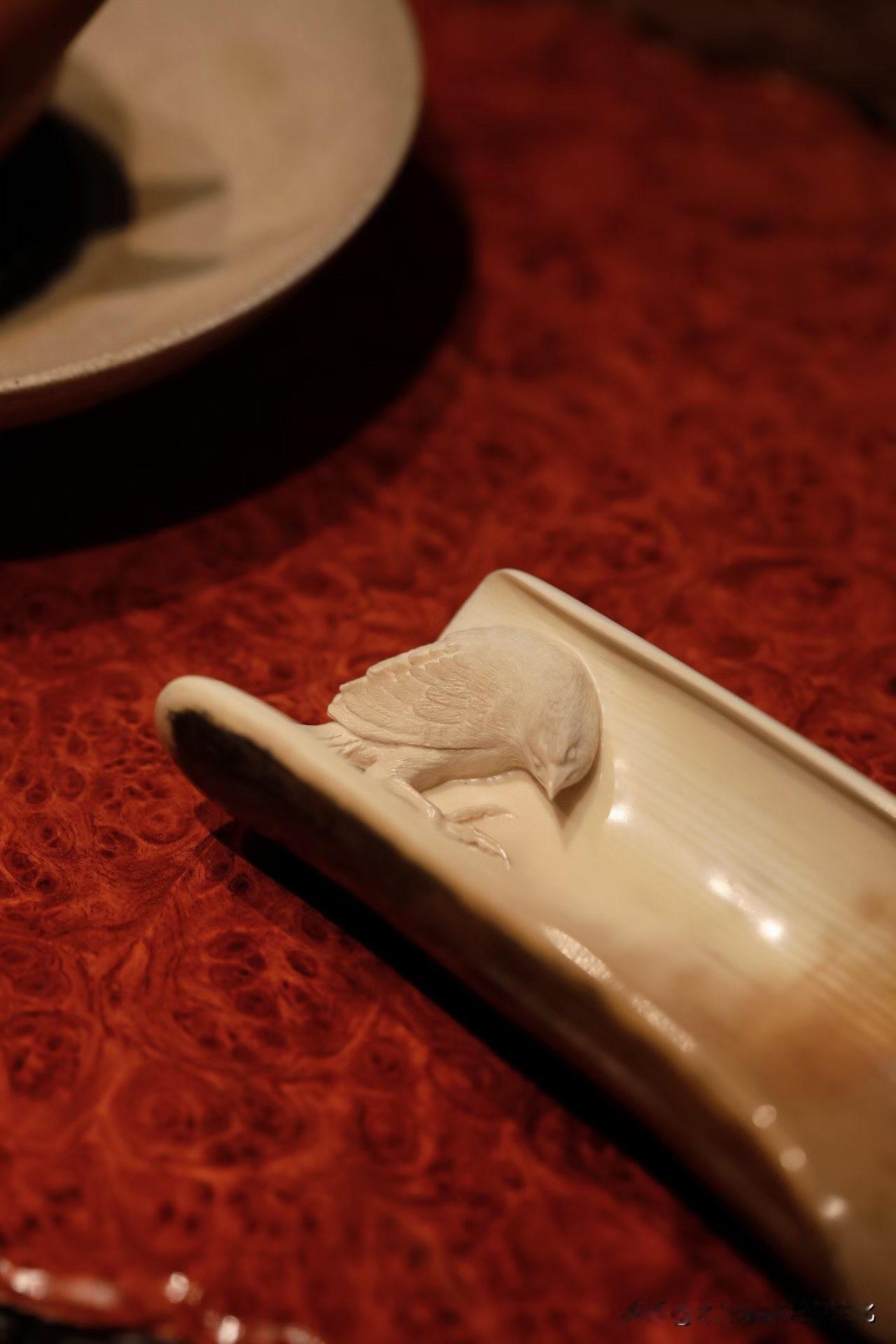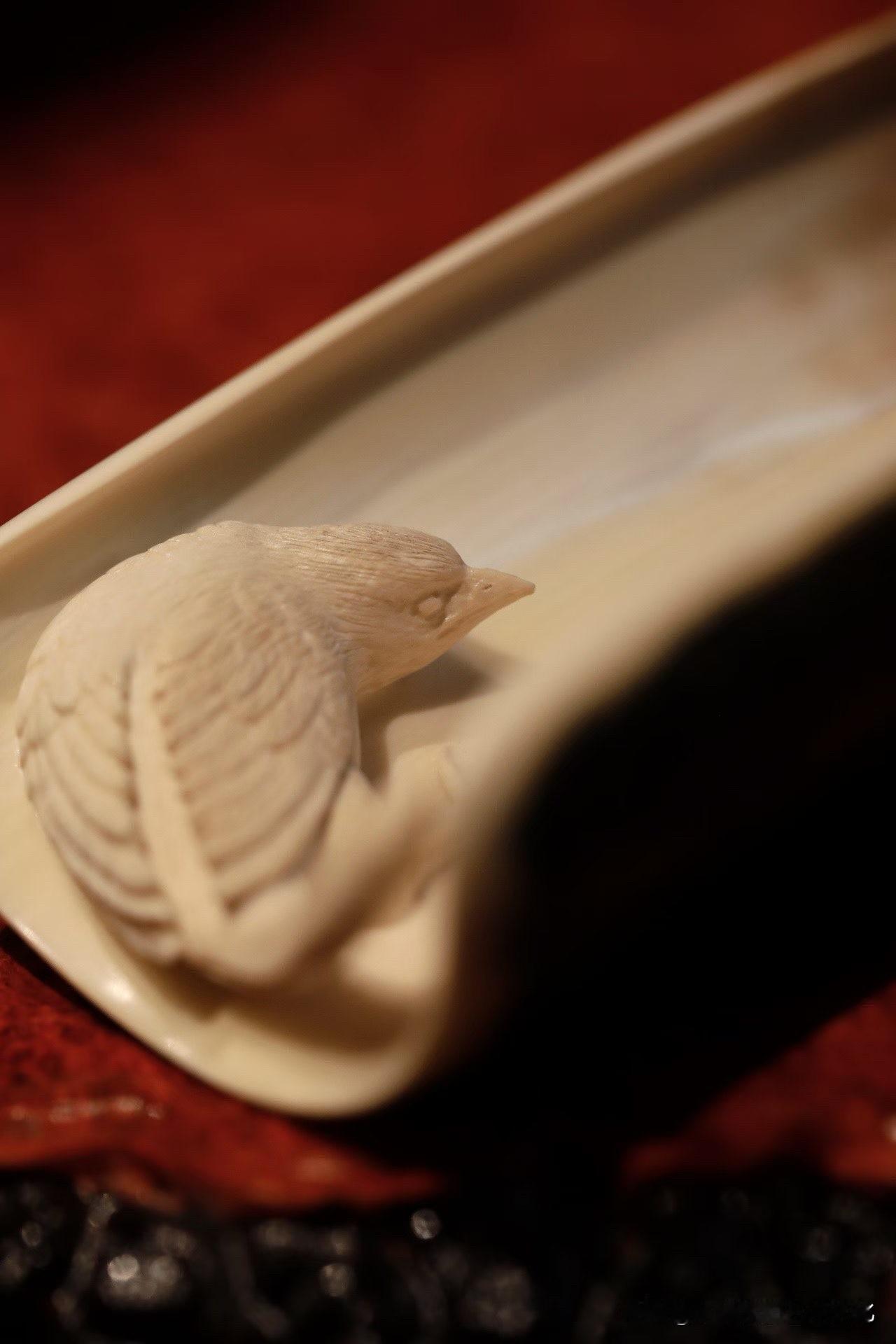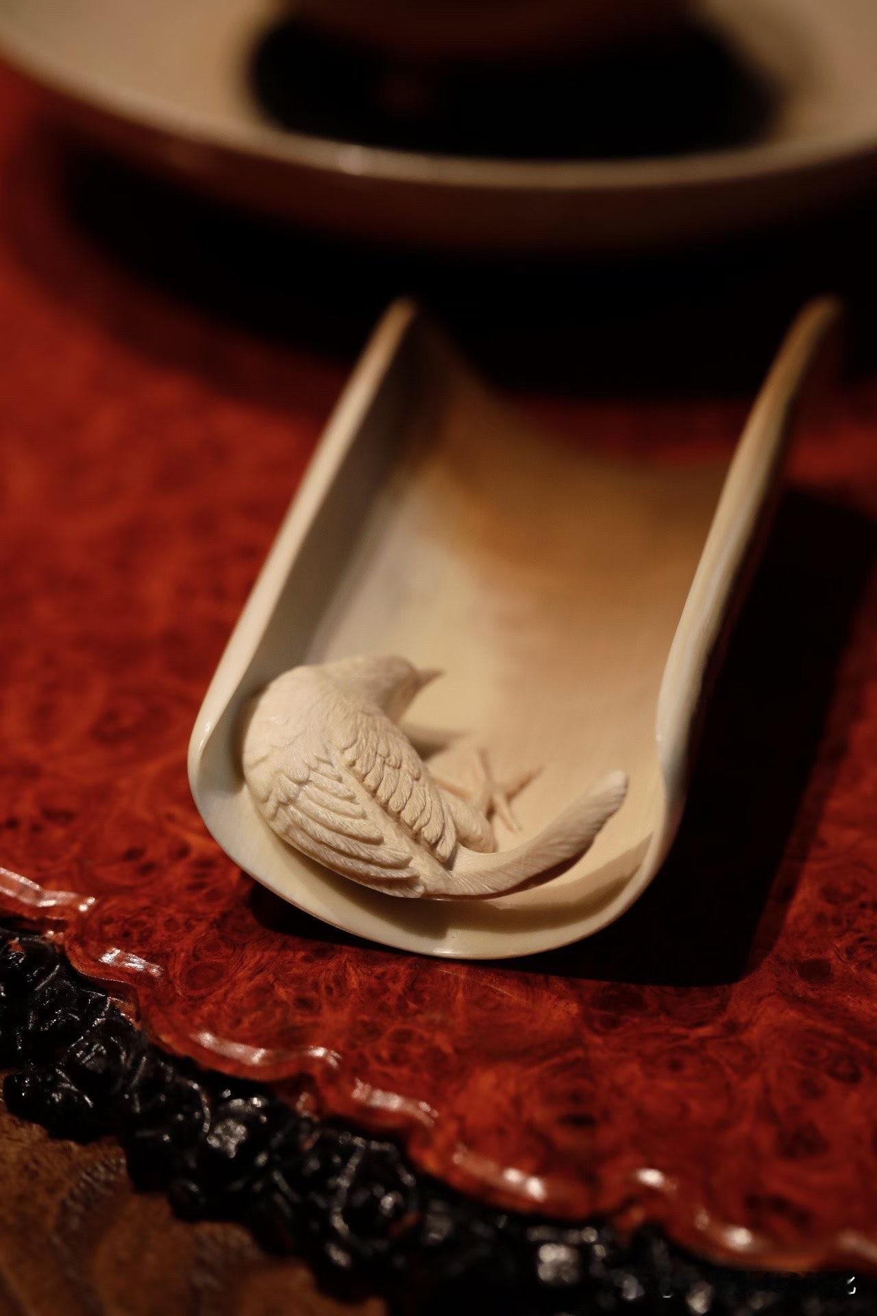 这只“孤鹊”,很克制。 猛犸牙的蓝皮壳留在外侧, 像一层被时间慢慢压下去的冷色, 不张扬,却很深。 内里一只喜鹊,几刀而已, 缩颈、昂首、翻白眼—— 不讨喜,却有气。 这种刀法,不求满, 反而在留白里见锋芒。 放在茶席上,它不热闹, 却让人不自觉安静下来。 有些作品,是取悦; 有些,是表达。 你更喜欢哪一种?非遗猛犸象牙 猛犸牙穿戴印章 猛犸牙雕工艺 猛犸象牙茶则 高级猛犸象 猛犸牙老型珠 帝王猛犸