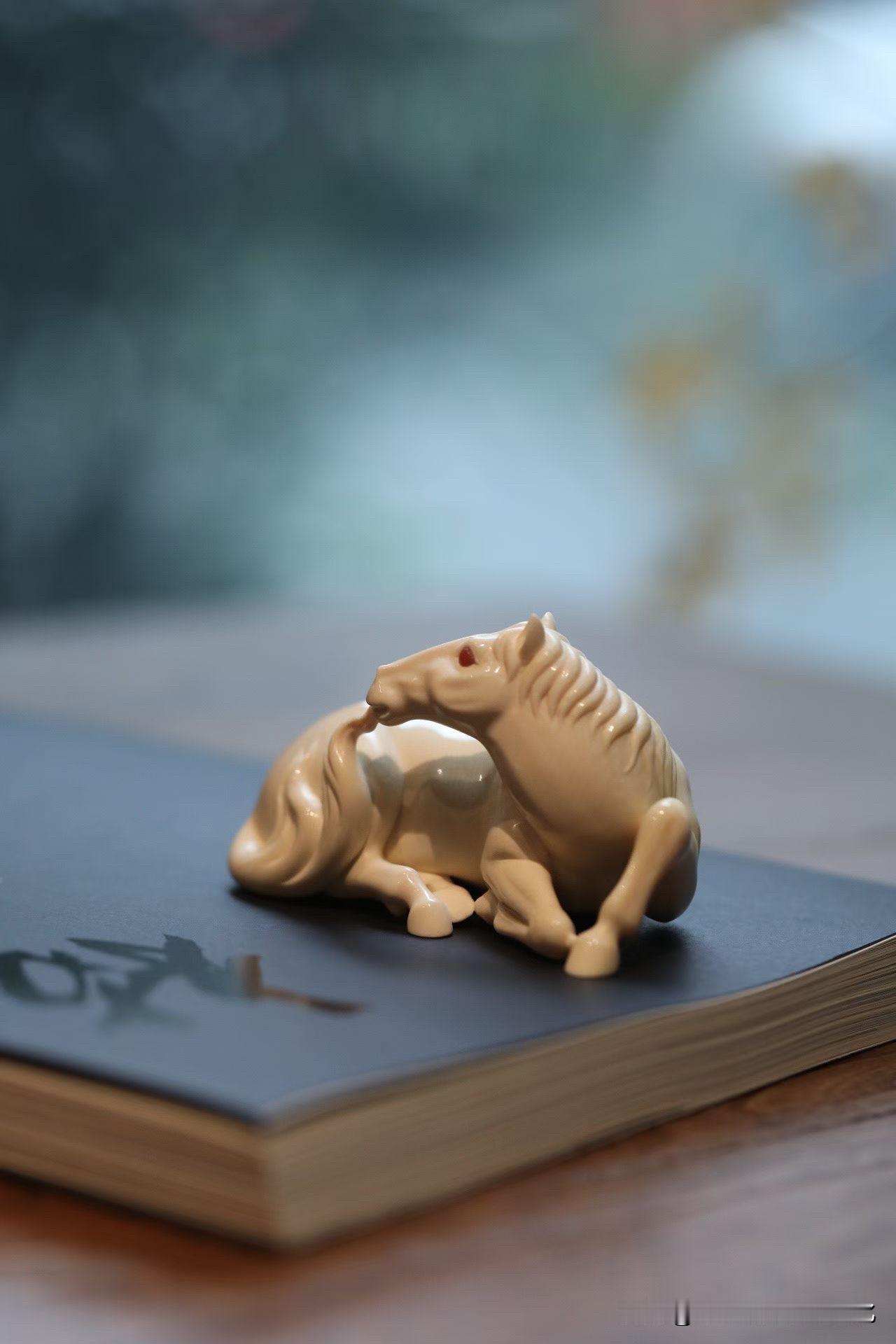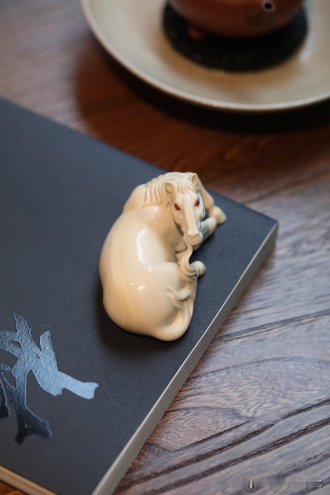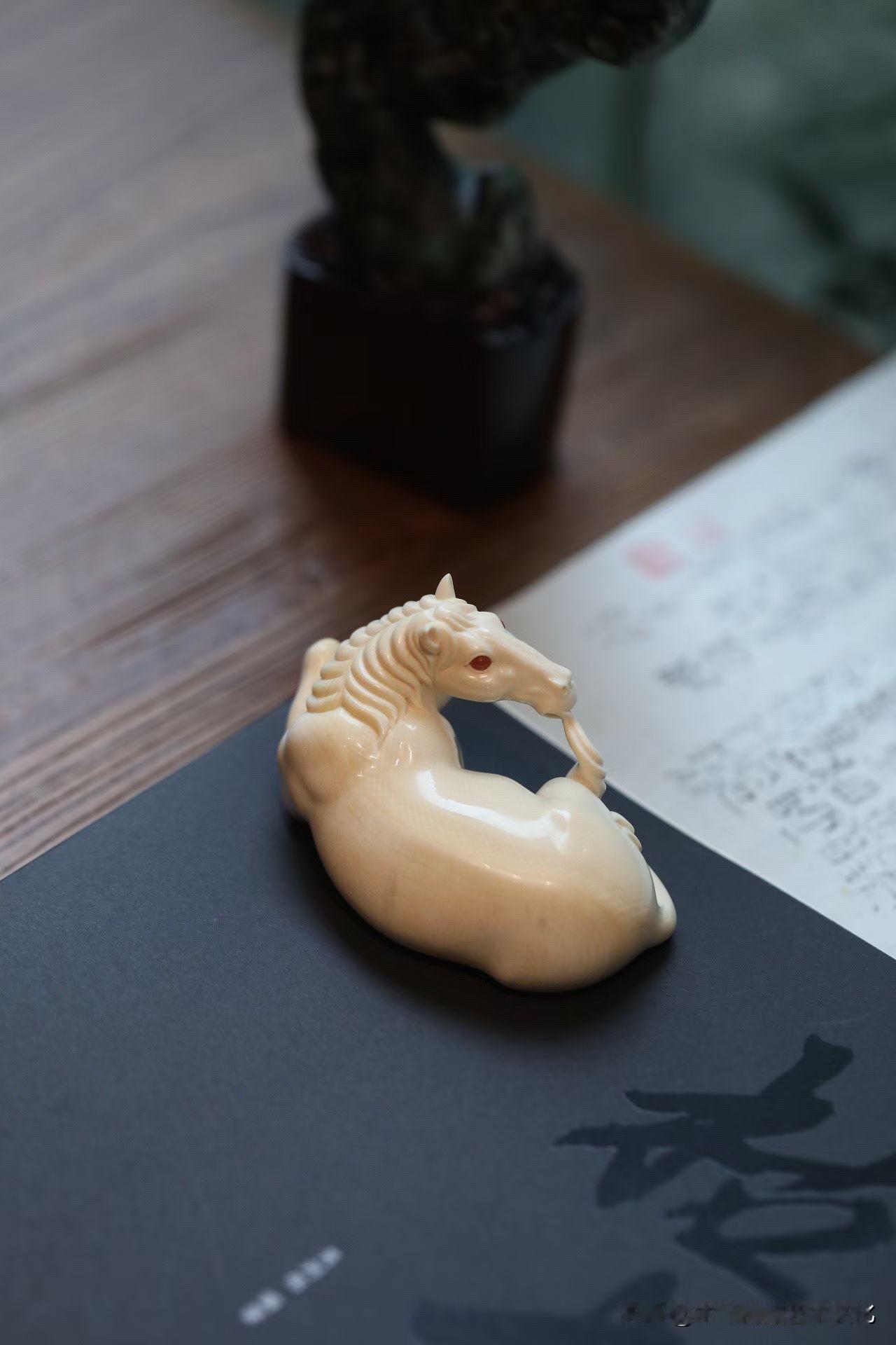 这匹“卧驹”,是收着的力量。 猛犸牙温润不张扬, 马却不柔—— 四蹄内敛,身躯团伏,像一弯月压在案上。 不奔、不嘶, 却有一种随时要起的气。 鬃毛顺势而下,尾部轻拂, 线条柔,但骨在里面。 那一双红玛瑙的眼, 不炫,却把神气提住了。 有些马,是用来看的气势; 有些,是用来感受“蓄”。 你更喜欢哪一种?