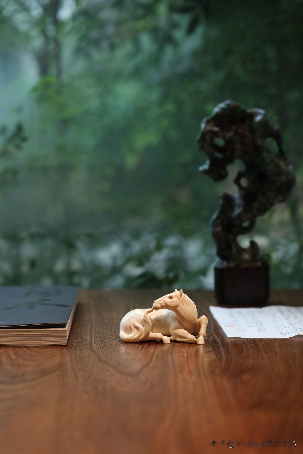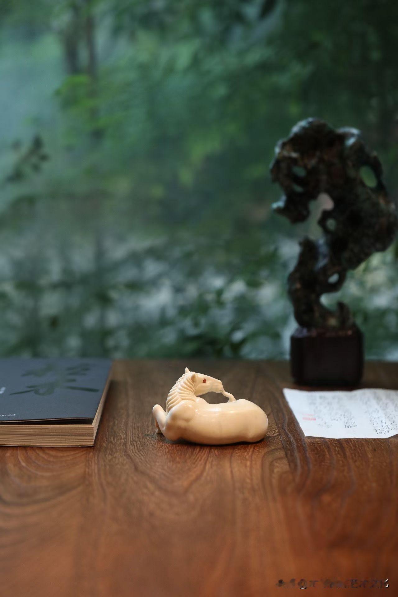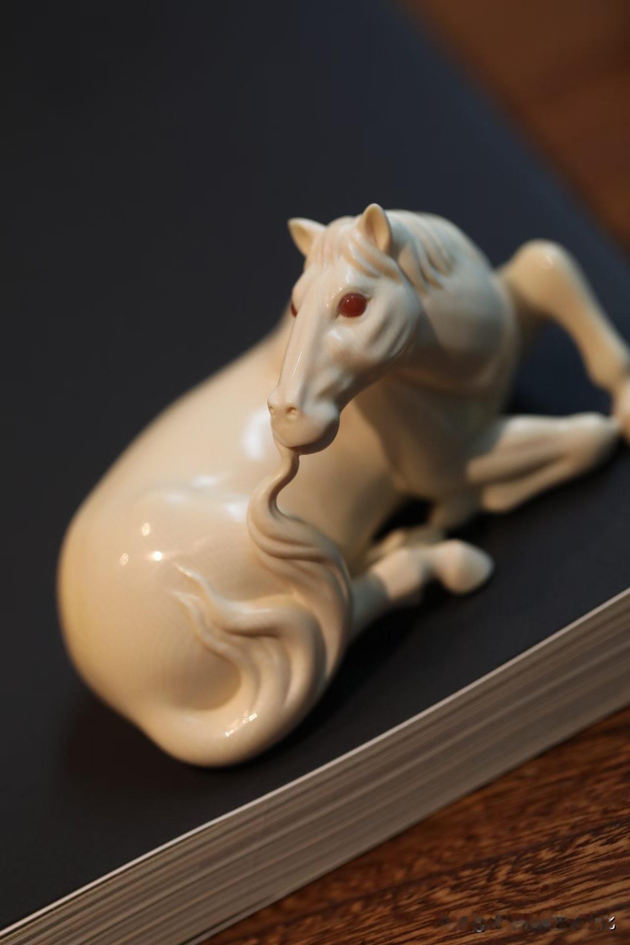 这匹“卧驹”,是收着的力量。 猛犸牙温润不张扬, 马却不柔—— 四蹄内敛,身躯团伏,像一弯月压在案上。 不奔、不嘶, 却有一种随时要起的气。 鬃毛顺势而下,尾部轻拂, 线条柔,但骨在里面。 那一双红玛瑙的眼, 不炫,却把神气提住了。 有些马,是用来看的气势; 有些,是用来感受“蓄”。 你更喜欢哪一种?