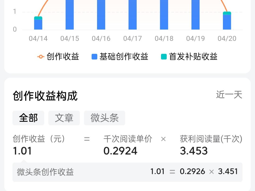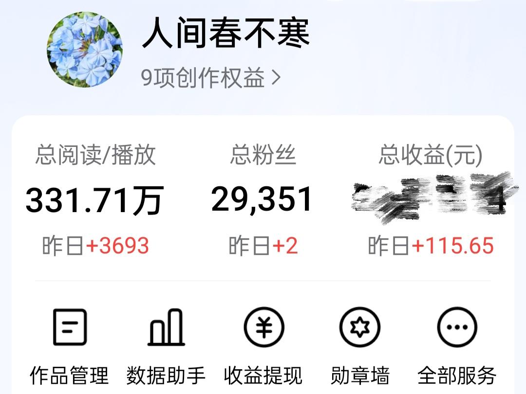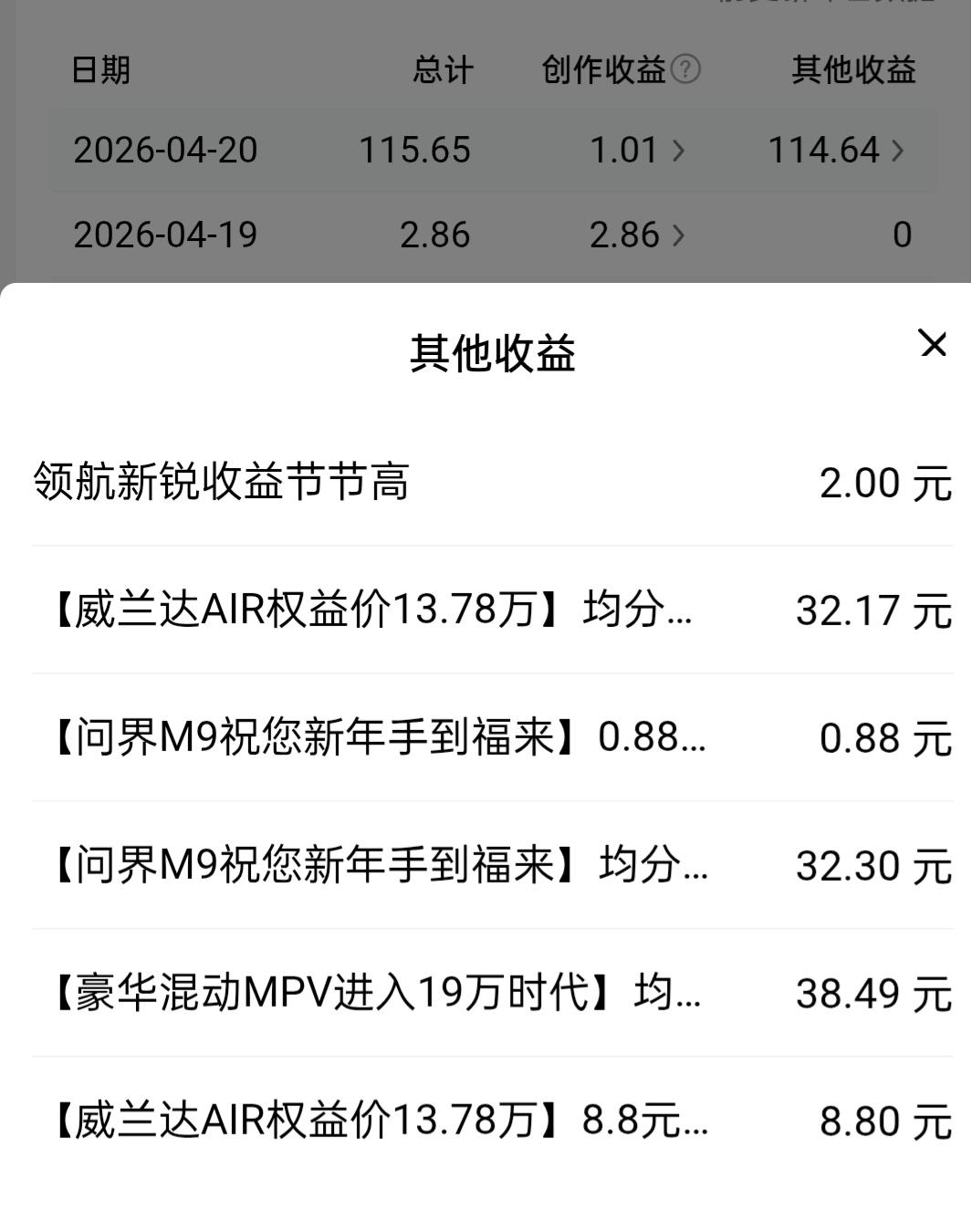 今天总计收入115.65元,真是好久没有这样的收入了,太开心了。 今日头条创作收益1.01元,阅读量3693,新增粉丝2位,千次阅读单价0.2924。让人惊喜的是收到额外奖金114.64元:包括领航新锐收益节节高2.00元,【威兰达AIR权益价13.78万]均分奖32.17元,【问界M9祝您新年手到福来】小红包0.88元,【问界M9祝您新年手到福来】均分奖32.30元,【豪华混动MPV进入19万时代】均分奖38.49元,【威兰达AIR权益价13.78万】红包8.8元。 知足常乐,这份收入足以让我开心好几天。一天又一天,在头条笔耕不辍,从容而充实,开开心心度过每一天!