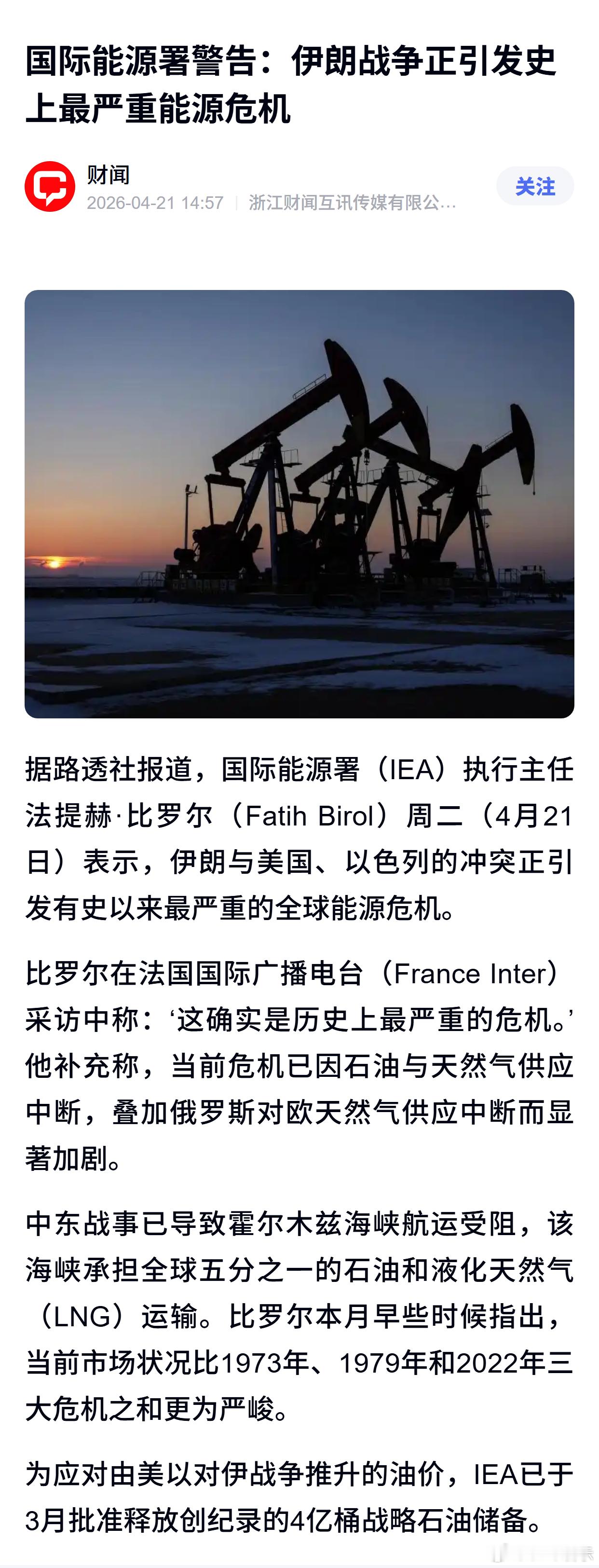 国际能源署警告:伊朗战争正引发史上最严重能源危机