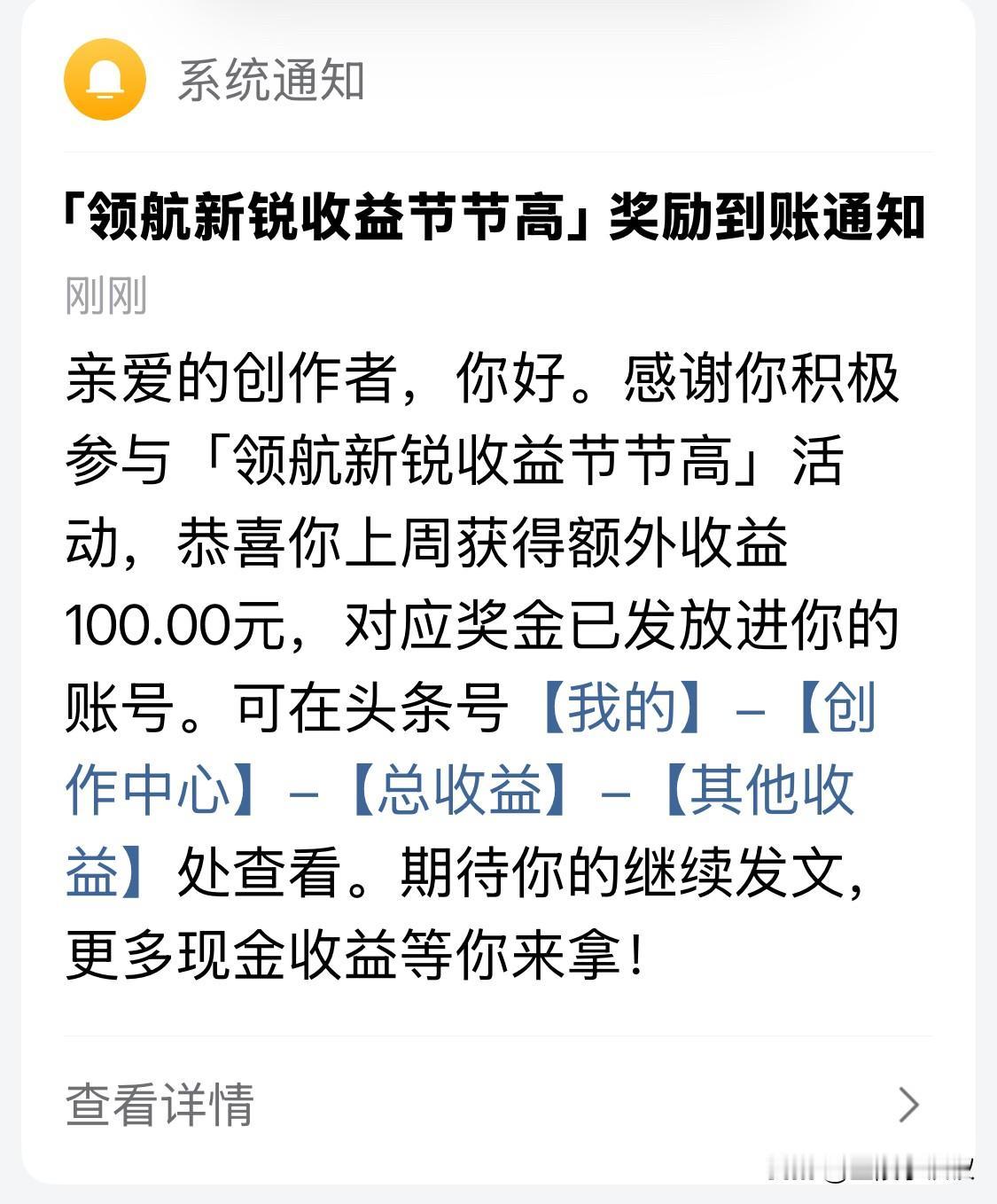 天降大饼砸着我了 自从升级为头条新锐创作者以后,我这单价是越来越低,好像又是普遍现象,如今想在头条靠写作赚钱越来越难了,这不是针对我自己的事情。无论怎样,我还是一如既往的每天写呀写! 升级为新锐创作者最大的好处对我而言,就是每周二头条会发给我30元领航新锐节节高额外的奖励,我看有大咖发文每周会收到100元额外的奖励,也不知自己和大咖的差距在哪里,更不知这个奖励的标准是什么,总之我来头条是只管播种不管收获,一切听天由命。 今天上午头条大饼从天而降砸在了我的头上,本周我也收到了100元的奖励了。这100元的大饼是真有分量啊,差点把我砸蒙了,一时半会没明白过来,我既没写出爆款也没写出多条,头条怎么也给我下大饼了呢?这是为什么呢? 别看我每天睁开眼退休金就好几百,但头条今早下的这100却砸的我晕头转向飘飘然了。我在头条挣钱太难了,只有知道挣钱难才会更努力,得到才会更珍惜,收到才会更快乐。钱和钱也是不同的,退休后得到的是养老金,是工作一辈子国家给我应得的报酬,头条给的才是我靠低头写作挣来的真金白银,我这明显的是说滋晕了,说滋话。哈哈! 这一天天的!
